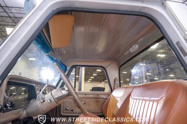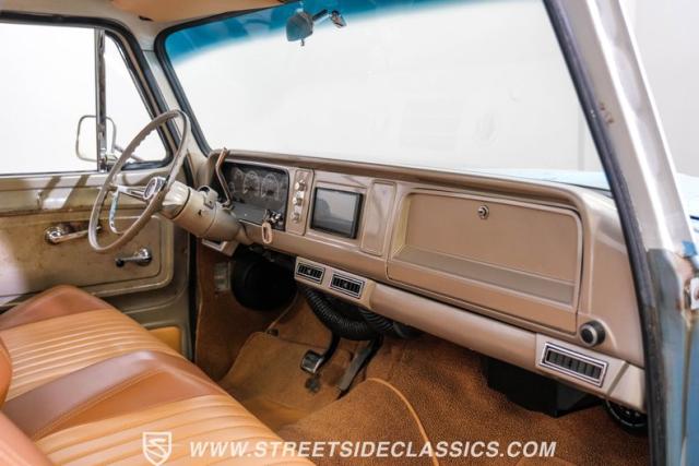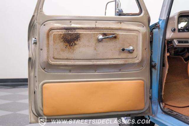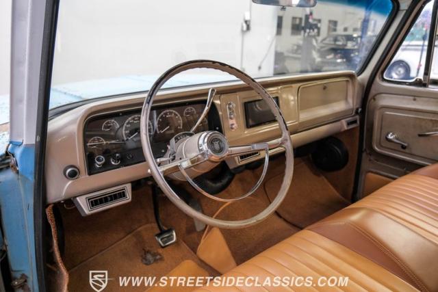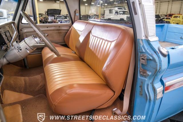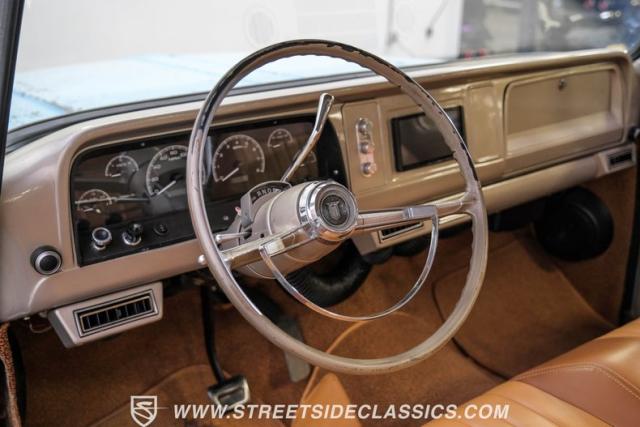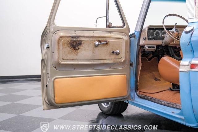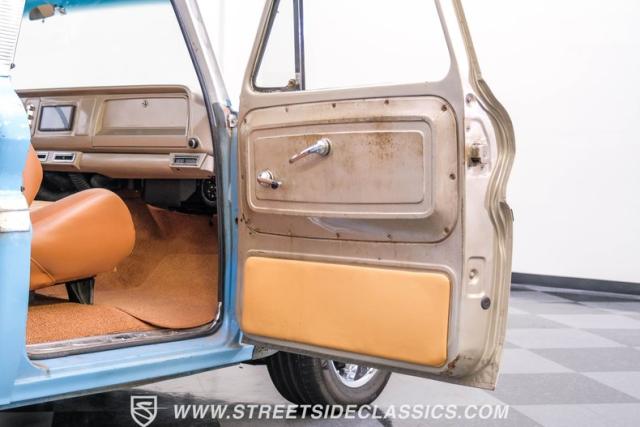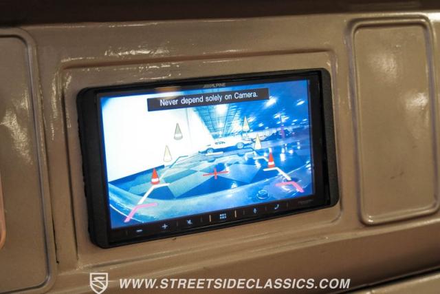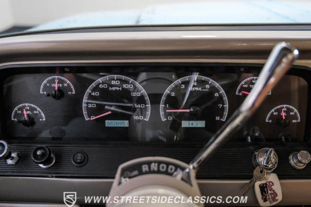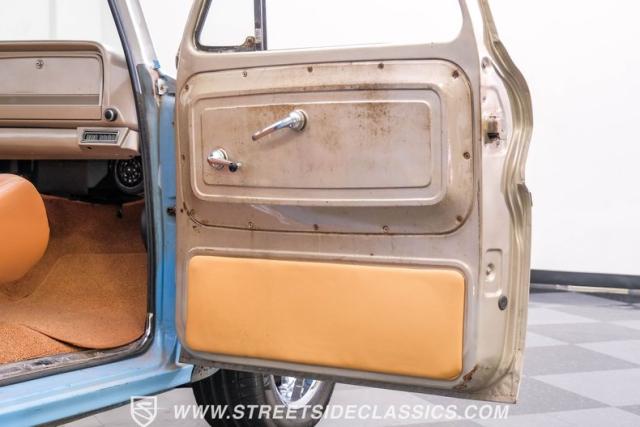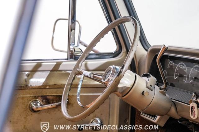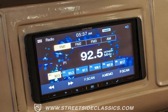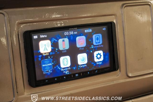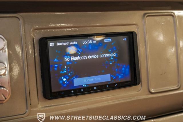 Inside, the mix of classic and contemporary continues. The custom contoured bench seat, wrapped in tan vinyl, pairs perfectly with the new carpet and painted dash. A Dakota Digital gauge cluster keeps you informed with modern precision, while the Alpine head unit, featuring AM/FM, satellite radio, Bluetooth, and auxiliary input, ensures you have the perfect soundtrack for every drive. The original steering wheel, showing its age, adds an authentic touch, while the aftermarket tilt column and seat belts enhance safety and comfort. Power steering and air conditioning further enhance the driving experience, ensuring ease and comfort.