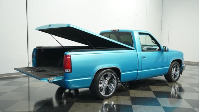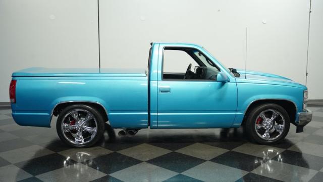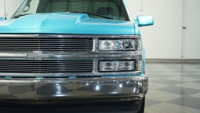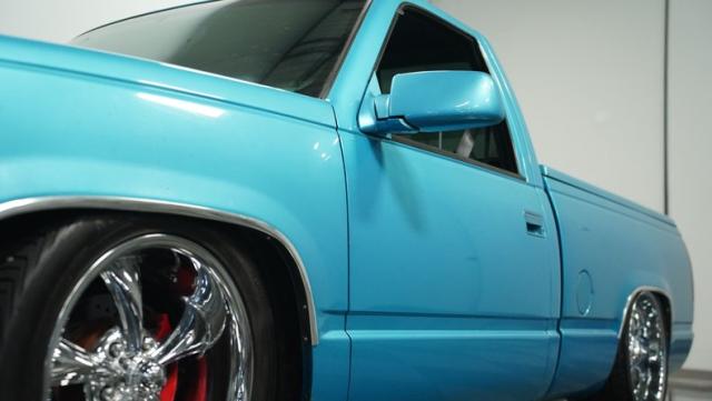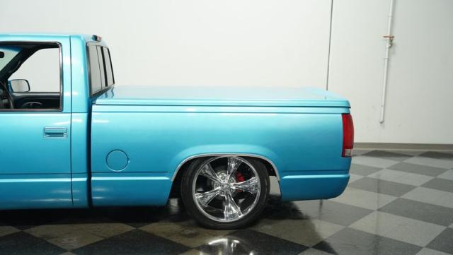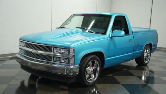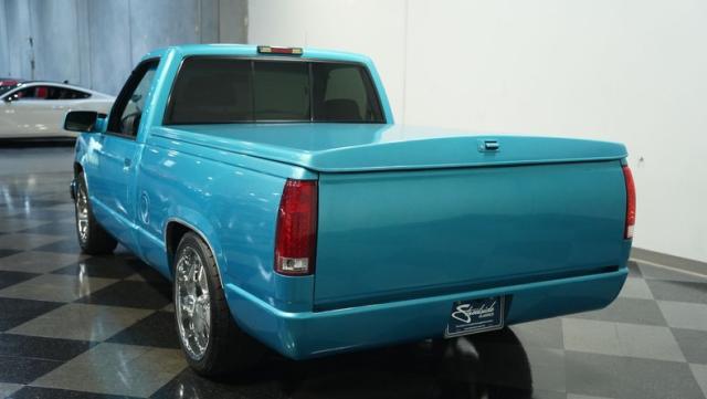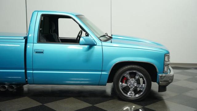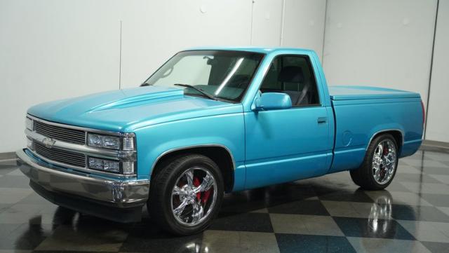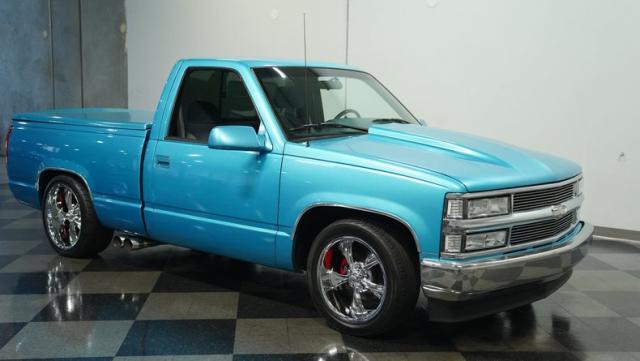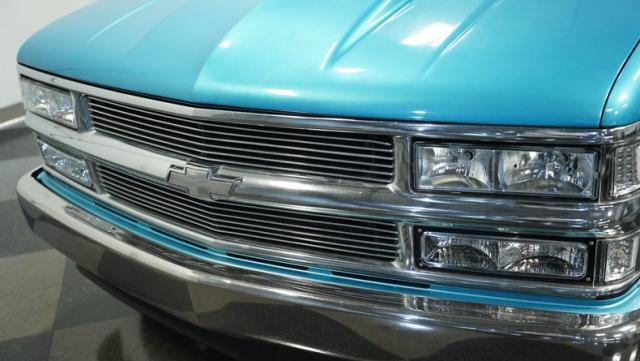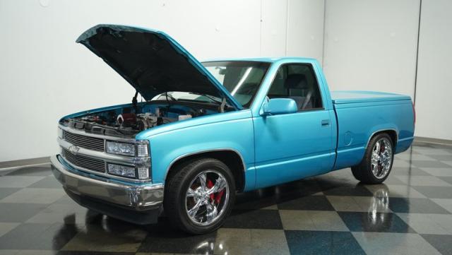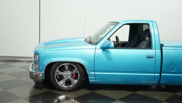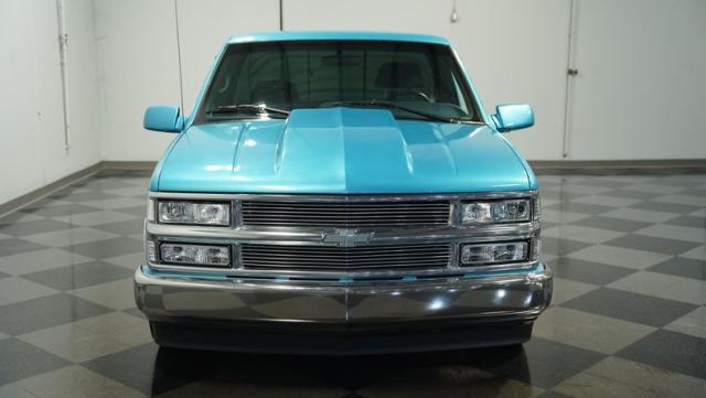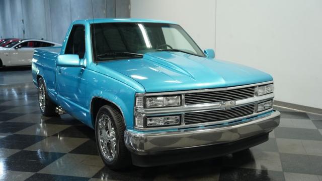 This 1995 Chevrolet C1500 Silverado isn\'t your average \'90s pickup. It\'s a street-smart fusion of classic Chevy muscle and modern customization. The Light Quasar Blue Metallic paint job gleams in the sunlight, a fresh respray that gives this truck a renewed lease on life. Its aggressive stance comes courtesy of an air ride suspension, allowing you to drop it low or raise it up at will. The exterior upgrades are tasteful yet impactful - a cowl hood adds a muscular flair, while the smoothie front bumper, billet grille, and diamond lights create a sleek, modernized face. Rolling on 18\" Ridler wheels up front and 20\" in the rear, wrapped in 235/50ZR18 and 275/40ZR20 rubber respectively, this C1500 has both the look and the grip to dominate the streets.