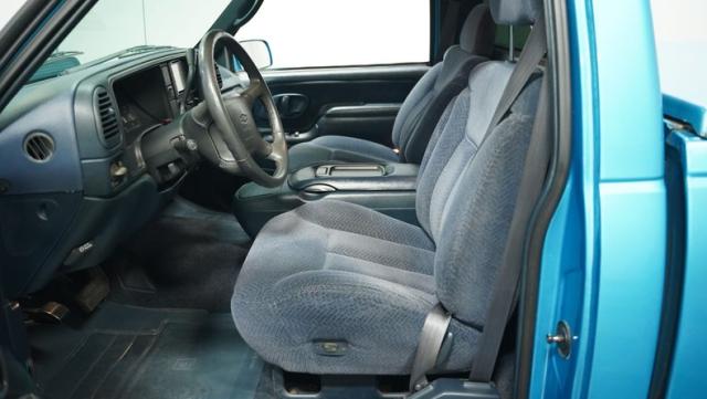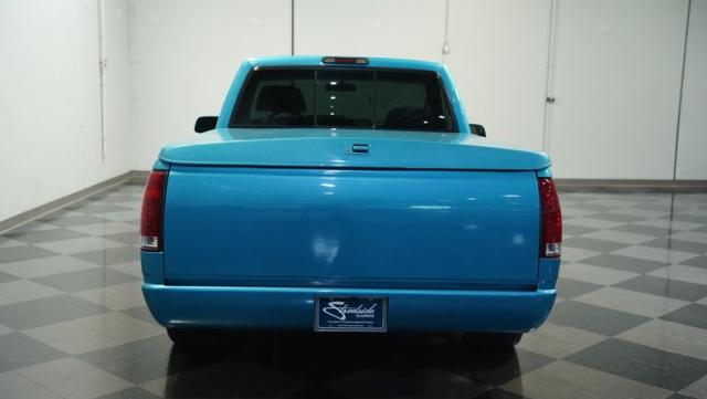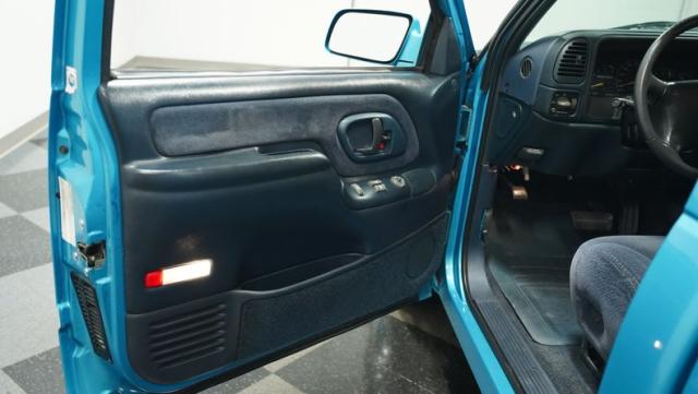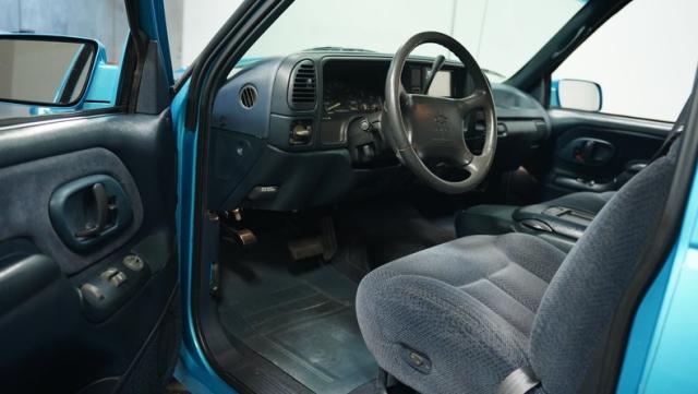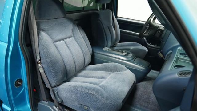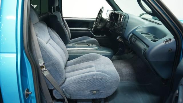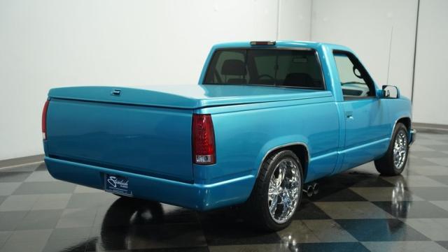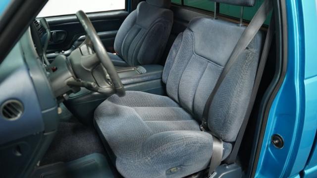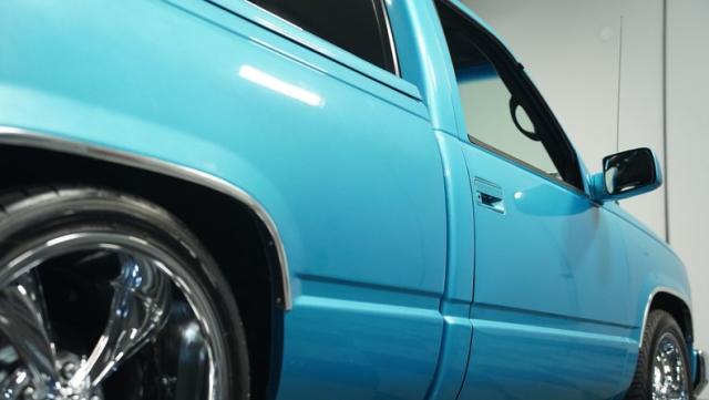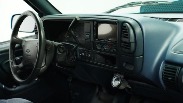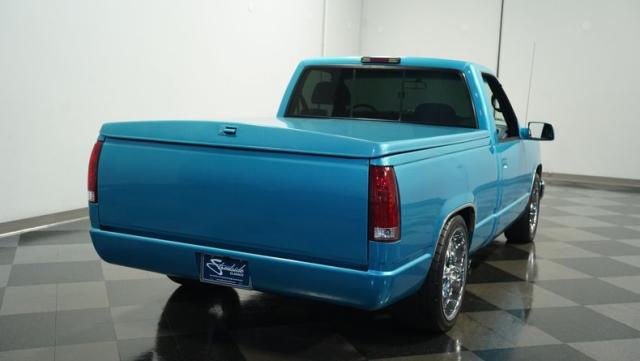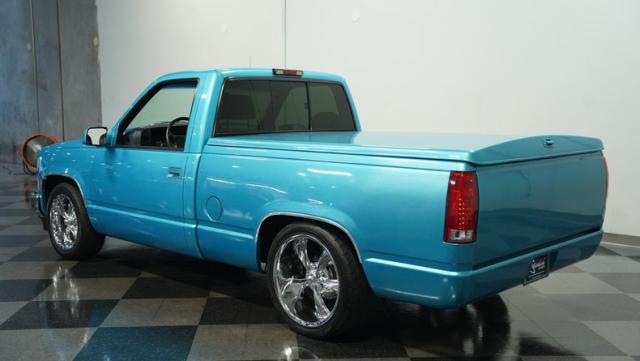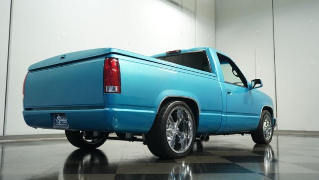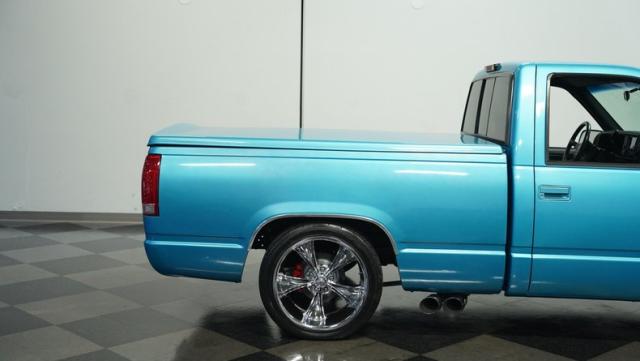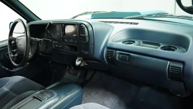 This 1995 Chevrolet C1500 Silverado isn\'t your average \'90s pickup. It\'s a street-smart fusion of classic Chevy muscle and modern customization. The Light Quasar Blue Metallic paint job gleams in the sunlight, a fresh respray that gives this truck a renewed lease on life. Its aggressive stance comes courtesy of an air ride suspension, allowing you to drop it low or raise it up at will. The exterior upgrades are tasteful yet impactful - a cowl hood adds a muscular flair, while the smoothie front bumper, billet grille, and diamond lights create a sleek, modernized face. Rolling on 18\" Ridler wheels up front and 20\" in the rear, wrapped in 235/50ZR18 and 275/40ZR20 rubber respectively, this C1500 has both the look and the grip to dominate the streets.