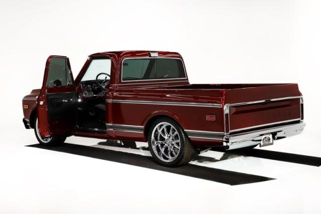EXTERIOR: The exterior has a jaw-dropping finish that looks like a piece of wet, hard candy. Beautiful burgundy metallic, the paint glows with depth and richness, and the clear coat has been polished to a glass-smooth shine. The metallic is laid out evenly across every panel, producing crisp highlights and a liquid appearance that truly sets this truck apart. Equally impressive is the bodywork. The panels are laser-straight with no signs of rust, damage, or waviness, and the fit is excellent throughout. Doors, hood, and bed all align properly. The brightwork appears to be replaced, including the deluxe side moldings, vent window frames, grille, bumpers, emblems, mirrors, and marker lights. It even features new smoked glass and fresh weatherstripping throughout for a clean, finished look. Completing the stance is a set of 20 inch Riddler wheels wrapped in Michelin Pilot Sport All-Season performance tires.