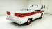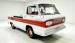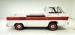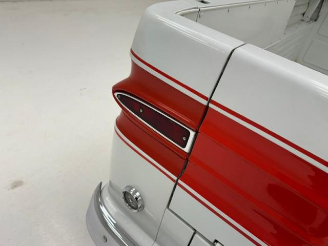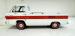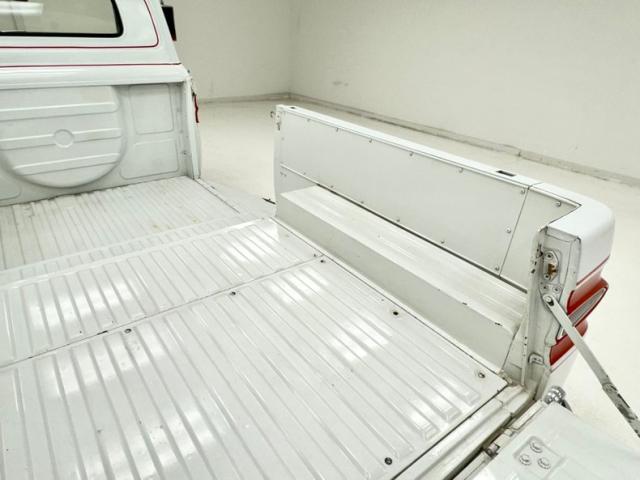 At first glance this pickup would appear to be a cab over, or cab forward design with the flat front and bog panoramic glass resting above the central grille and dual horizontal headlights in the oval bezel. But ALAS that engine, it\'s in the back. This flat front is painted mostly in Ermine White with the grille and headlights surrounded by Ember Red which has a thin pinstripe on either edge. This thins out a bit, and as it wraps around the sides it goes through the doors and bedsides, just about mid truck. The paint is chipped in a few areas and has been applied thick and the gaps are nicely minded and large mirrors rehanging off of either side. The bed is nice and long, all steel and has some storage boxes also in steel showing on either wheel rear wheel well. The bed is painted Ermine White and looks good. On the passenger\'s side is a fold down ramp that allows access to the bed for a lawn tractor or whatever needs a bit of a push to get on the ramp then on to the bed. The back of the truck has the arrowhead pointed outward tail lights all in the red striping, and a shiny bumper below. Ember Red 14-inch steel wheels have a central chromed moon cap with a bowtie badge and are wrapped in thin whites from 1990.