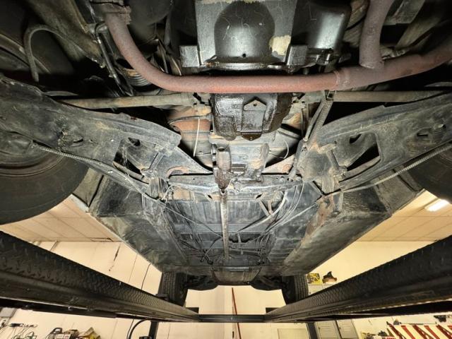 Up on the lift is an unrestored undercarriage which shows some patina with the black paint and a bit of surface rust peppering the surfaces under here. The exhaust pipe and muffler has heavier surface rust. Most of the undercarriage framing is covered in steel panels painted black showing some wear and plenty of small factory drilled divots. Independent coil springs for the front, and independent swing axle with trailing arms and torsion bars are on for the back to hold extra weight. Drum brakes are on all 4 corners.