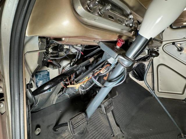 A swing of the wheel well notched doors shows us some gold painted steel panels for the edges, uppers and lowers. In the center is a white painted steel panel, which houses the actuator, and cranks as well as a red and white vinyl covered small armrest. As we move inside, a long bench stretches from door to door, and has neat mid 60\'s zig zag pattern broadcloth inserts in shades of green and brown with the seat uppers and bolsters are in red vinyl. There is also a delineating stripe in white between the broadcloth and vinyl and its in vinyl as well. A factory white steering wheel fronts the dash, and this dash has a dual oval design with the instrument cluster in aluminum and horizontal speedo and flanking knobs and pulls and turn signal indicators. Just right of center is the climate control sliders and where the keys hang the gold is scratched off. In the dash center is the ash receptacle and a box housing the Delco bowtie badged AM radio. In front of the passenger is a corresponding to the instrument oval glovebox door in brushed aluminum. Rubber flooring covers the floors and is nearly perfect. A long shifter reached for the driver, and looking above we see a steel framed headliner with an insert with some perforations in melamine board painted gold as well.