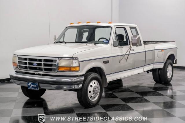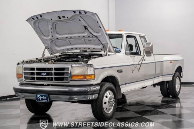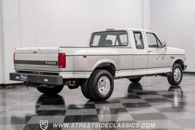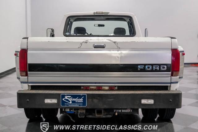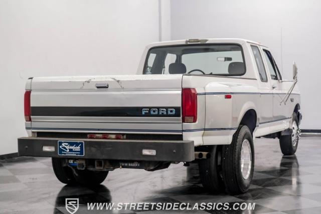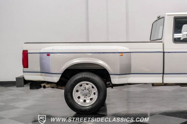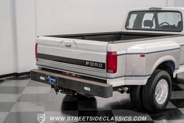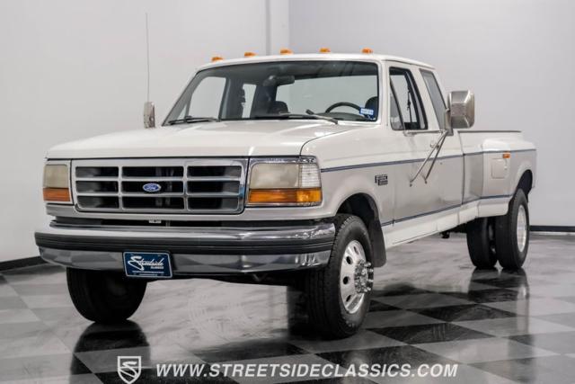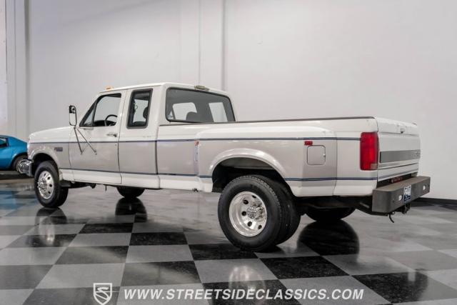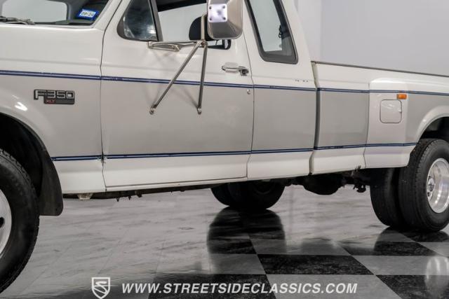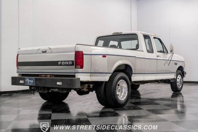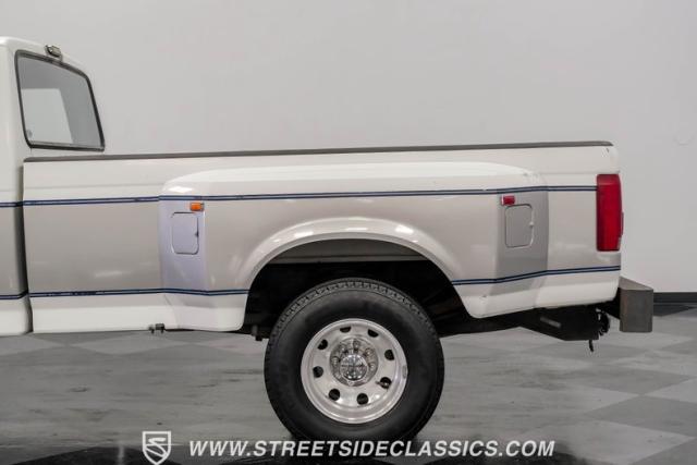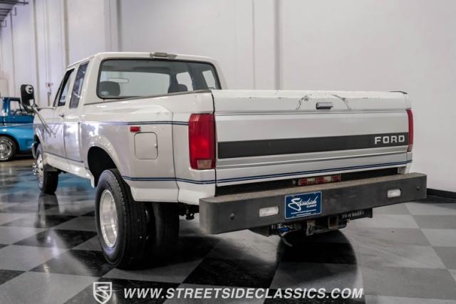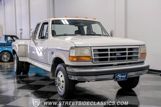 This 1992 Ford F-350 XLT Dually boasts a unique history - it once served on an airfield, pulling aircraft around the flight line. The Oxford White and gray two-tone paint scheme gives this workhorse a bold presence on the road. Riding on 16\" Alcoa wheels wrapped in 215/85R16 tires, this F-350 stands ready for heavy-duty tasks. The custom rear bumper with a class 5 hitch and Teknsha electronic brake control underscore its towing capabilities.