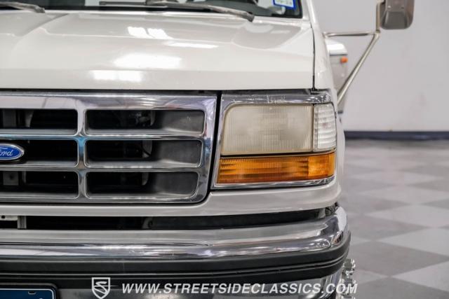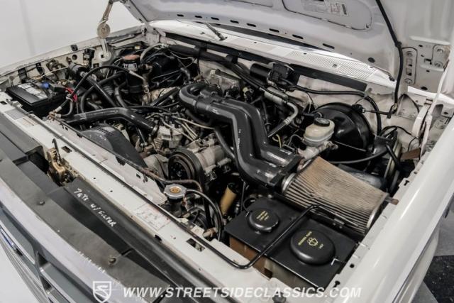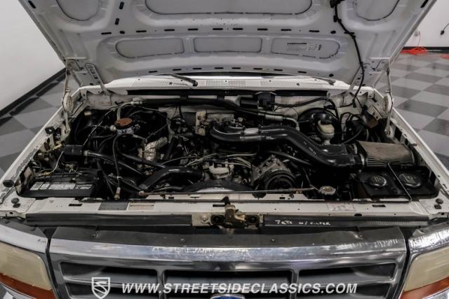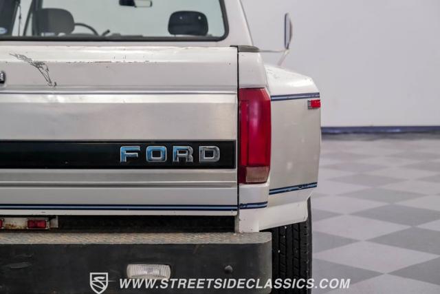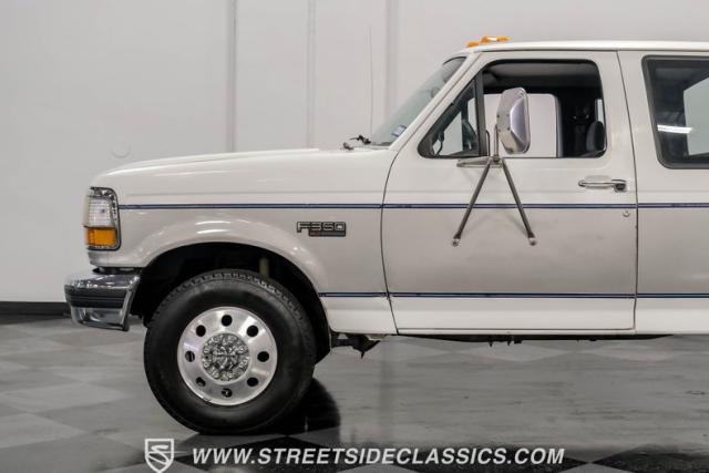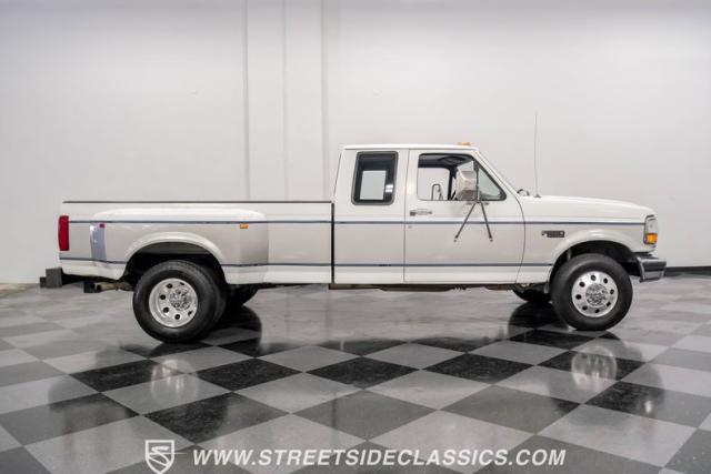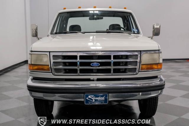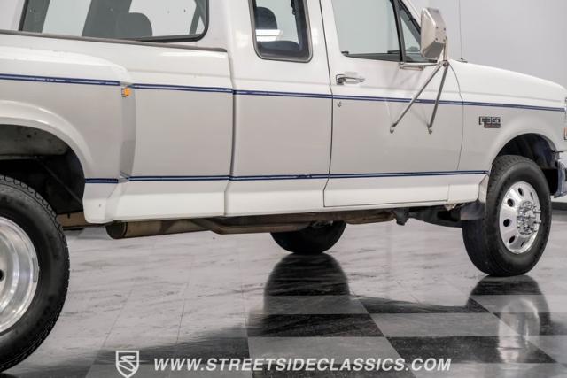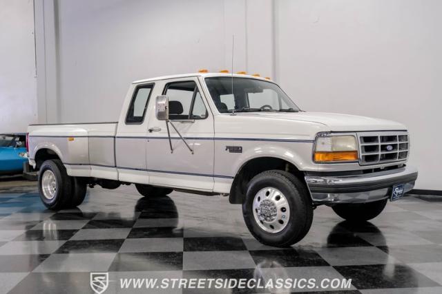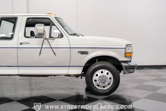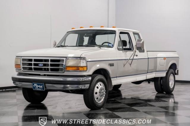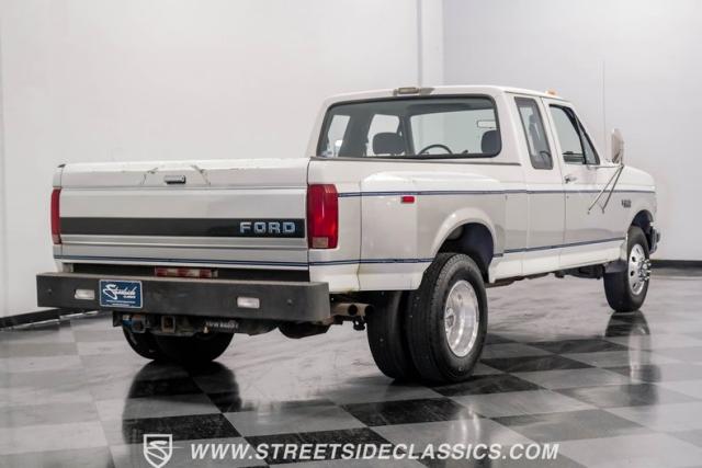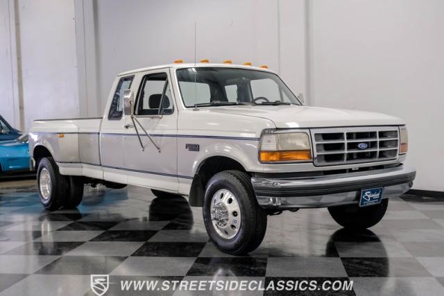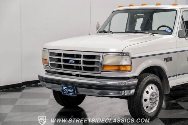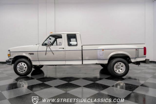 This 1992 Ford F-350 XLT Dually boasts a unique history - it once served on an airfield, pulling aircraft around the flight line. The Oxford White and gray two-tone paint scheme gives this workhorse a bold presence on the road. Riding on 16\" Alcoa wheels wrapped in 215/85R16 tires, this F-350 stands ready for heavy-duty tasks. The custom rear bumper with a class 5 hitch and Teknsha electronic brake control underscore its towing capabilities.