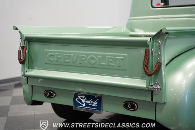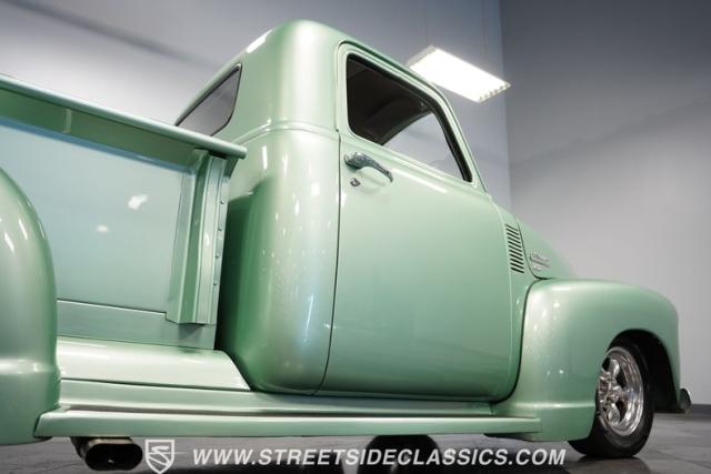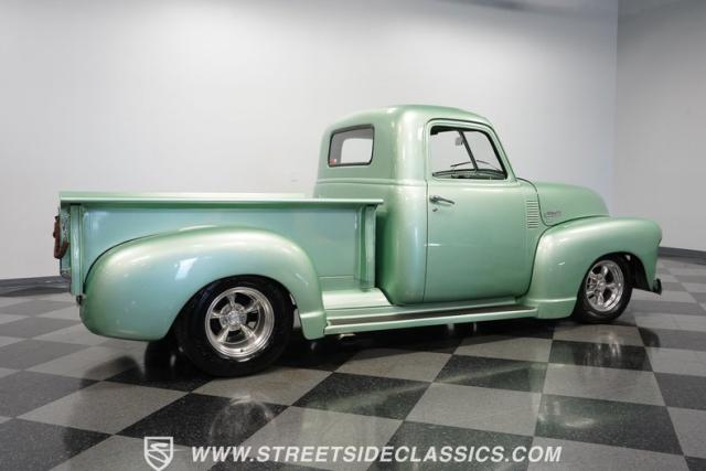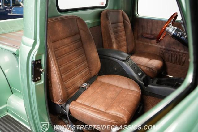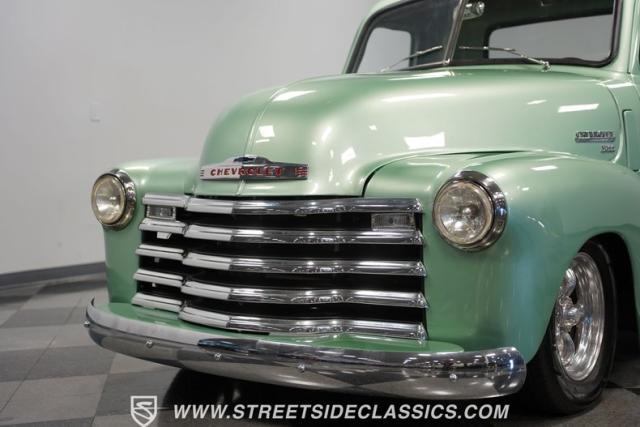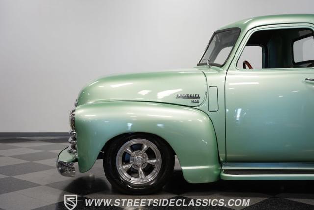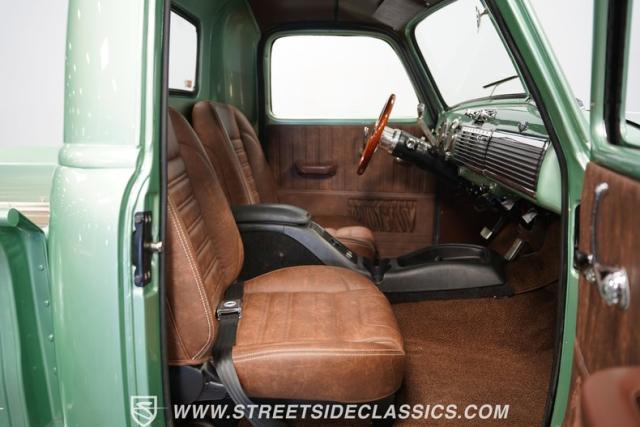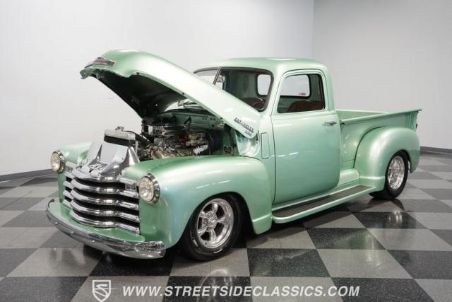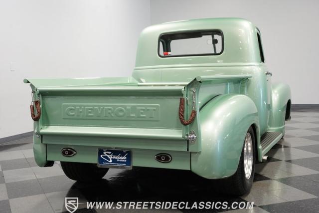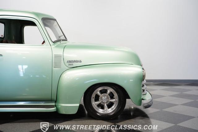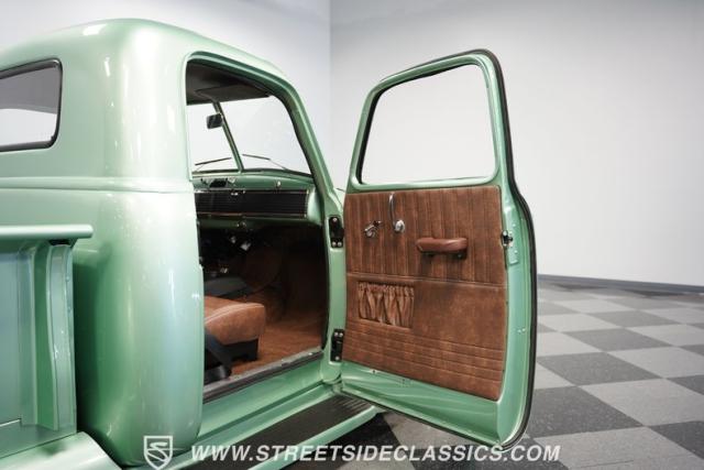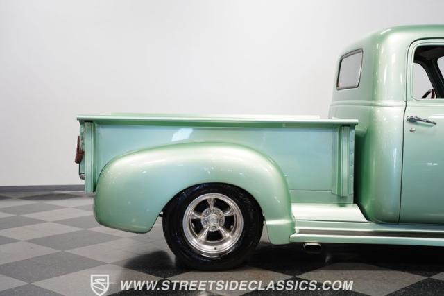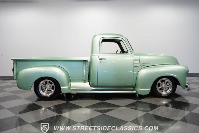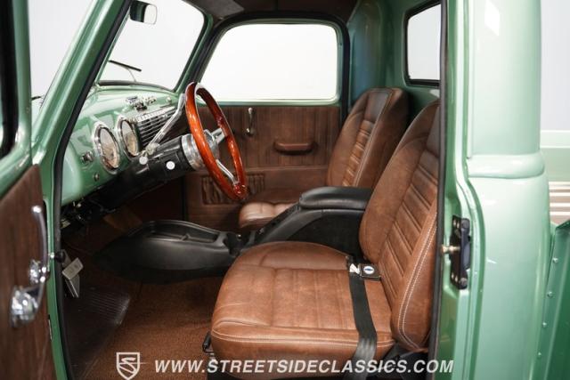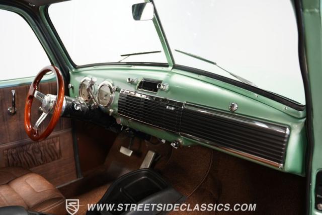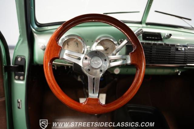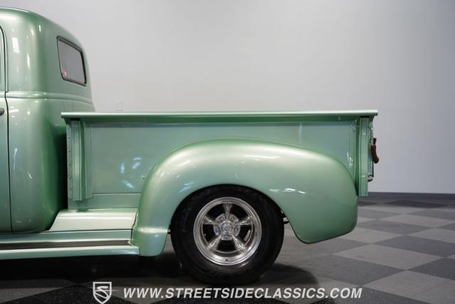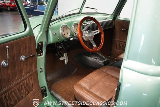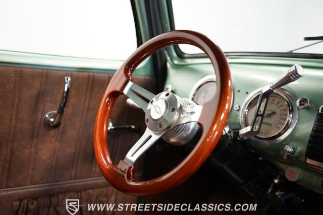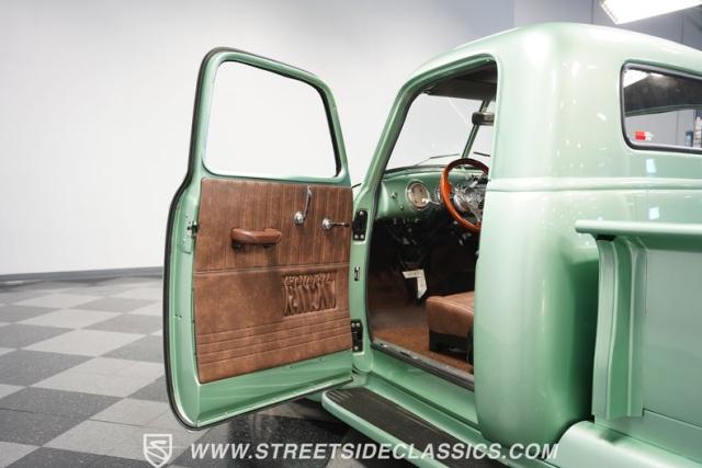 The owner spent four years crafting this 1949 Chevrolet 3100 into a stunning custom build. The pearl metallic Mint Green finish perfectly accentuates the classic lines of this vintage pickup. American Racing 15-inch wheels wrapped in 215/65R15 front and meaty 275/60R15 rear tires give this truck an authoritative stance. Custom touches include a raised wooden bed with polished stainless inserts, fiberglass rear fenders, and a sleek rolled rear pan with custom taillights. Chrome details on the front bumper, grille, and emblems provide brilliant contrast, while brown leather-wrapped tailgate chains add an unexpected custom touch.