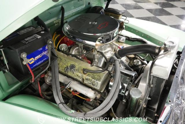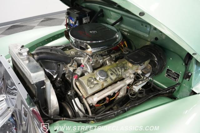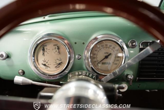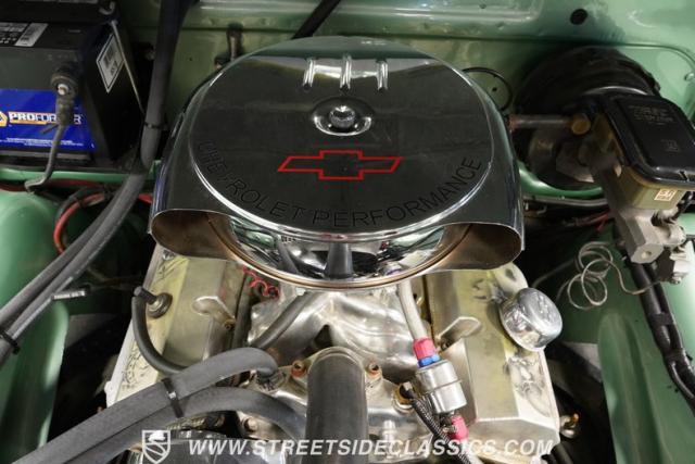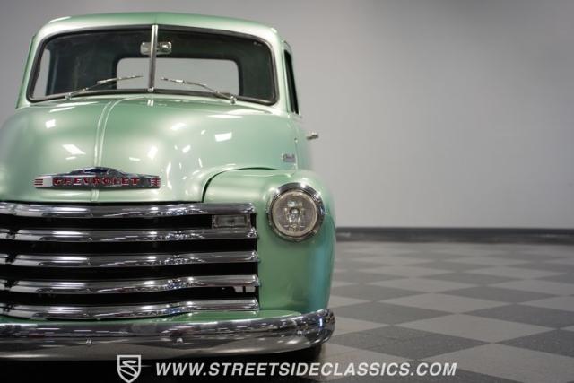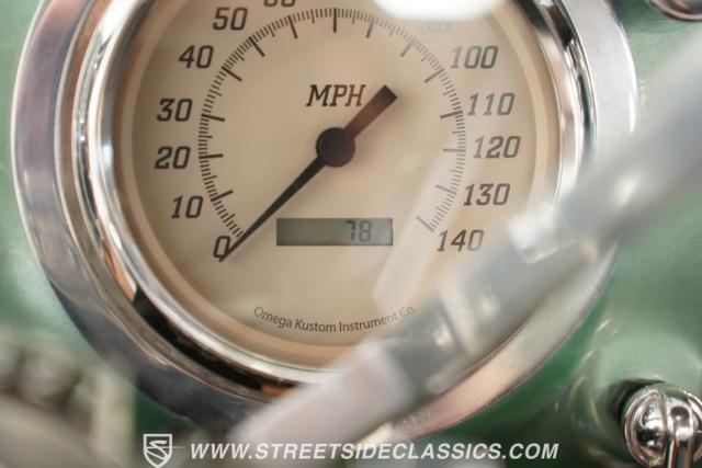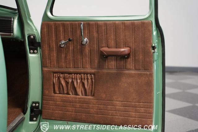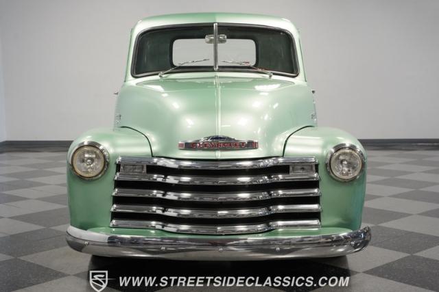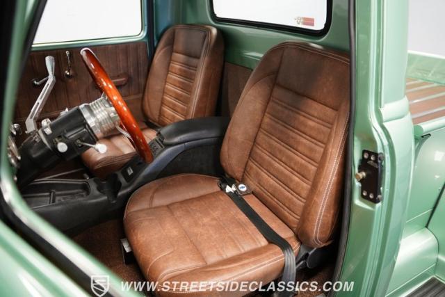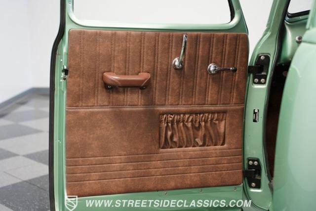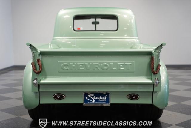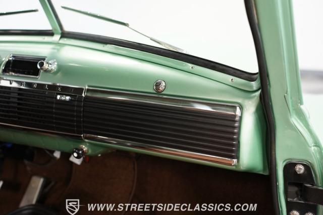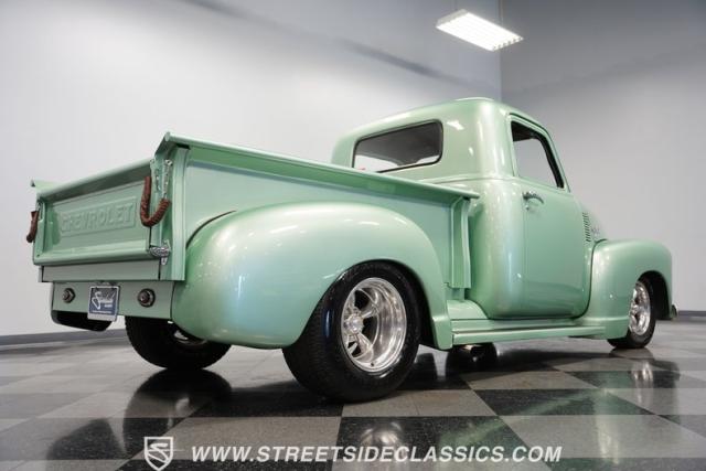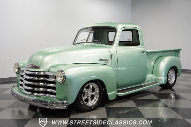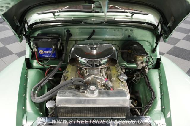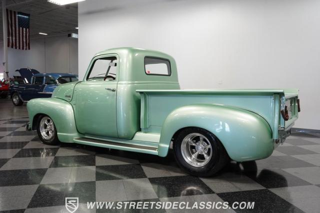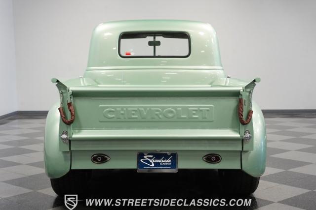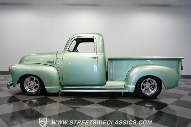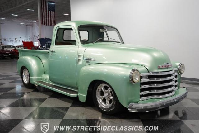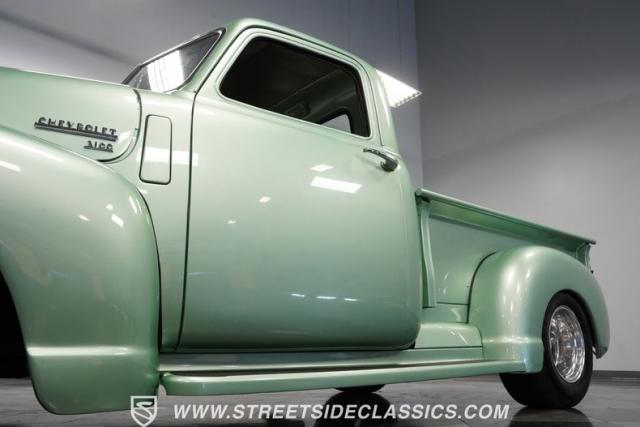 The owner spent four years crafting this 1949 Chevrolet 3100 into a stunning custom build. The pearl metallic Mint Green finish perfectly accentuates the classic lines of this vintage pickup. American Racing 15-inch wheels wrapped in 215/65R15 front and meaty 275/60R15 rear tires give this truck an authoritative stance. Custom touches include a raised wooden bed with polished stainless inserts, fiberglass rear fenders, and a sleek rolled rear pan with custom taillights. Chrome details on the front bumper, grille, and emblems provide brilliant contrast, while brown leather-wrapped tailgate chains add an unexpected custom touch.