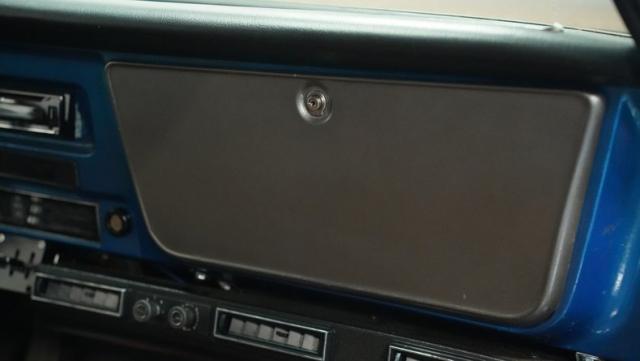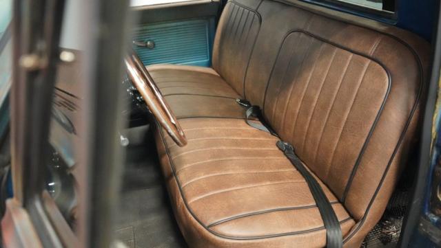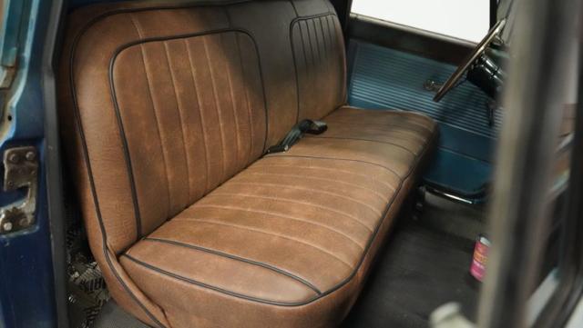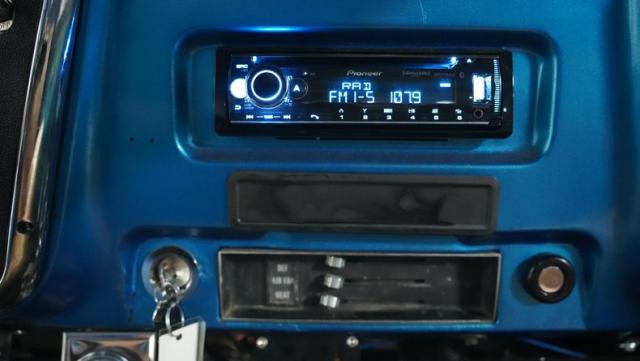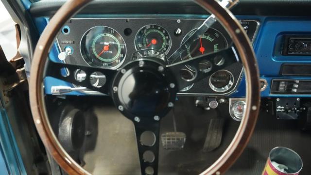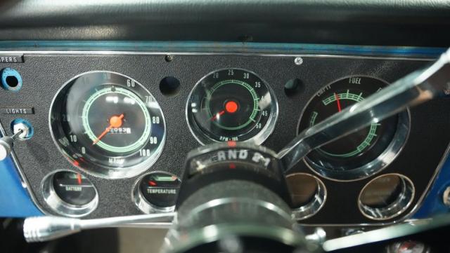 The interior features a nicely upholstered and comfortable bench seat, Pioneer AM/FM/CD/AUX/Bluetooth radio, cold Vintage air conditioning, tilt steering column, wood-grain steering wheel and crisp, clean factory-style reproduction tachometer and gauges, as well as a new OEM style gauge bezel assembly.