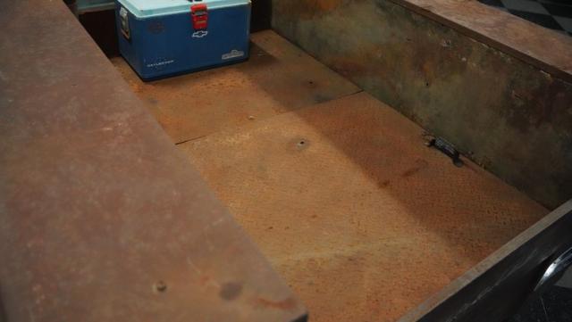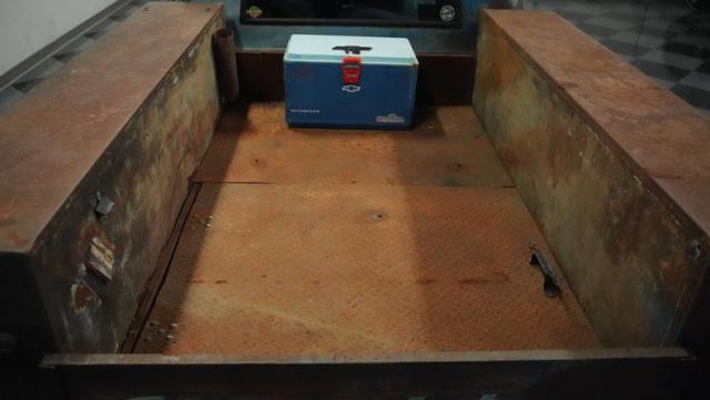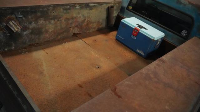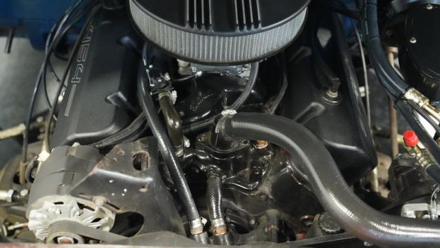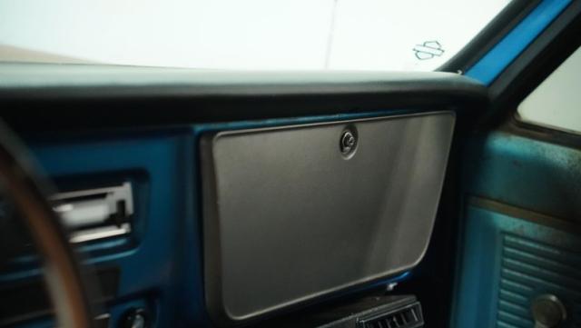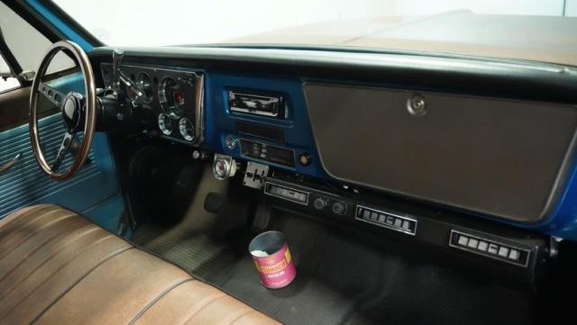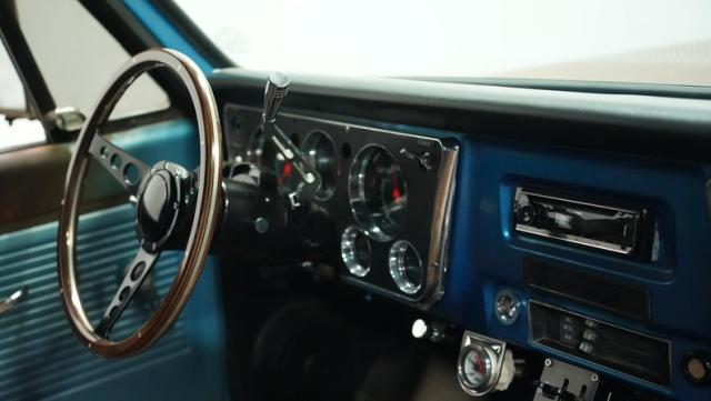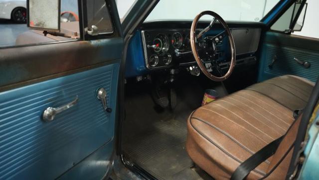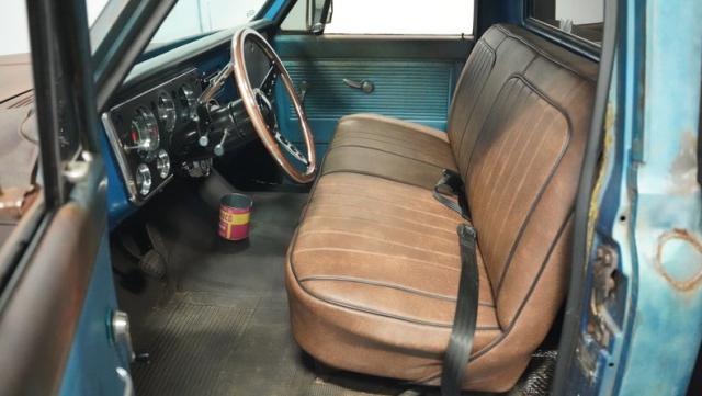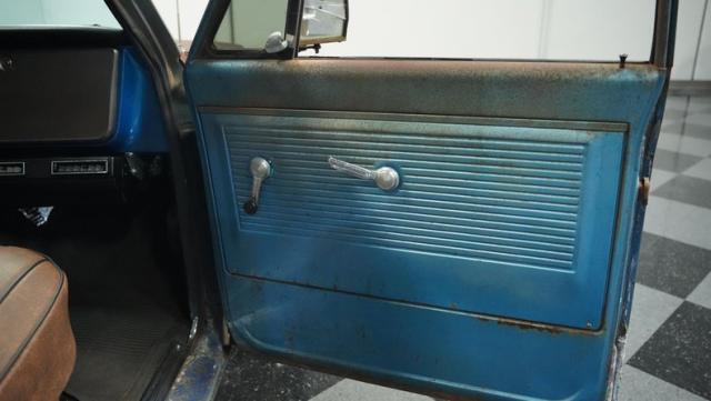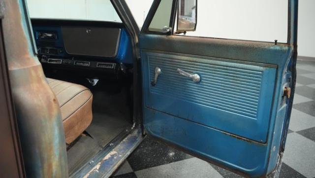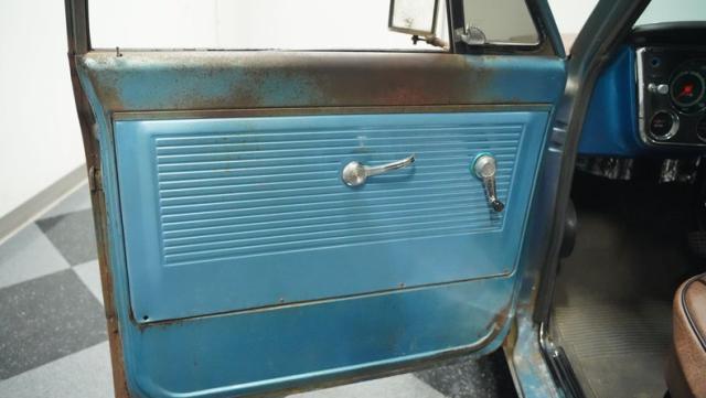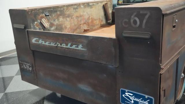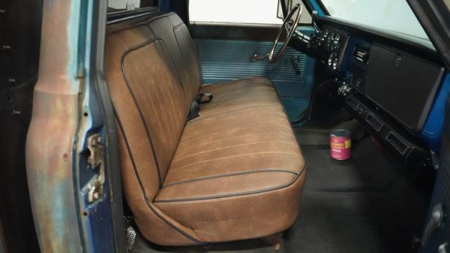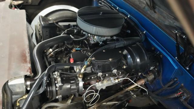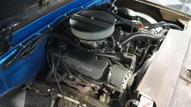 Under the patina finish hood is a healthy 454 big block engine mated to a TH400 automatic transmission that sends power back to a 12-bolt rear end. The engine features an Edelbrock intake, Holley carburetor, black open-element air cleaner, black aluminum valve covers with 454 logos, aluminum radiator, power steering, power brakes with front discs, and headers that flow back through a rumbling dual exhaust system with Flowmaster Flow FX mufflers.
