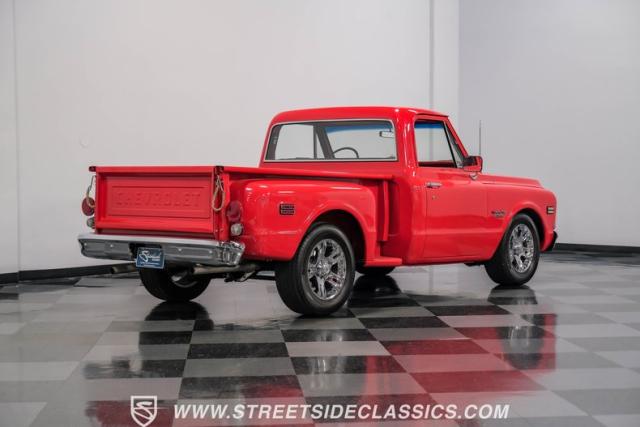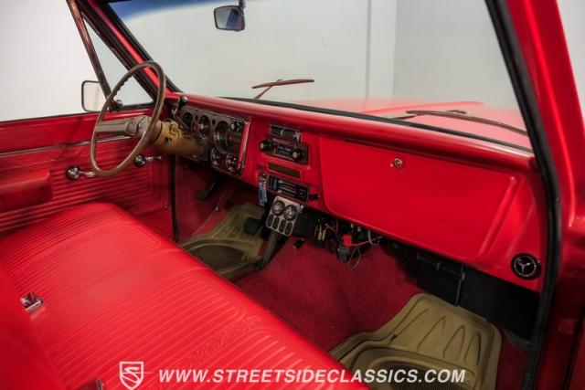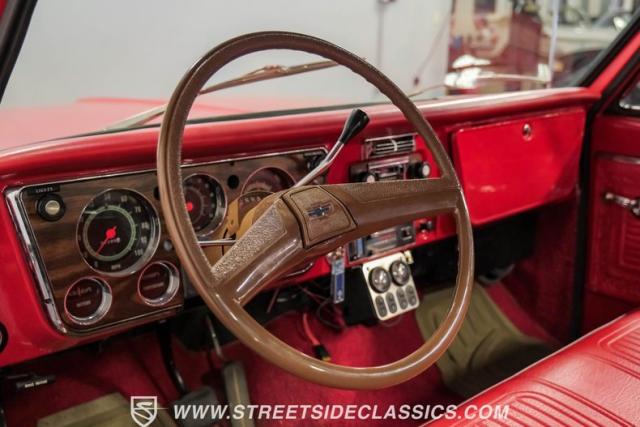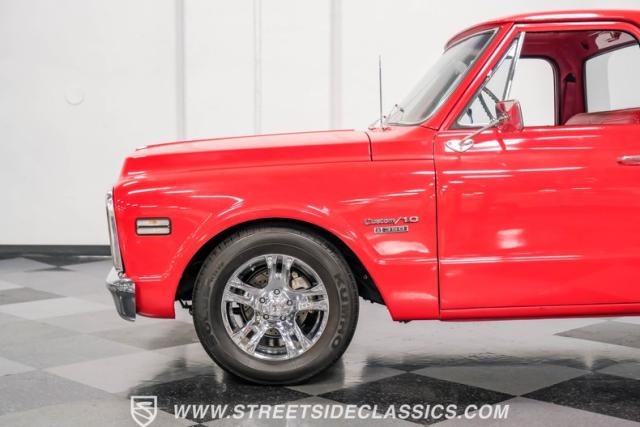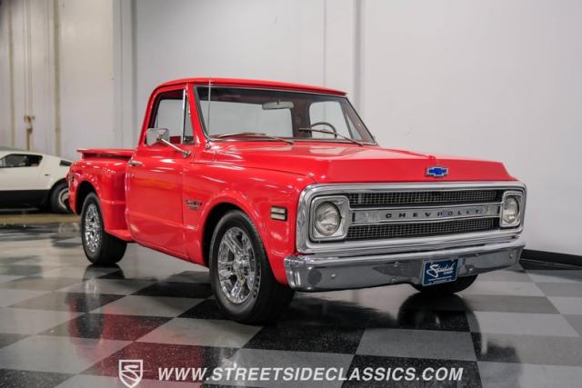 This 1969 Chevrolet C10 Stepside showcases a vibrant red exterior that exudes confidence accentuating the truck\'s classic lines and muscular profile. It rolls on 17-inch chrome wheels fitted with 255/60R17 tires, blending vintage aesthetics with modern road performance. The stepside bed features a rich wood floor, adding a touch of craftsmanship to the overall design.
