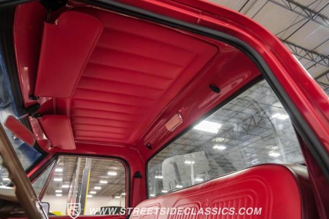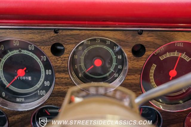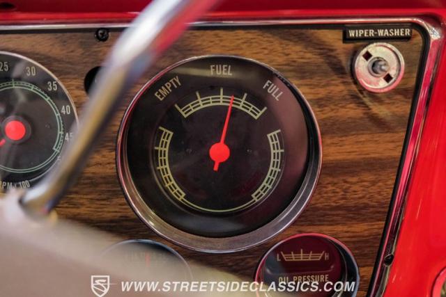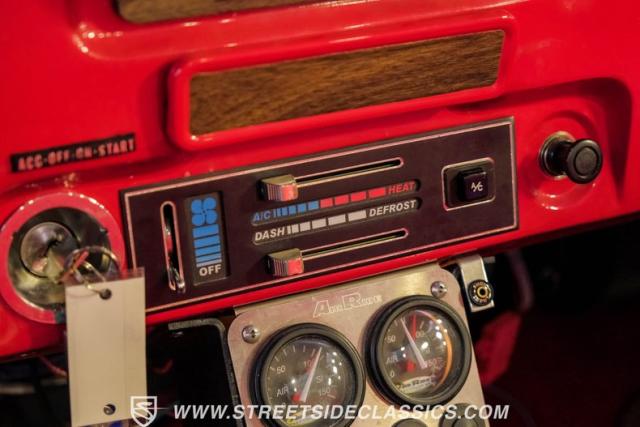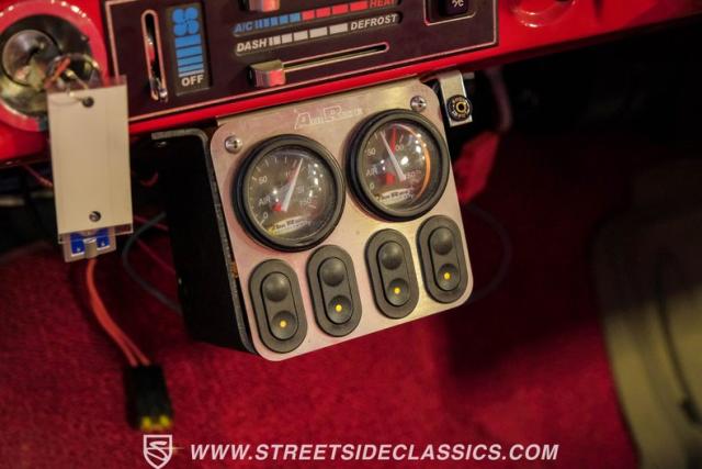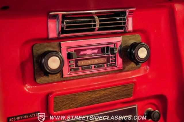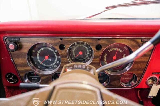 Inside, the cabin boasts a fresh red vinyl interior that complements the exterior. A spacious bench seat provides comfort for long drives, while the column shifter maintains a clean floor layout. The dash sports an attractive wood-grain finish, housing stock-style gauges and a retro AM/FM cassette player. Modern amenities include air conditioning with custom dash vents and power steering, enhancing the driving experience.
