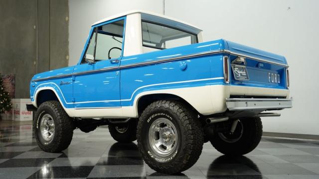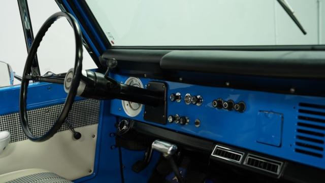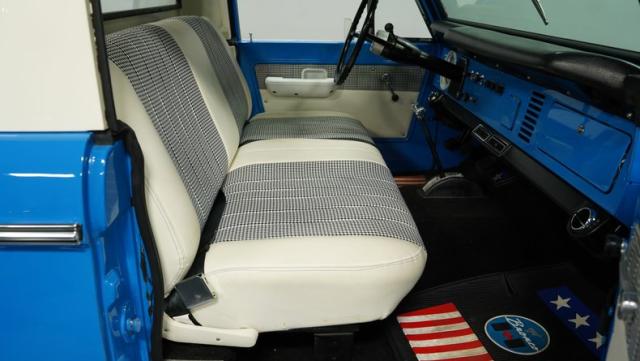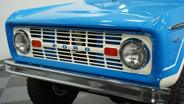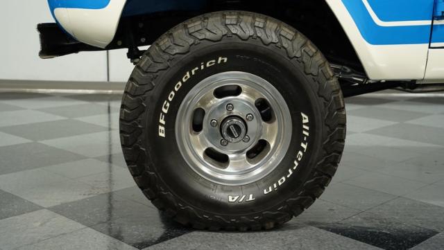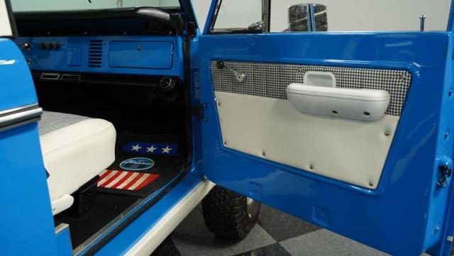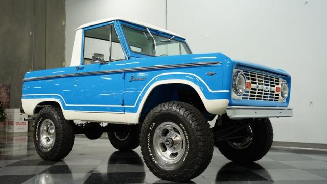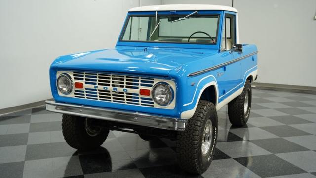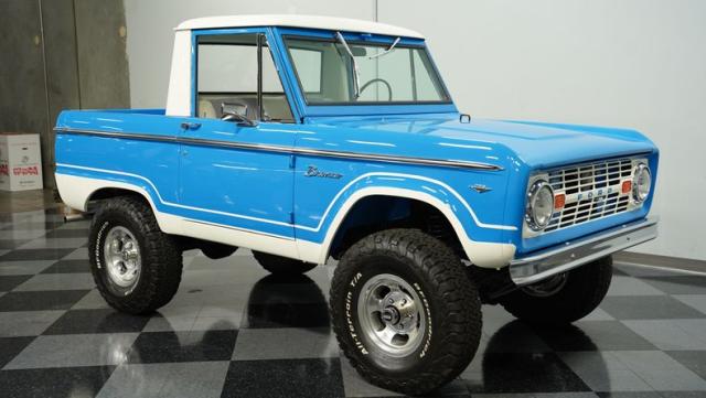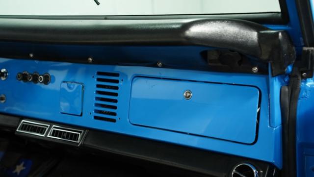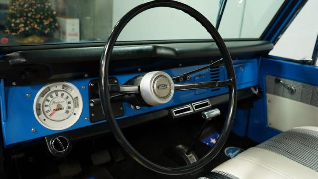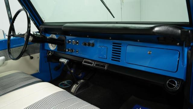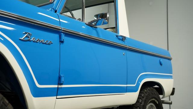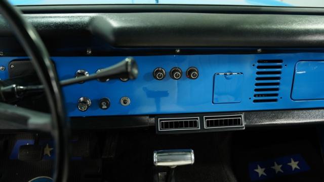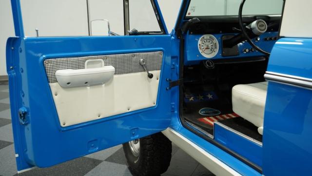 America\'s love affair with the classic Ford Bronco is like a timeless romance novel, and this 1968 Ford Bronco Half-Cab 4x4 is its latest, most thrilling chapter! Dressed in a charming Harbor Blue with sleek white stripes, this Bronco is the perfect blend of ruggedness and style. It\'s like seeing your high school sweetheart at a reunion familiar yet excitingly refreshed. The off-white hardtop, gleaming chrome finish, and aftermarket polished 15\" alloy wheels wrapped in BF Goodrich all-terrain tires add to its rugged yet polished appearance.