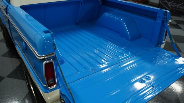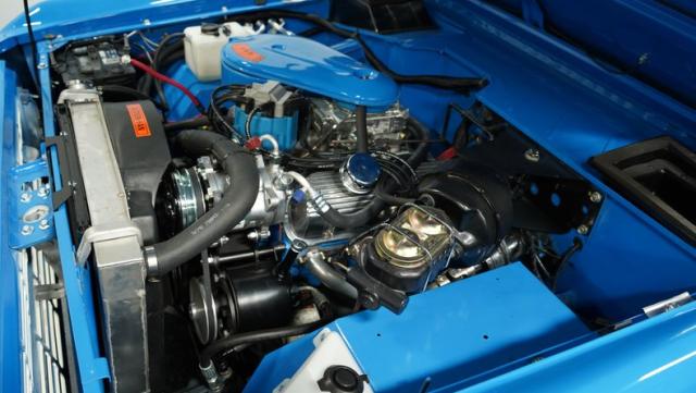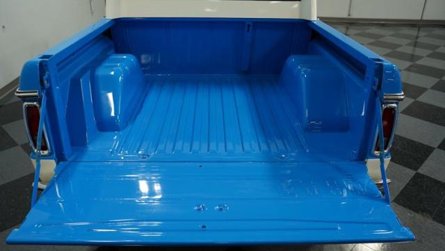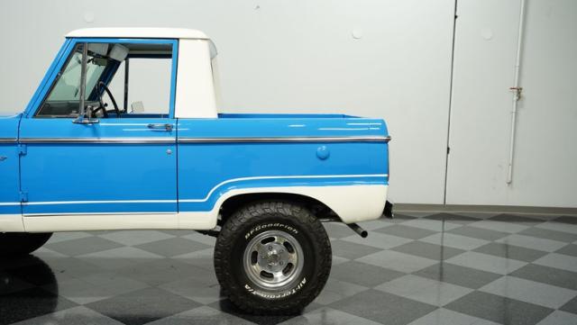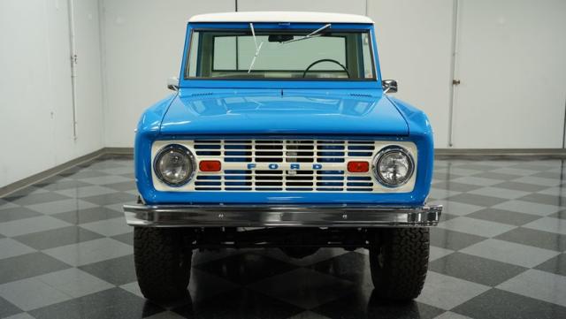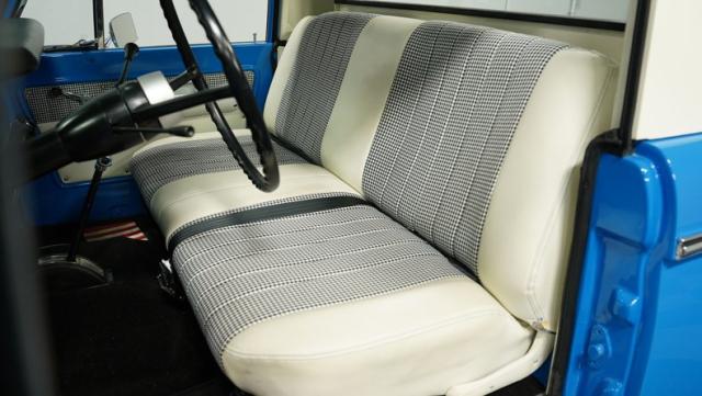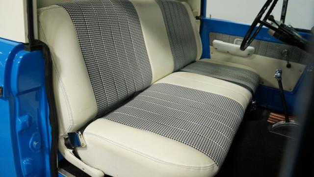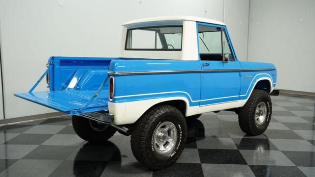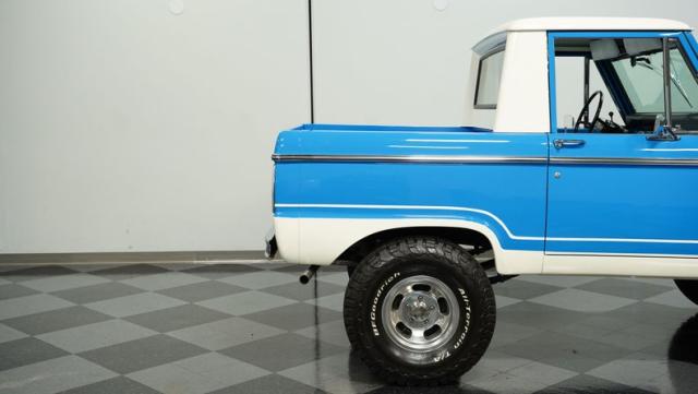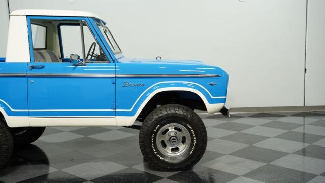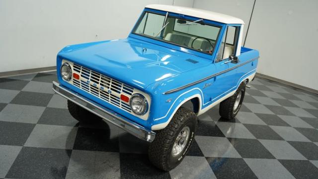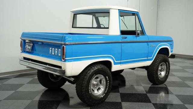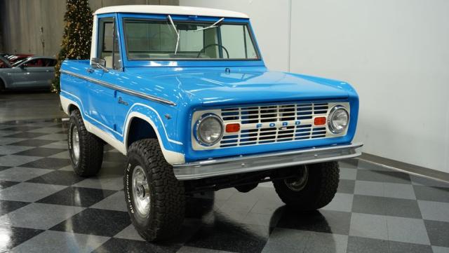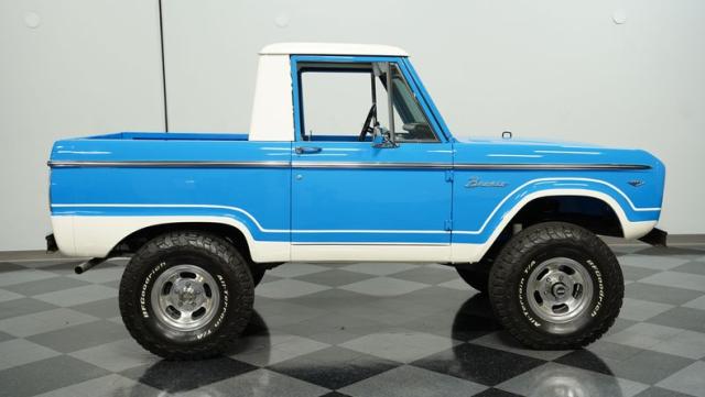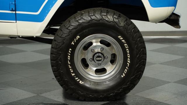 America\'s love affair with the classic Ford Bronco is like a timeless romance novel, and this 1968 Ford Bronco Half-Cab 4x4 is its latest, most thrilling chapter! Dressed in a charming Harbor Blue with sleek white stripes, this Bronco is the perfect blend of ruggedness and style. It\'s like seeing your high school sweetheart at a reunion familiar yet excitingly refreshed. The off-white hardtop, gleaming chrome finish, and aftermarket polished 15\" alloy wheels wrapped in BF Goodrich all-terrain tires add to its rugged yet polished appearance.