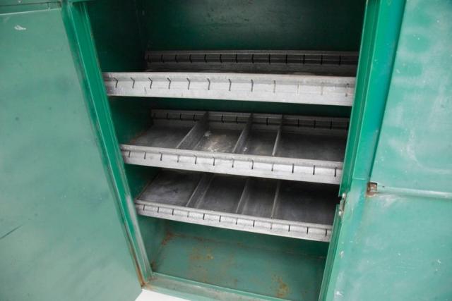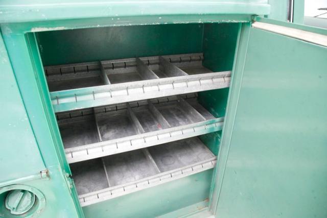 Call it Shamrock Green, Emerald Green or Eagles Green, whatever your name choice, it coats every corner of this utility body truck, and it appears for the most part to be the original finish. Fading, noted as heavier on the utility box, chips, scratches and poorly performed body work show throughout the body along with areas of invasive rust on the rockers, cab corners and insides of the door jambs. The original and still shiny chrome front bumper and bowtie dressed eggcrate grille with outboard single round headlights lead the way and the centrally peaked hood runs rearward to the black trimmed nice condition windshield. The hand painted lettering, which is original, is still showing proudly on the passengers door and makes an appearance again on the driver\'s side of the bed box. Speaking of the utility box, it\'s a Reading Body unit which is known for high quality builds that remain durable and can withstand the rigors of daily use. A multitude of storage compartments are seen on the box sides and when opened reveal shelving units as well as compartments to store your tools, hardware or damn near anything else your heart desires and ladder holders are noted on the passenger side of the box. Moving around back we shake hands with a quad of windowson the dual doors that swing open to allow us access to the walk in box. Inside we are met with a 1/8\" aluminum diamond plate floor and 3 rows of storage shelves per side. 16.5-inch standard steel wheels are on the 4\'s and are wrapped in tires that are old enough to deem replacing in the near future, although the tread remains in good condition. Standard bowtie badged dog dish caps are on for a little extra pizazz.