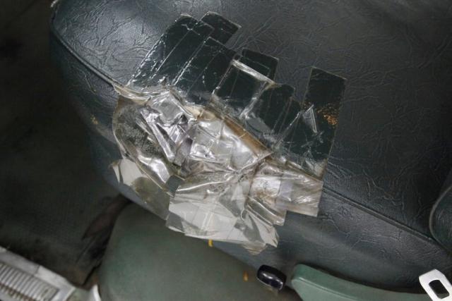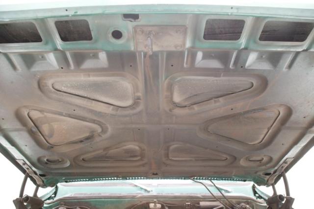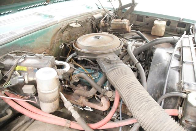 The originality continues on the inside with faded green plastic door panels thatpresent with ribbed horizontal inserts and chrome delineationmarkers. Shamrock Green steel surrounds the panels and some chrome for the cranks and actuators provides a nice dress up. Slipping inside, the factory dark green vinyl bench with its grain finish stretches door to door and shows with some hastily repaired tears withclear tape. The original dash with its faded green padded topper holds a bevy of factory black faced gauges all within a textured black panel and the factory black insert with knobs and heater/AC slides below along with the factory AM radio. The factory steering column is holding the black rimmed original steering wheel atop. Soiled, torn and faded light green rubber matting covers the floors and above is a utilitarian green steel headliner.