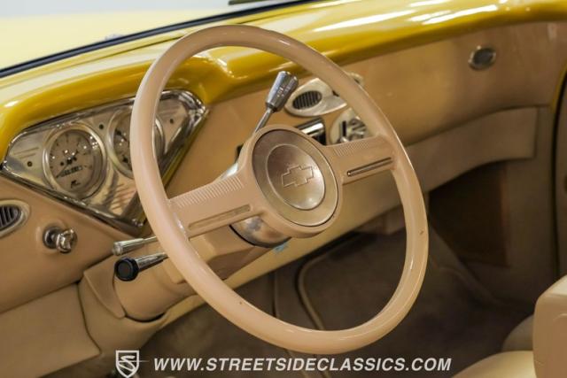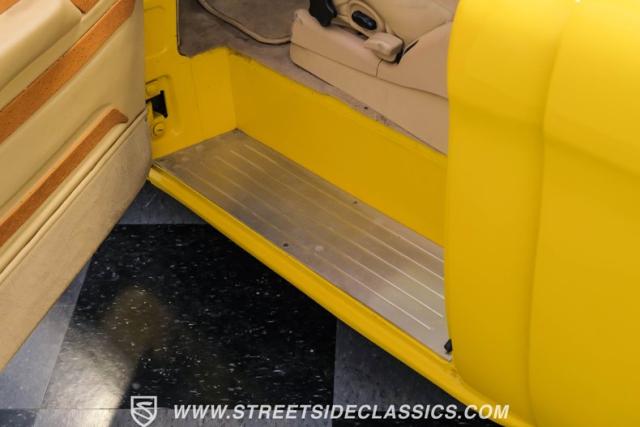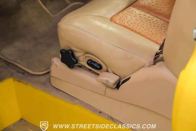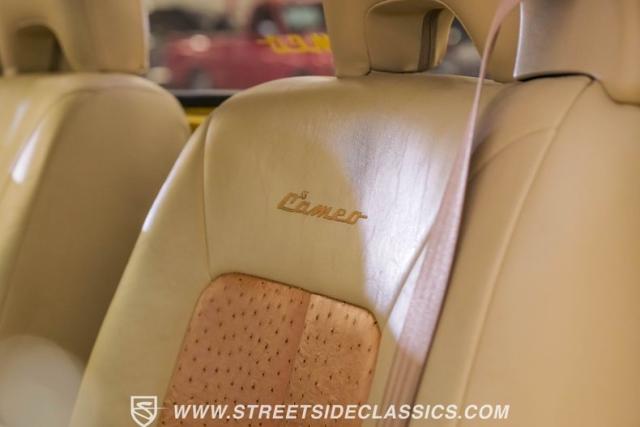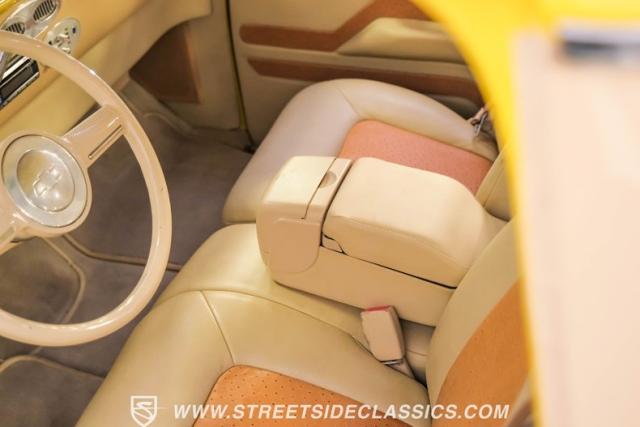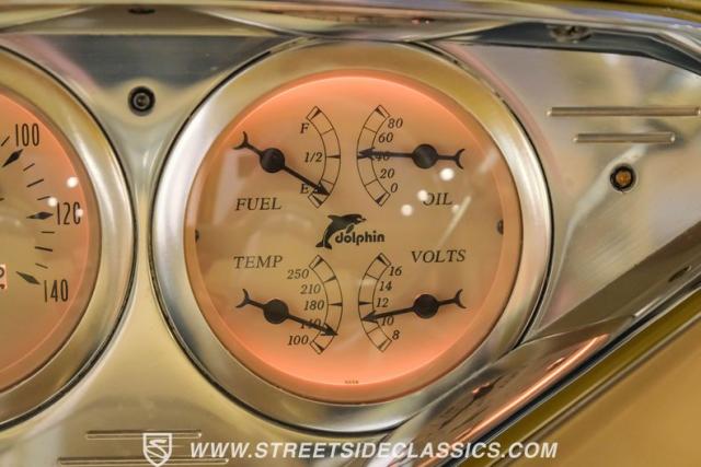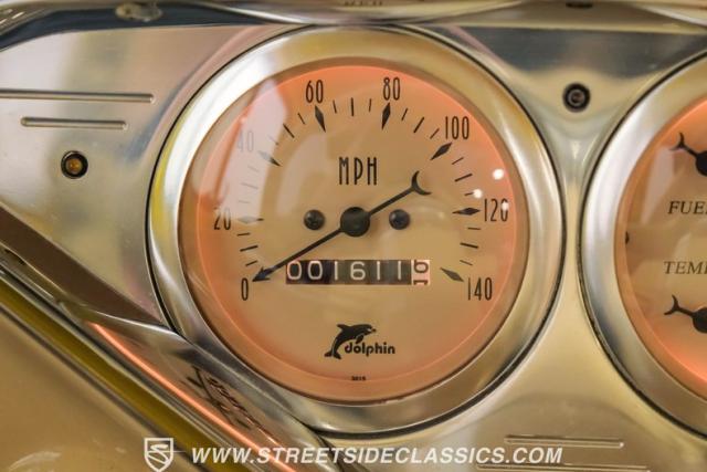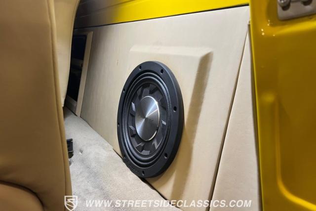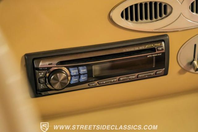 Inside, the cabin is a masterpiece of custom craftsmanship. Two-tone leather upholstery in beige and tan, accented with ostrich leather details, creates a luxurious environment. Power bucket seats with a folding armrest offer both comfort and style. The smoothed dash is the same complimenting beige from the exterior and houses a billet gauge cluster with Dolphin gauges, while a tilt column topped with a custom steering wheel puts control at your fingertips. An Alpine head unit, complemented by Xterminator Amps and a Pioneer sub behind the seat, provides a premium audio experience.