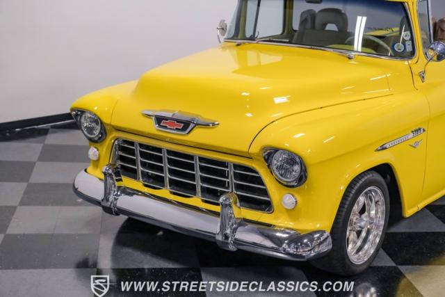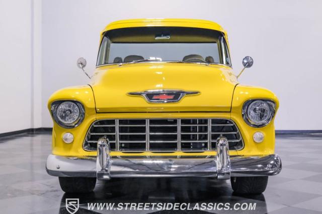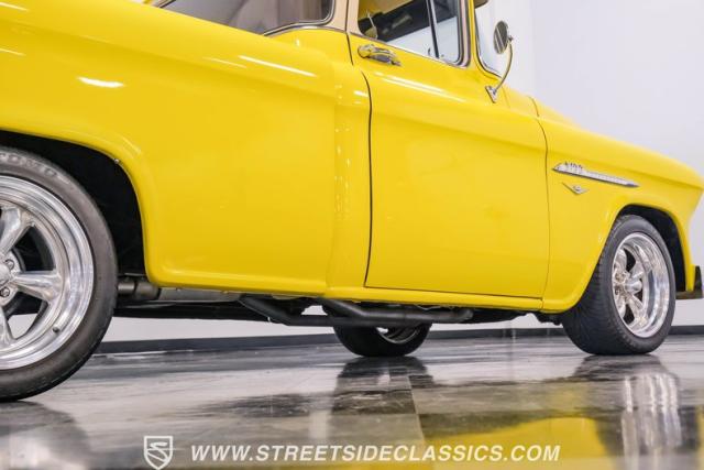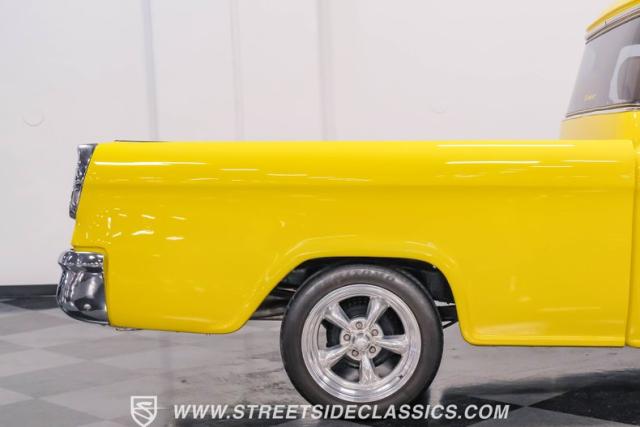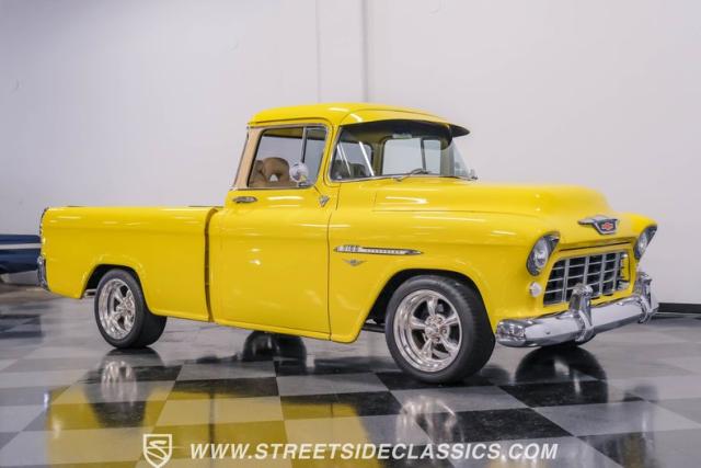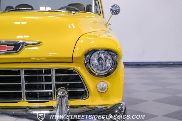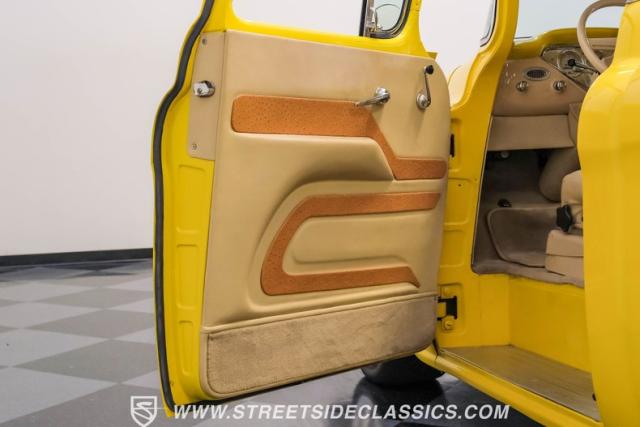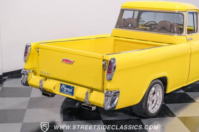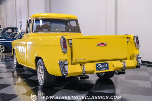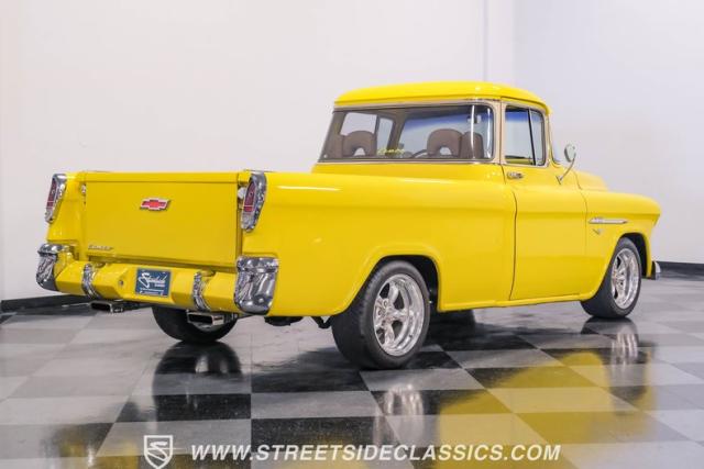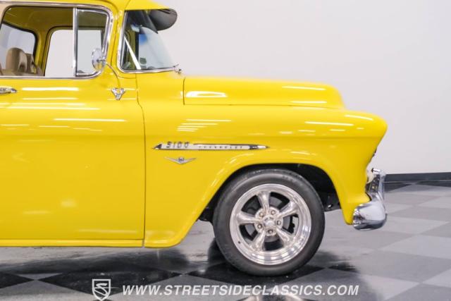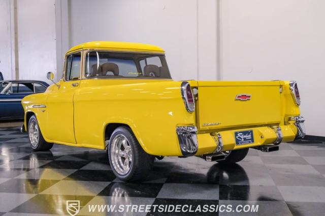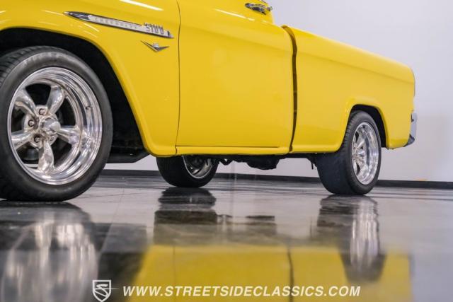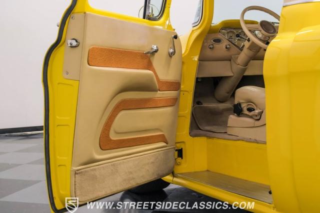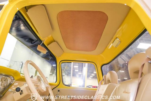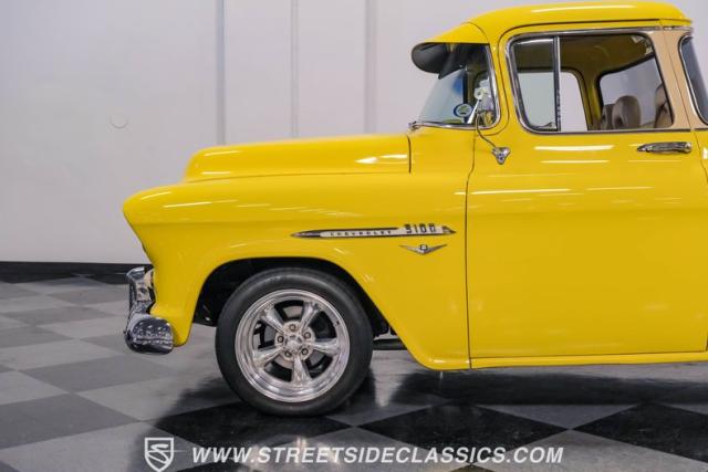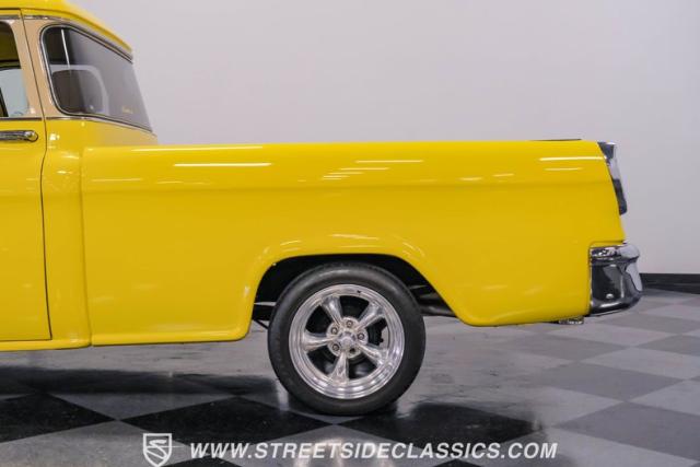 This 1955 Chevrolet 3100 Cameo represents the first year for this groundbreaking pickup, showcases a stunning yellow and beige two-tone paint job that accentuates its revolutionary design. The B-pillars and rear window surround, painted in a complementing beige, create a subtle contrast that draws the eye. A color-matched windshield sun visor adds a custom touch to this already distinctive truck. Rolling on 17\" Eagle Alloys wrapped in 255/45ZR17 tires, this Cameo strikes a powerful stance on the road.