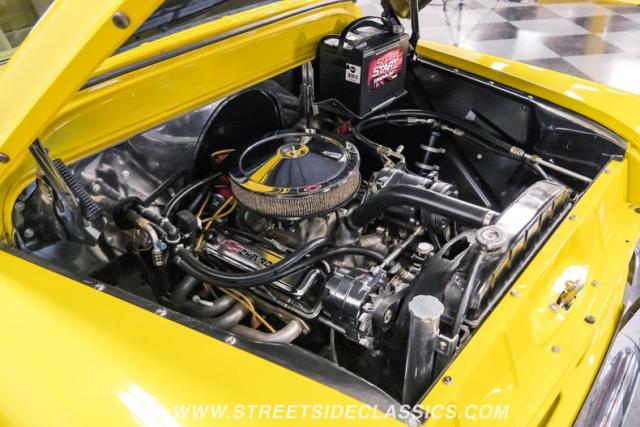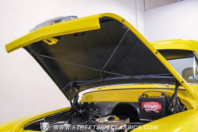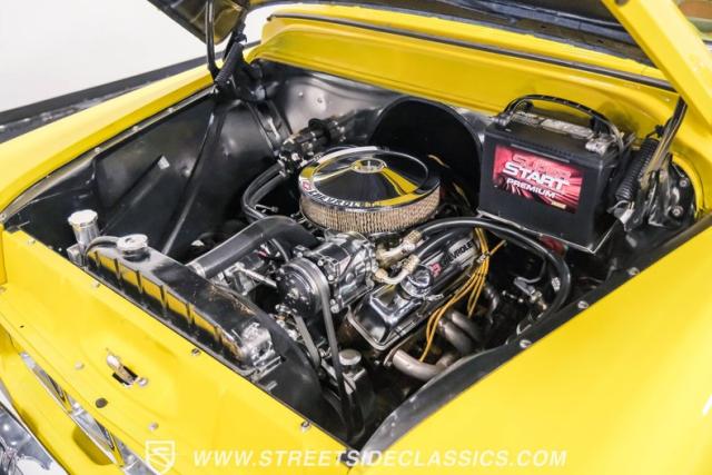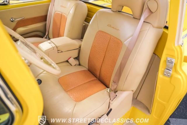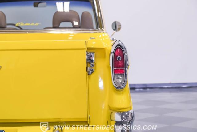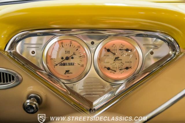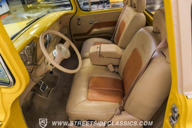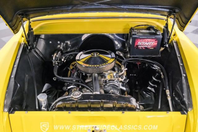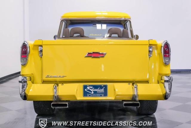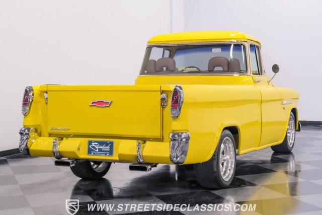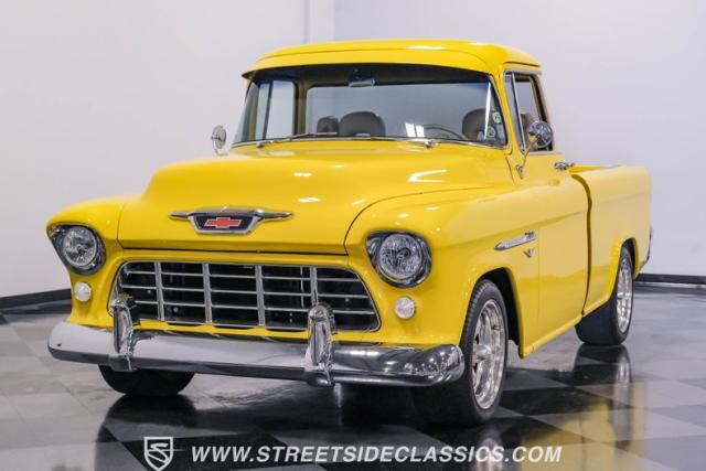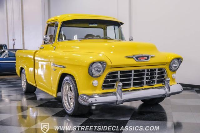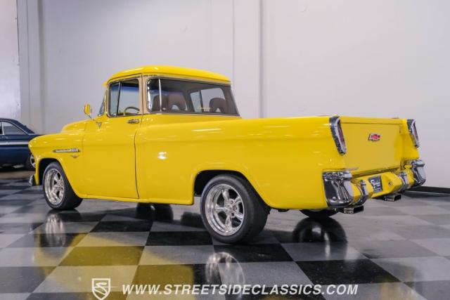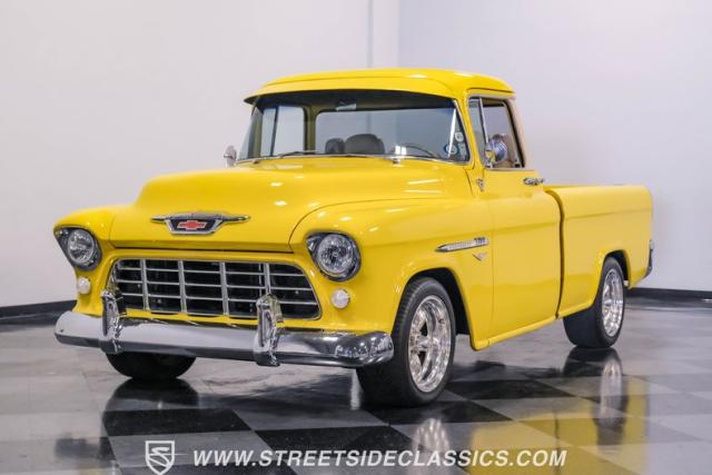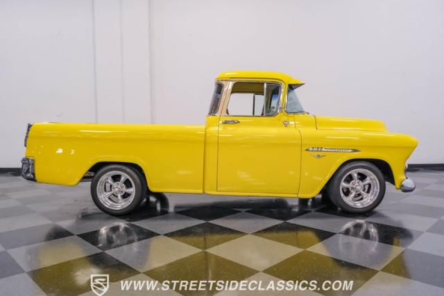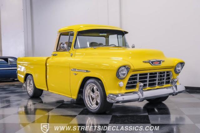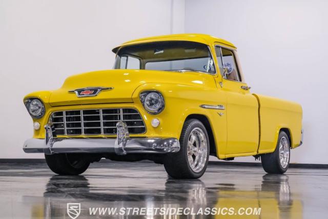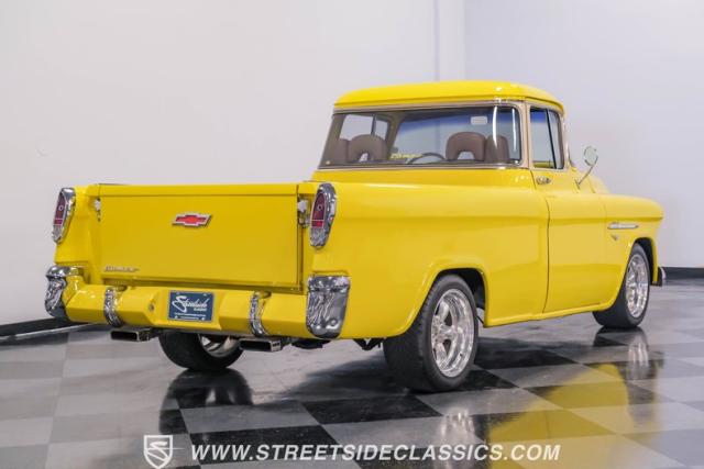 This 1955 Chevrolet 3100 Cameo represents the first year for this groundbreaking pickup, showcases a stunning yellow and beige two-tone paint job that accentuates its revolutionary design. The B-pillars and rear window surround, painted in a complementing beige, create a subtle contrast that draws the eye. A color-matched windshield sun visor adds a custom touch to this already distinctive truck. Rolling on 17\" Eagle Alloys wrapped in 255/45ZR17 tires, this Cameo strikes a powerful stance on the road.