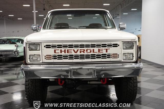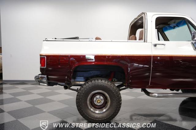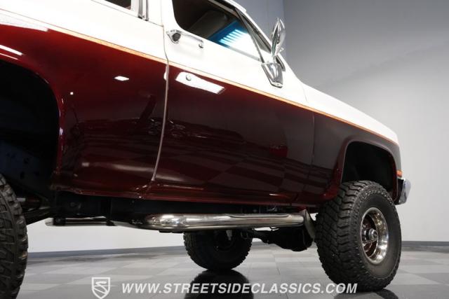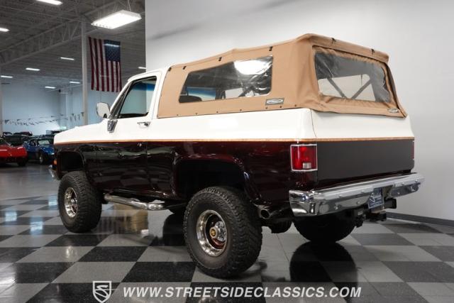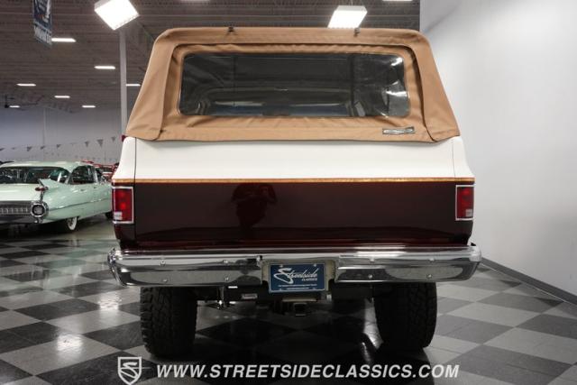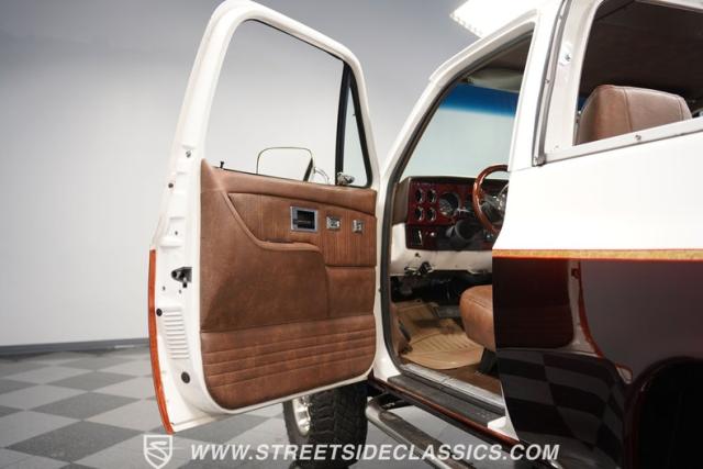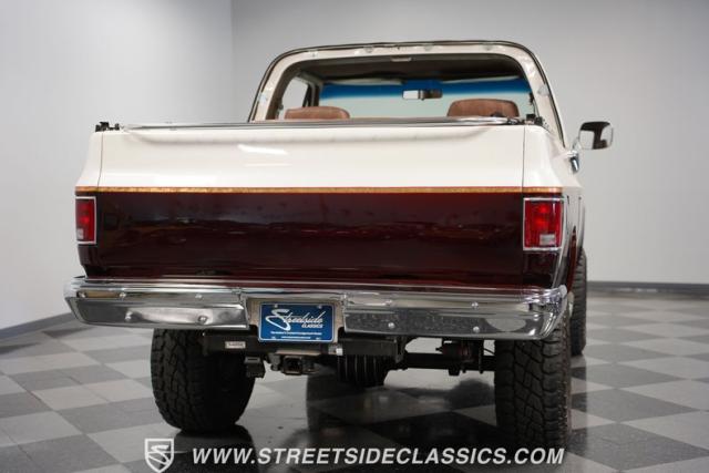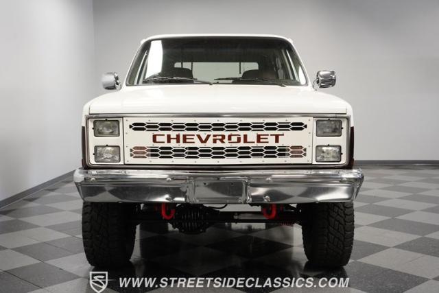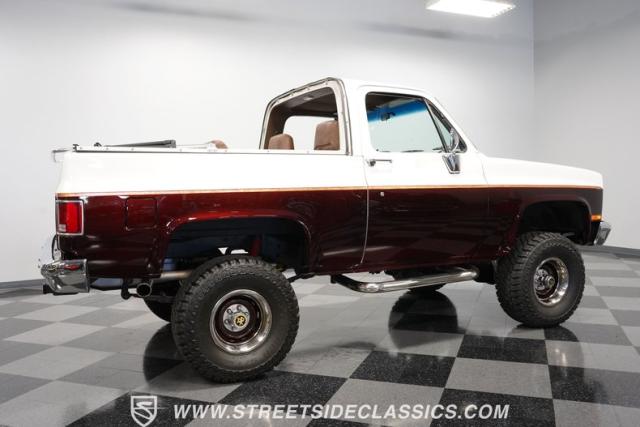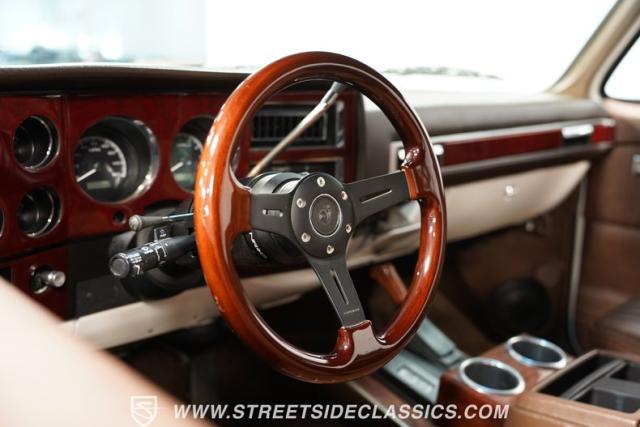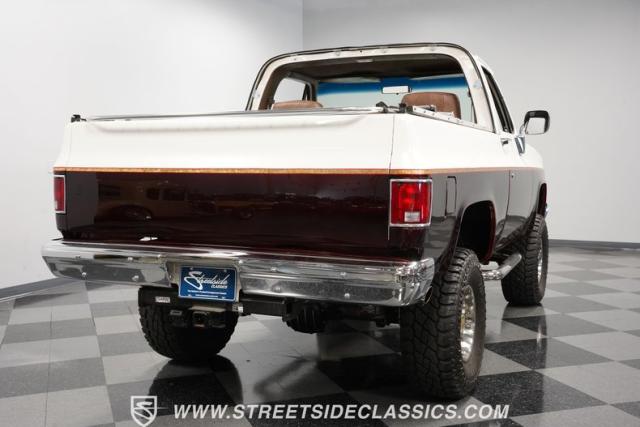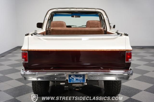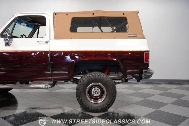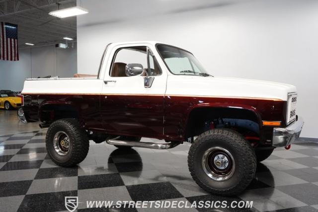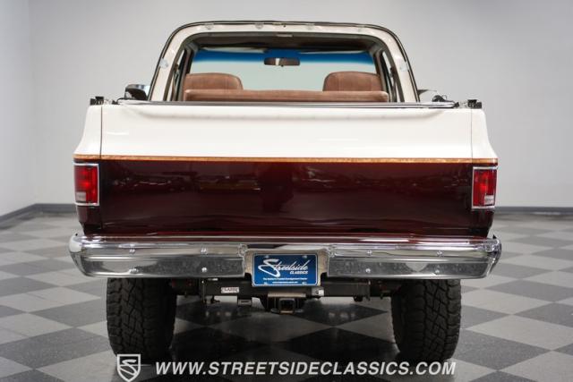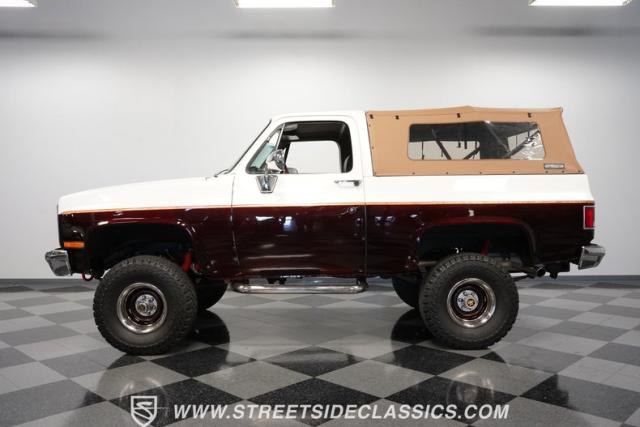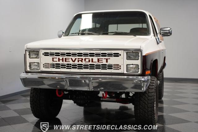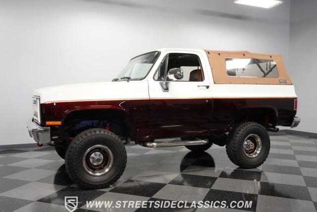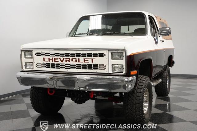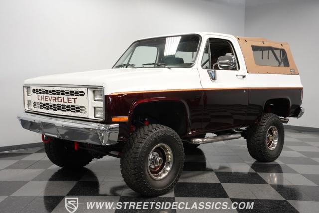 This 1985 Chevrolet Blazer K5 4X4 is a rugged masterpiece that earns respect wherever it roams. This SUV catches the eye from every angle with a striking two-tone metallic brown and white paint job accented by gold leaf and pinstriping. Riding on beefy 33x12.50R15LT tires hugging 15\" color-matched rally wheels, it\'s prepped to conquer any terrain. The custom flush tailgate and tow hitch blend style and utility seamlessly.
