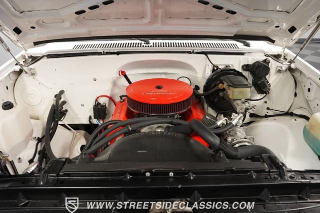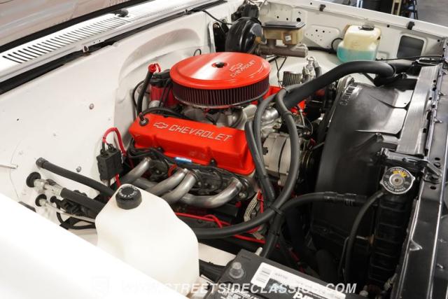 Nestled in the engine bay, a blueprint 350 V8 crate engine awaits, crowned with a Holley four-barrel carb and sporting vibrant orange valve covers and air cleaner. Paired with a silky 4-speed automatic transmission and a 10-bolt rear axle, this drivetrain balances muscle and dependability. The bay is clean and fresh, with new hoses and wiring elevating its visual impact. Power steering and brakes make piloting this rig a breeze, while the Borla dual exhaust unleashes a soul-stirring growl.