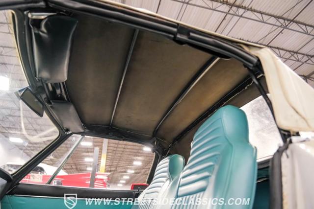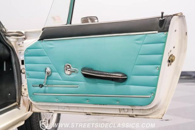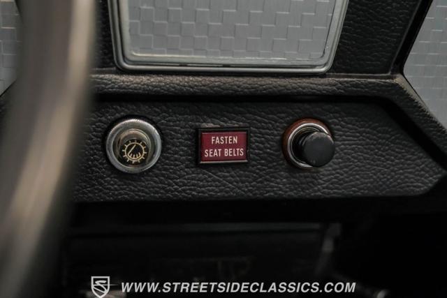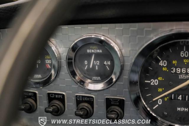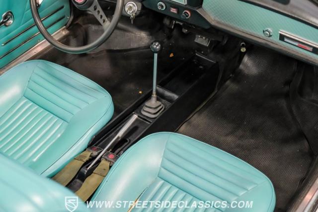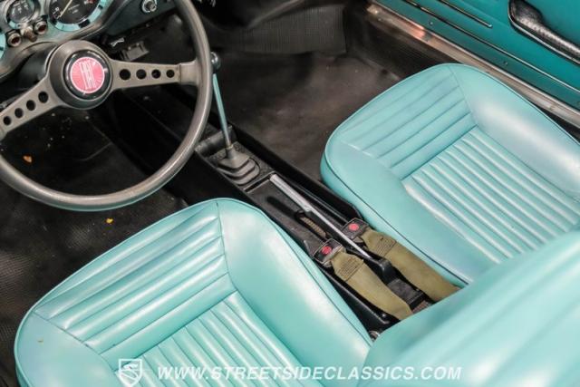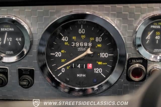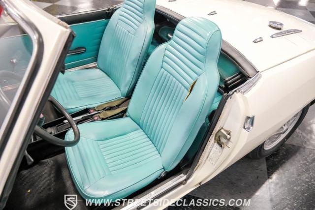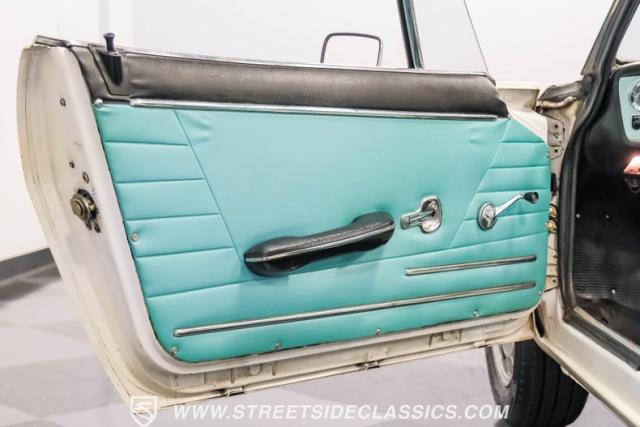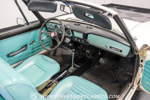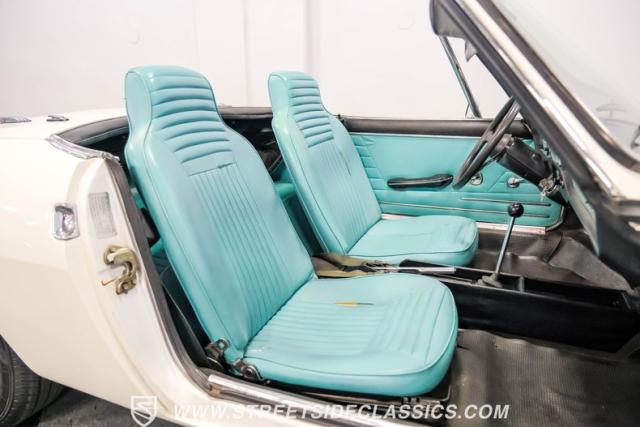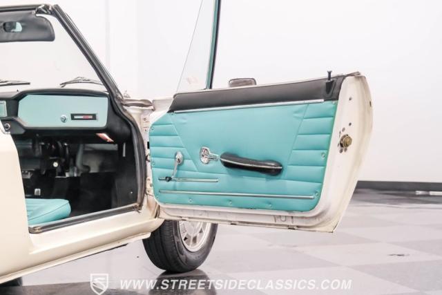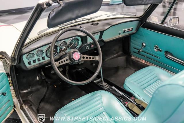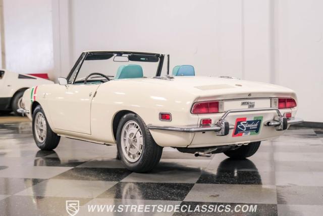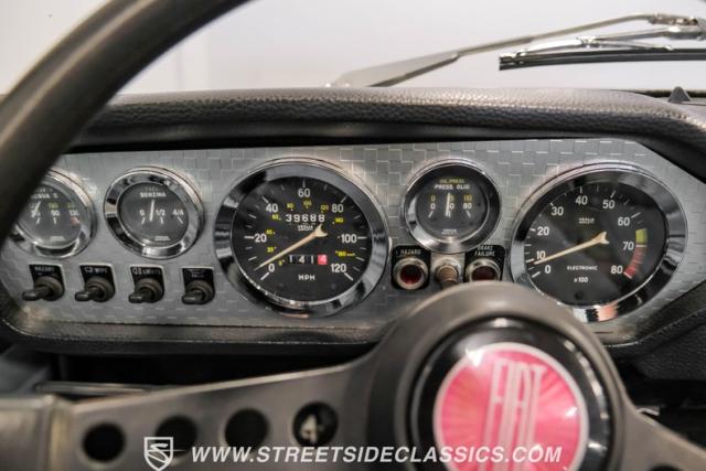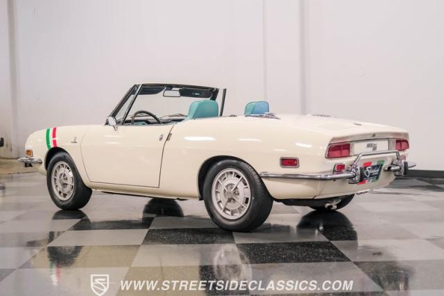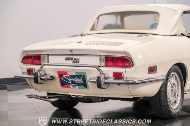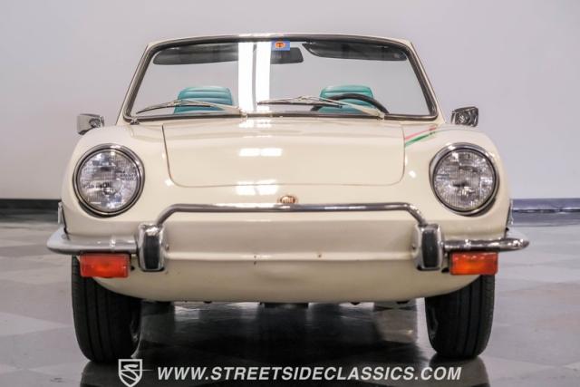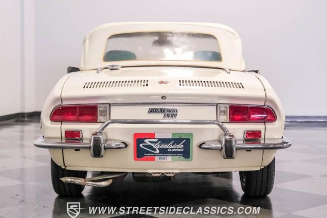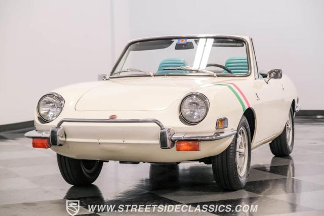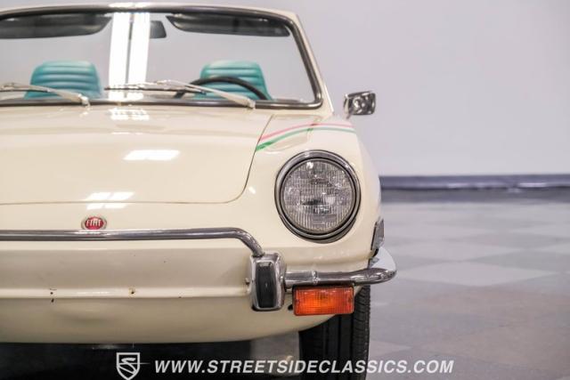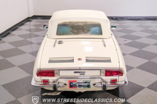 Settle into the blue vinyl bucket seats and you\'ll discover a cabin that blends sportiness and comfort. The center console, complete with a floor-mounted shifter, puts control right where you want it. Aluminum accents on the dash and fully functional gauges keep you in tune with the car\'s performance. The well-preserved steering wheel imparts confidence as you pilot the Fiat through your favorite routes. Need a place for your driving gear? Just open up the drop-down glovebox. Though the seats display some earned character, they still offer a pleasant place to sit. And when the open road calls, simply stow the white vinyl manual soft top and let the wind rush in.