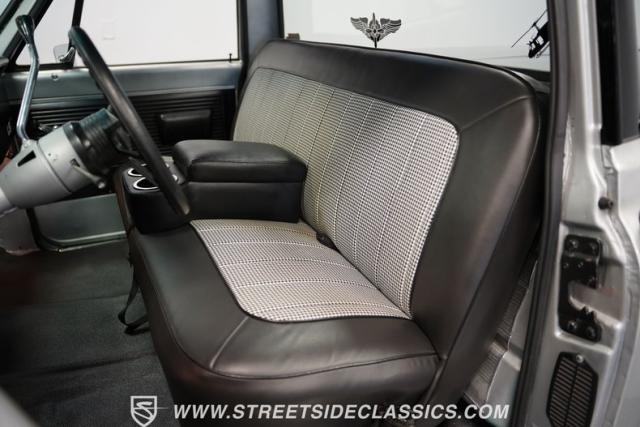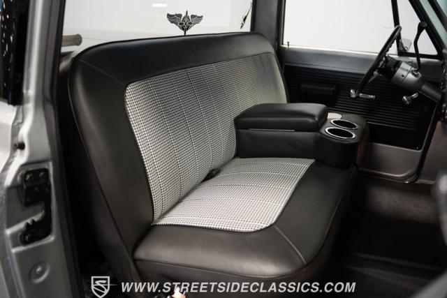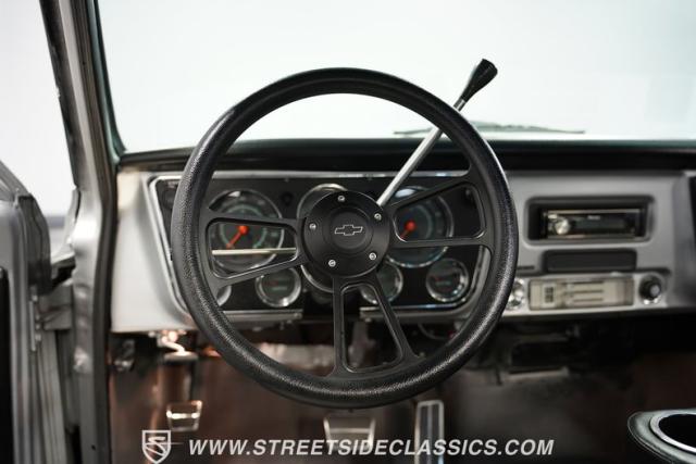 The C10\'s interior merges old-school looks with modern tech. A houndstooth bench seat anchors the cabin. Dakota Digital gauges provide clear readouts, and an aftermarket radio with Bluetooth brings current audio capabilities. The floor features a durable rubber covering, and the lack of a headliner keeps things simple. Power steering allows for easy maneuvering in any situation.