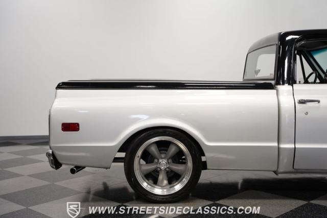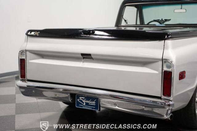 This 1971 Chevrolet C10 LS Restomod sports a silver and black two-tone paint job. The truck sits on 20\" American Racing wheels, with 245/45ZR20 tires up front and 295/40ZR20 rubber in the rear. A custom bed cover tops the rear, while the bed houses a unique setup: five metal storage bins secured to a surface covered in license plates from various states. Upgraded headlights improve visibility, rounding out this C10\'s exterior modifications.