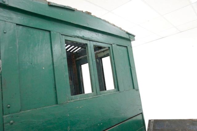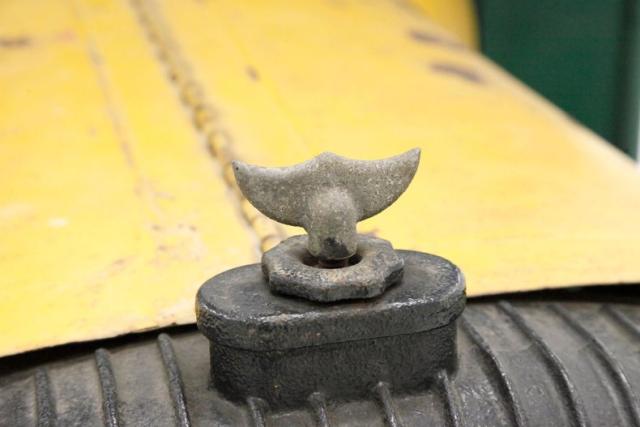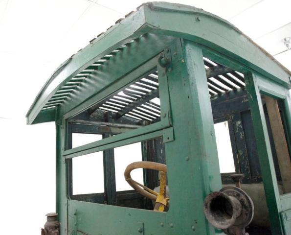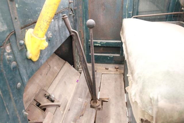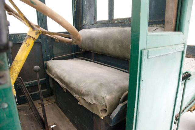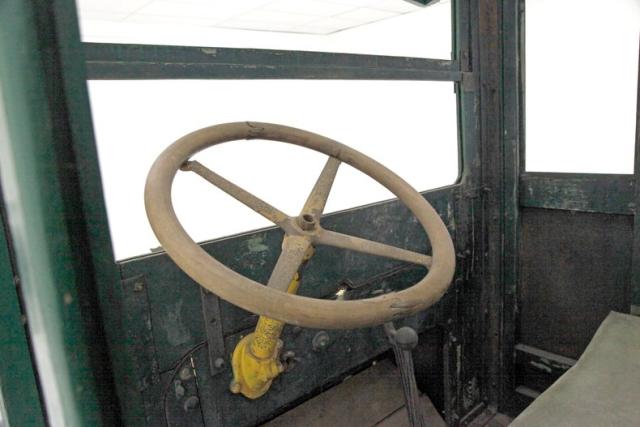 A black leather bench provides the seating and a simple dash is in front with all the levers and knobs of an early truck.