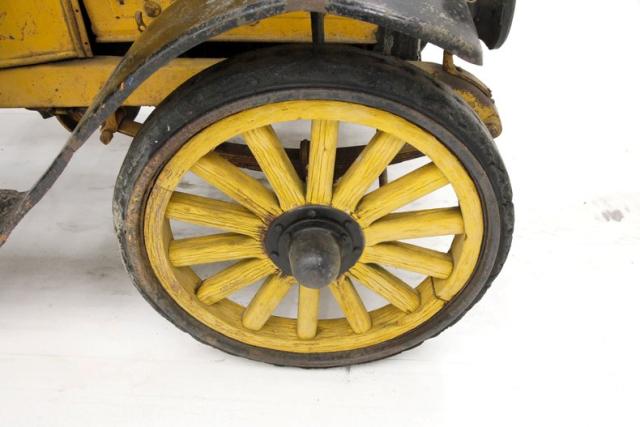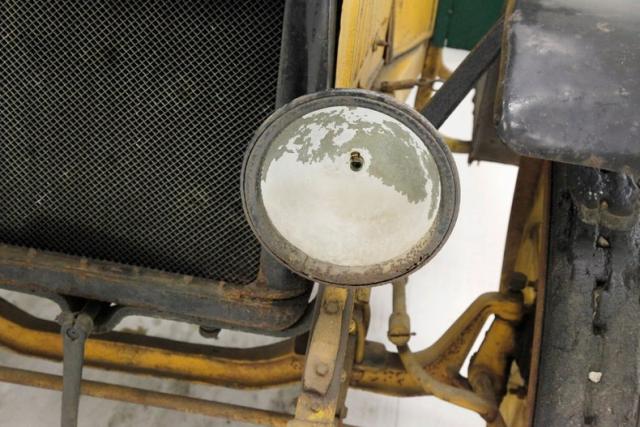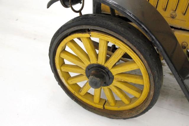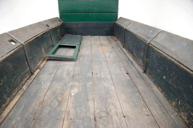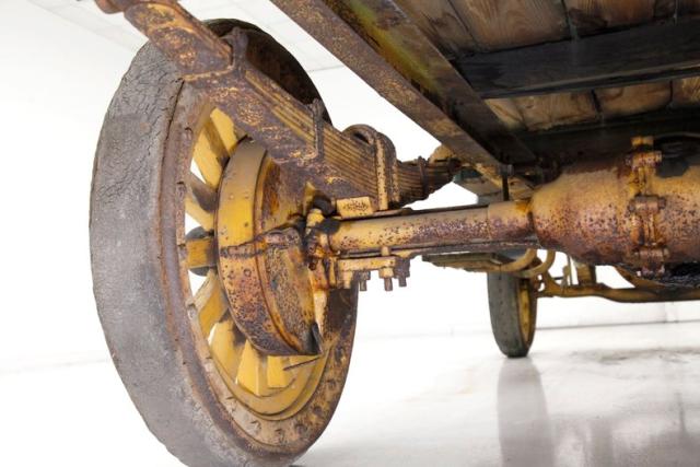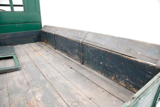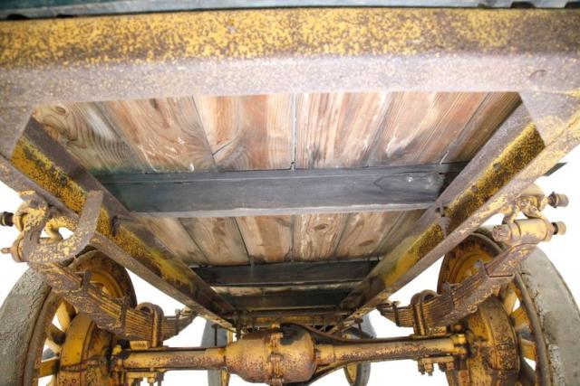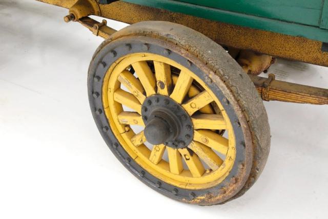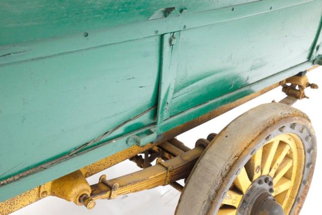 A cast iron radiator shell leads the way with a single large headlight on either side. The suspension is just under these lights and the radiator is badged and painted black, the cowled hood and firewall are yellow. Black painted steel fenders curve above yellow painted wood spoke wheels which are covered in solid rubber. Not unlike a carriage cab, this driver/passenger compartment is all wood construction and has a unique design. It has a dual front windshield, and side doors also with windows. The roof line is of note as it curves upward then back down giving more headroom, These doors are a pocket door design and slide rearward for access to the cabin. In back on top of a long steel beam frame is a long wood bed with angled tops to the wood vertical sides. There is a tailgate, and the bed is also wood and painted black with the outside keeping the green theme. Definitely a unique exterior look with no concern what-so-ever with aerodynamics.