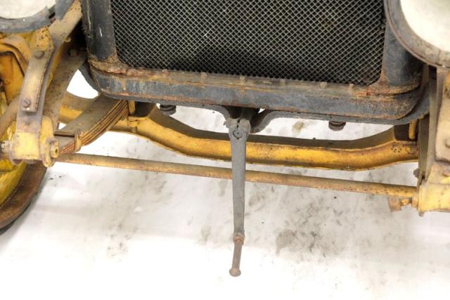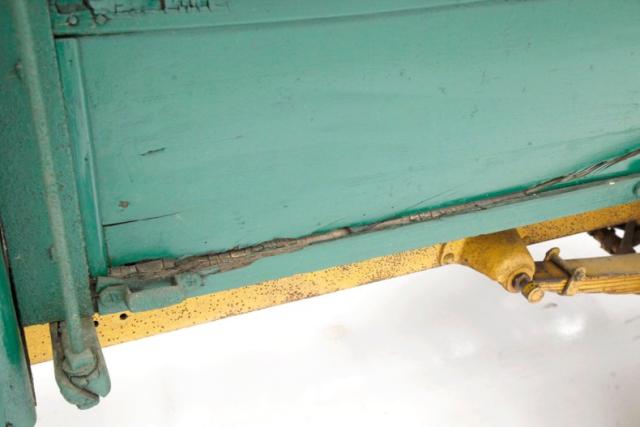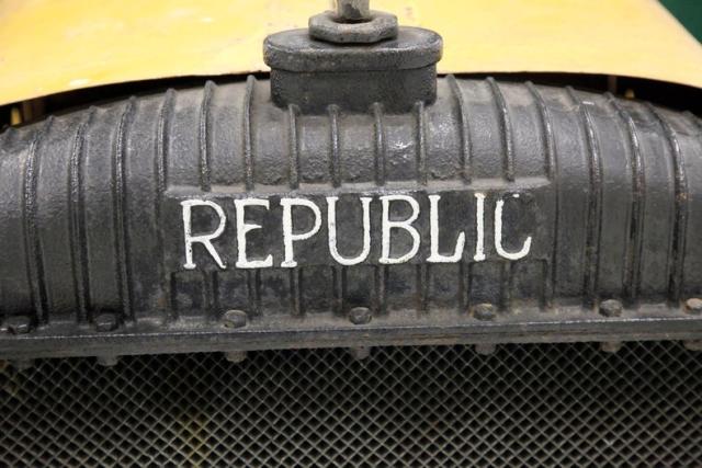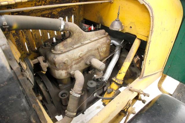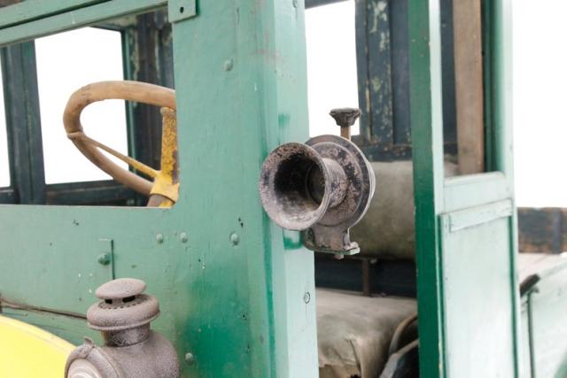 For consignment, an early version of a Republic 2 ton truck from 1915. It may need some engine work, but all the body and frame and underside fixin\'s are there. An interesting early build with its curved roof vertical cabin, long slender cowled hood and this one having a long bed pickup configuration made of wood and painted green.