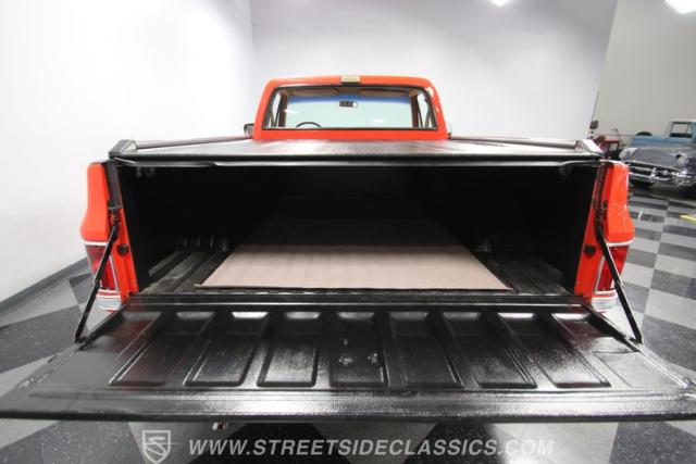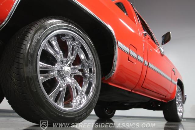 Crisp lines, bright chrome bumpers, good glass, and fresh weather-stripping leave quite a good presentation of the fundamentals. And there\'s some sporty flair with the upgraded cowl hood, large dual exhaust tips, and 20-inch polished wheels. Plus, the covered bed and bed rails have a great look, and they also join the liner paint in the bed to give this truck plenty of versatility. And that\'s exactly how to look at this pickup. It\'s attractive and useful. That\'s why the red paint has a bold style, but the overall finish won\'t make you shy away from doing real truck duty on the weekends.