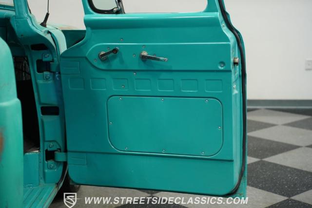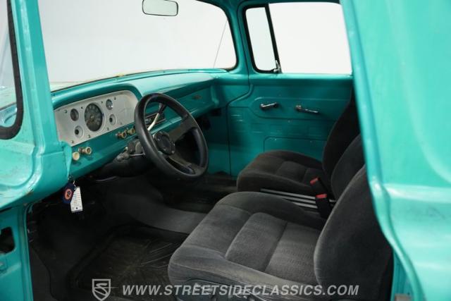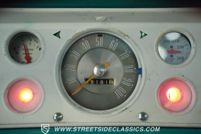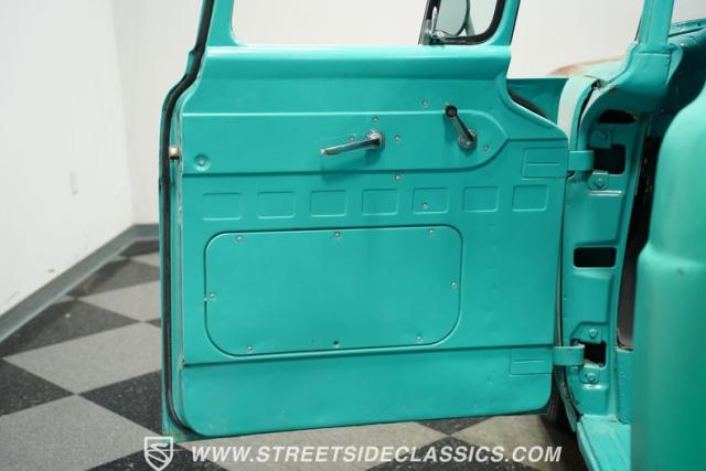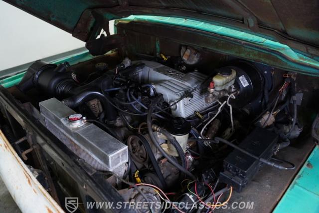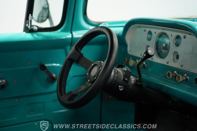The interior is very nice and doesn\'t quite match the rugged look of the exterior, but it still keeps some of its old-school personality. There are two Charcoal Gray cloth bucket seats along with a center console. The door panels, dashboard, and roof are all painted in Turquoise and holding up very well. A custom steering wheel is attached to a tilt steering column, while the old-school dashboard houses aftermarket AutoMeter gauges. An Alpine head unit fits nicely in the center of the dash, offering AM/FM/CD capabilities. The carpet is in clean shape, protected by a set of heavy-duty floor mats, and out back, the wooden bed is about as old school classic as it gets.