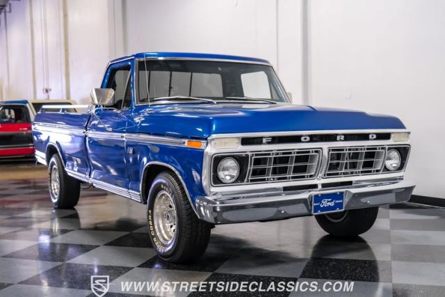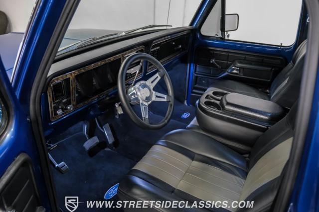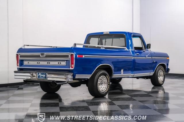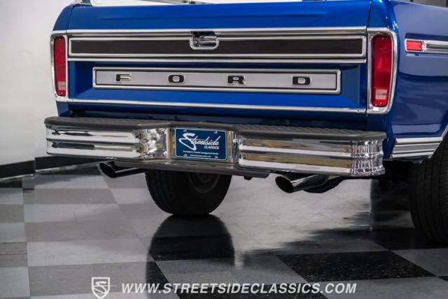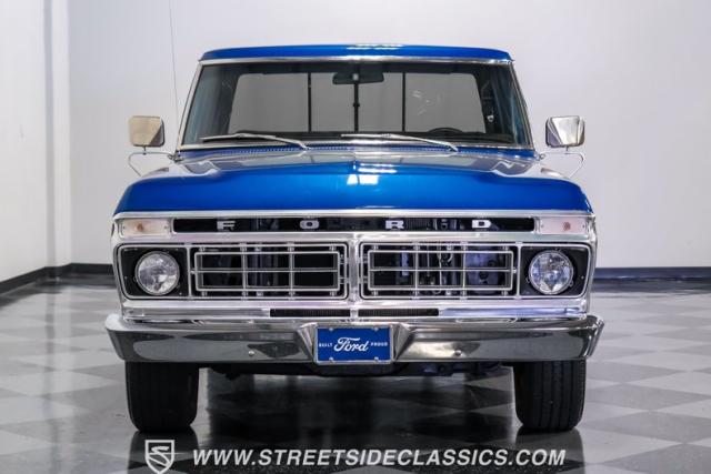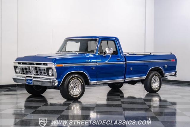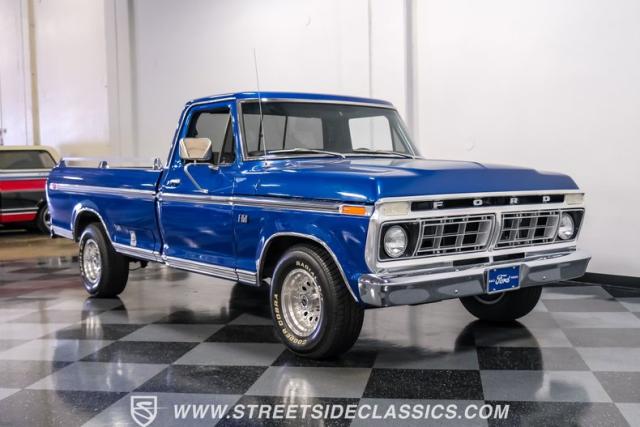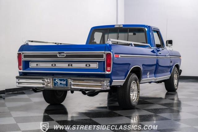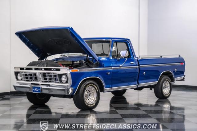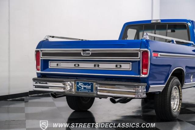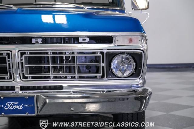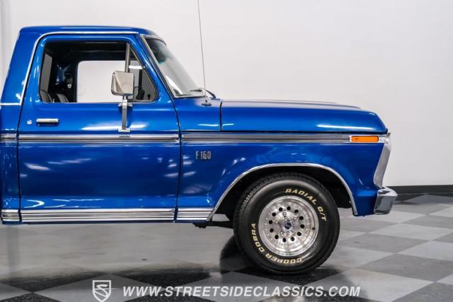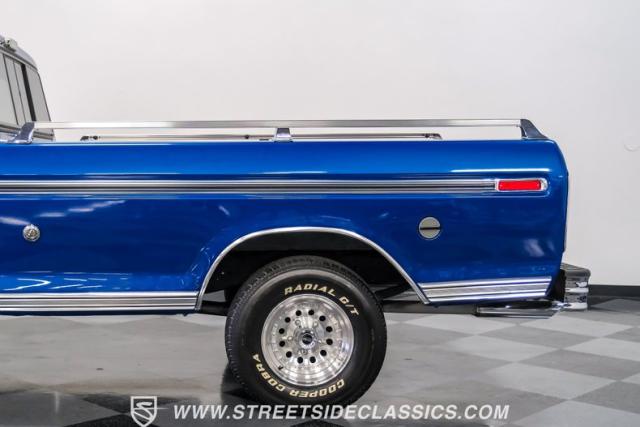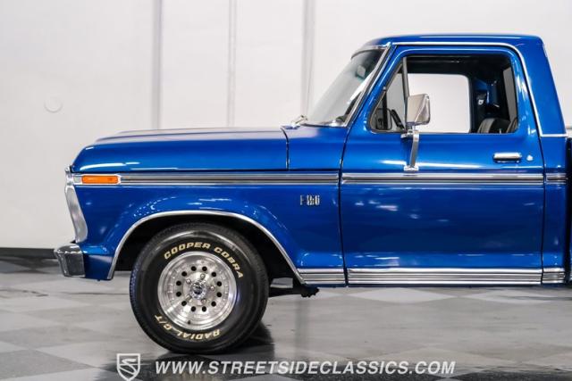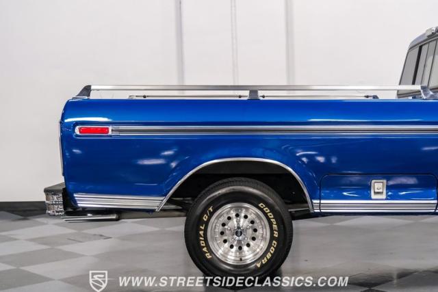Midnight blue metallic, a hue as deep as the night sky, cloaks this 1976 Ford F-150 Ranger XLT, hinting at the legacy within its panels. Riding on 15\" American Racing aluminum wheels wrapped in 255/70R15 Cooper tires, this truck\'s stance is unapologetically proud. In a uniform full repaint, the truck boasts a rhino-lined bed, chrome dual exhaust tips, and a unique locking side bed storage box that\'s not a common sight. It\'s a one-family heirloom turned modern classic.