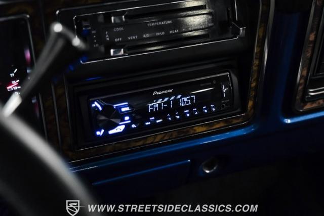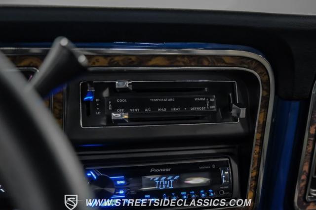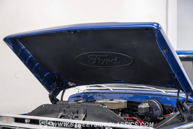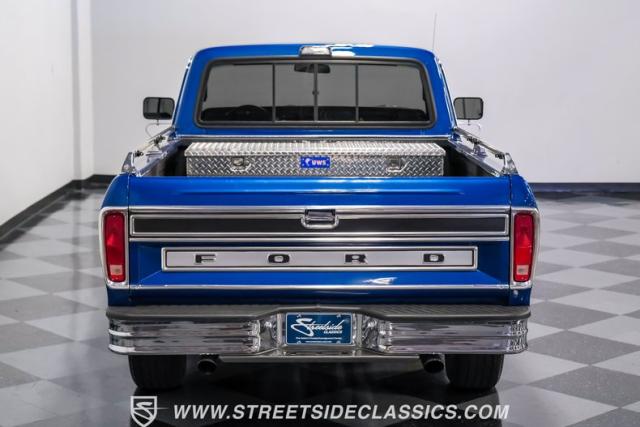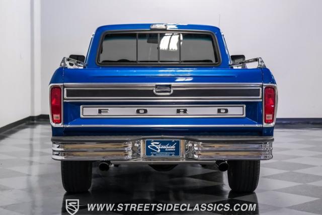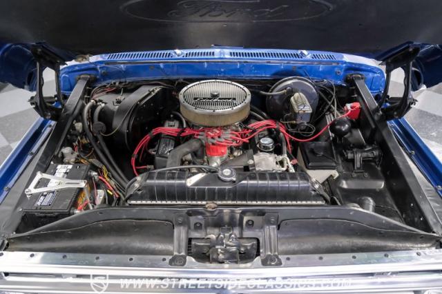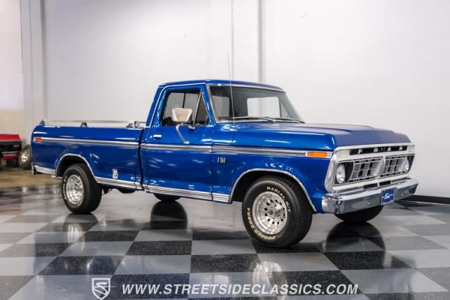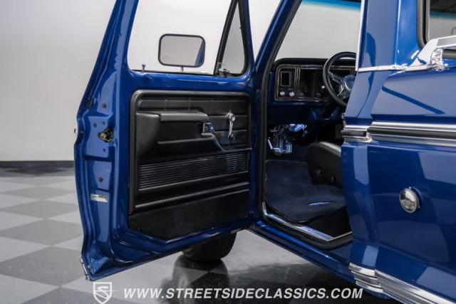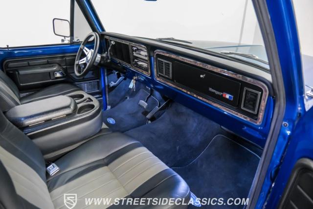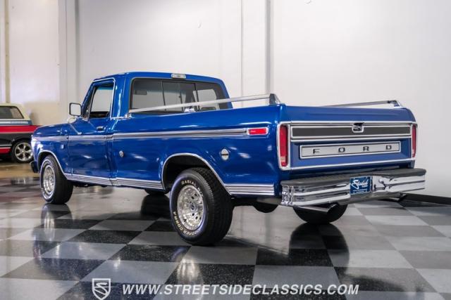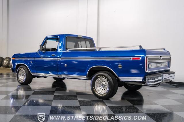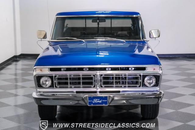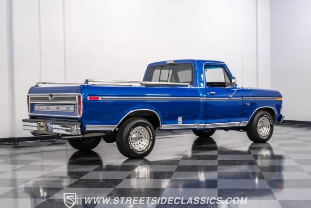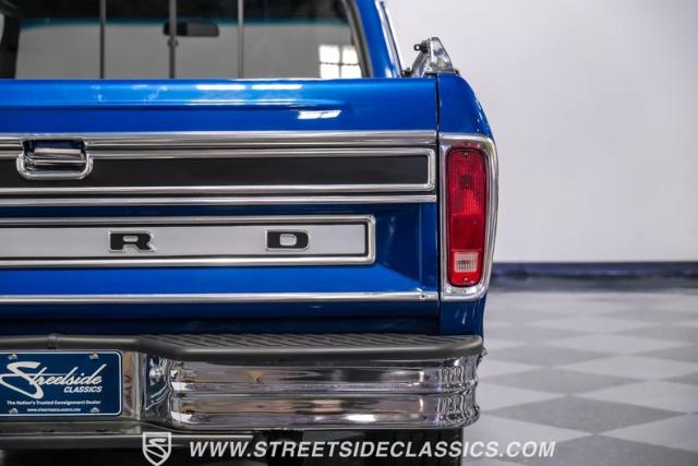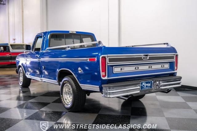 Midnight blue metallic, a hue as deep as the night sky, cloaks this 1976 Ford F-150 Ranger XLT, hinting at the legacy within its panels. Riding on 15\" American Racing aluminum wheels wrapped in 255/70R15 Cooper tires, this truck\'s stance is unapologetically proud. In a uniform full repaint, the truck boasts a rhino-lined bed, chrome dual exhaust tips, and a unique locking side bed storage box that\'s not a common sight. It\'s a one-family heirloom turned modern classic.