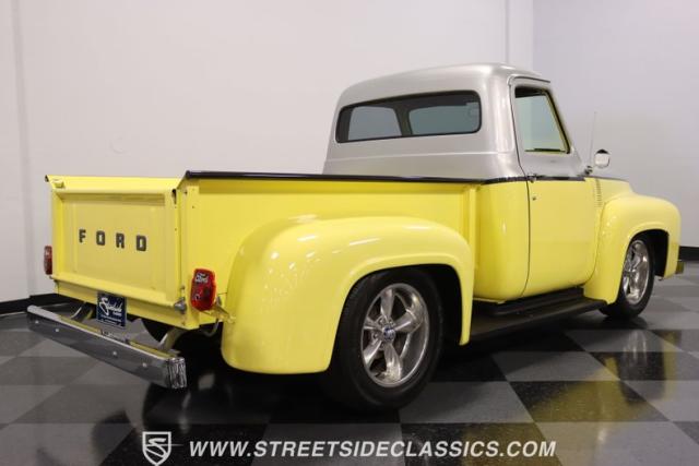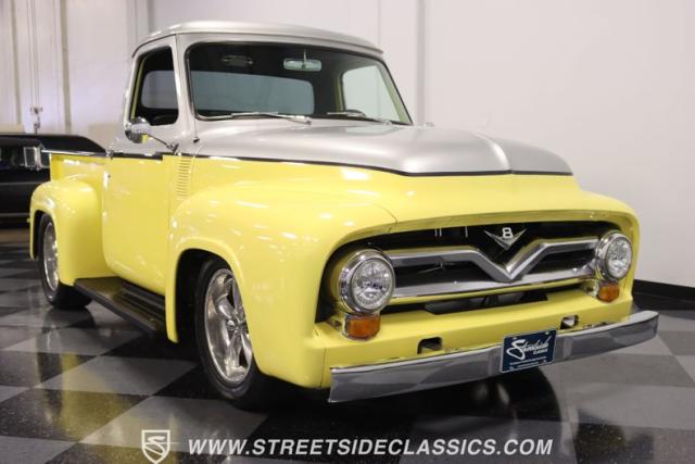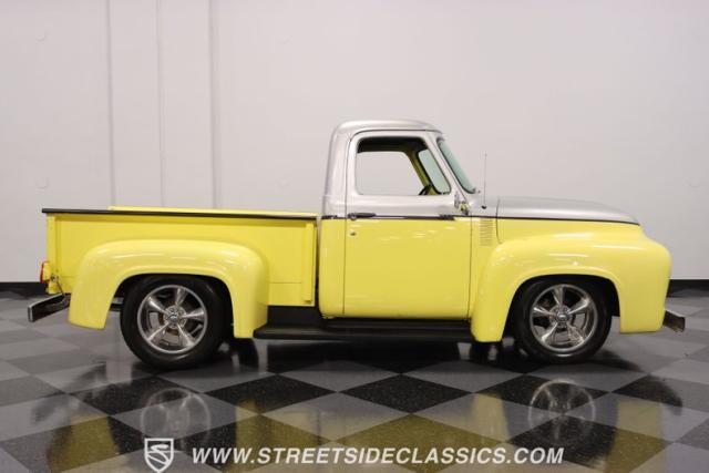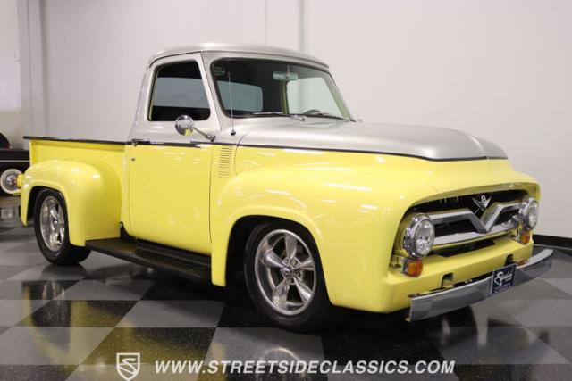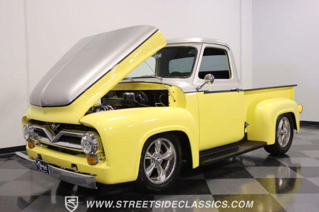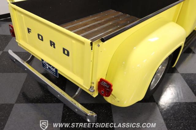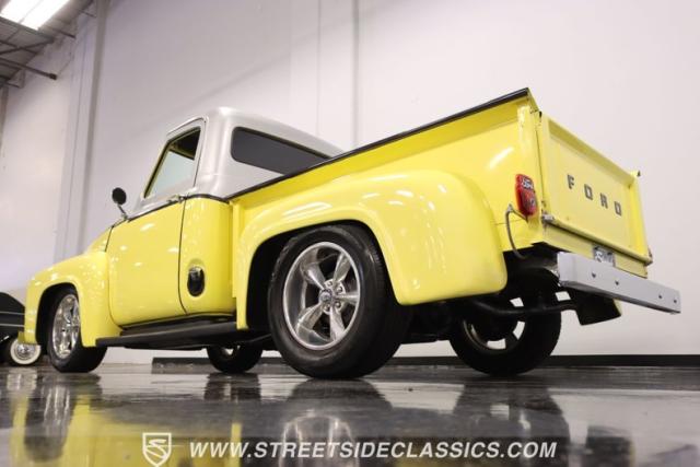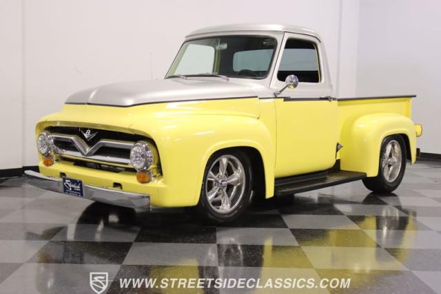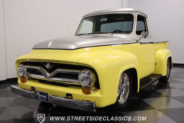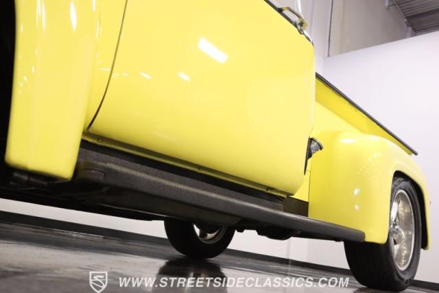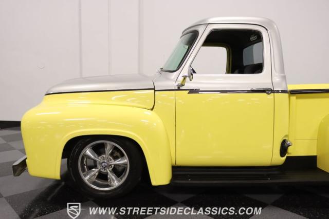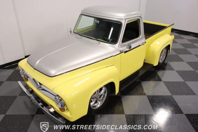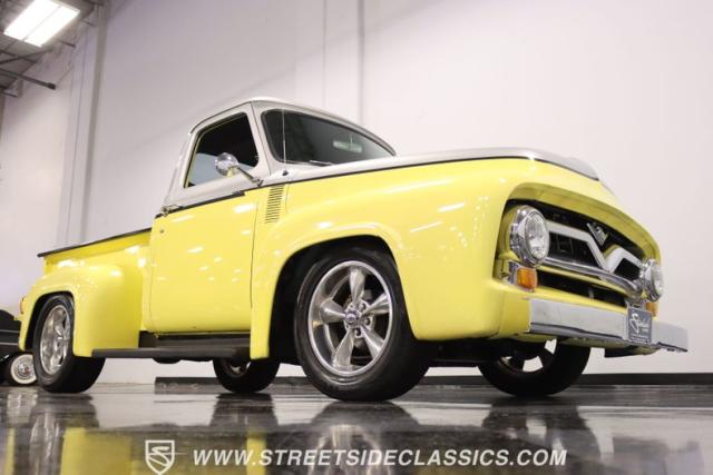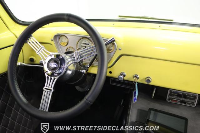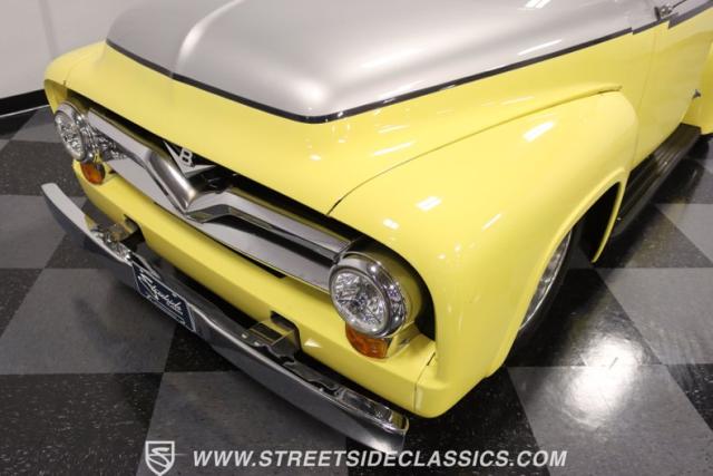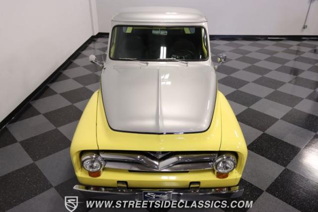 Bathing in a sun-kissed yellow and accentuated with silver trim, it\'s as if this 1955 Ford F-100 Custom decided to dress up in its Sunday best every day of the week. Sporting 18\" Showwheels Streeter rims wrapped in 235/60R18 Nexen at the front and 265/60R18 at the rear, it stands proud, ready to command the roads. The bed, a masterpiece of craftsmanship, showcases real wooden planks that offer a striking contrast to the modernity of its mechanical prowess, marrying the utility of yesterday with today\'s aesthetic sensibilities. The addition of a sporty clamshell-style front hinge hood, tri-bar blue dot headlights, and Ford insignia blue dot tail lights complement the deletions of the vent windows, creating a silhouette that\'s both vivacious and forward-thinking.