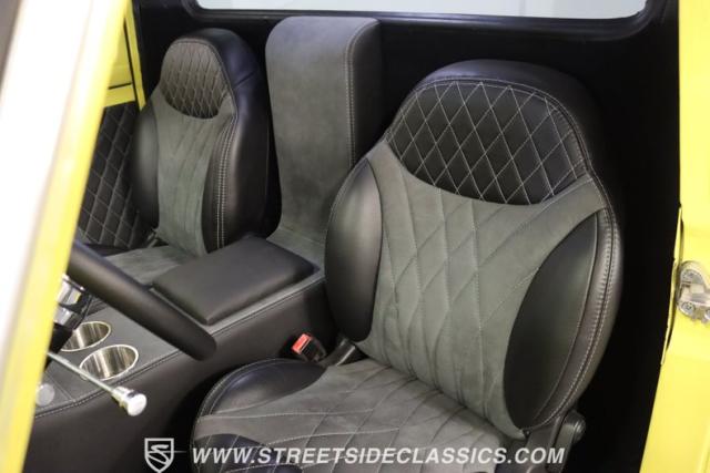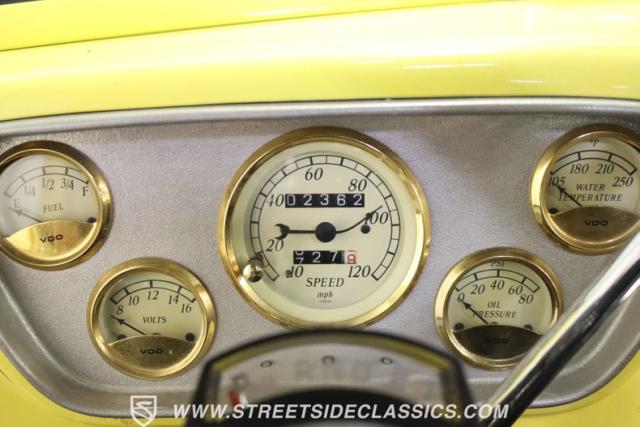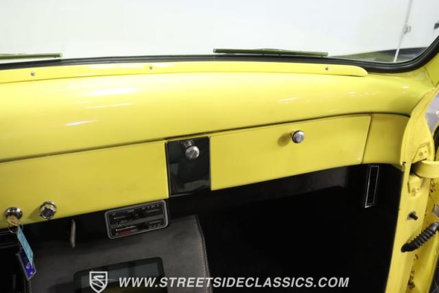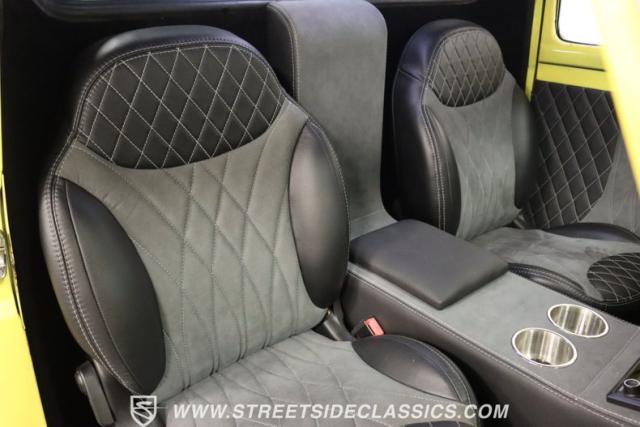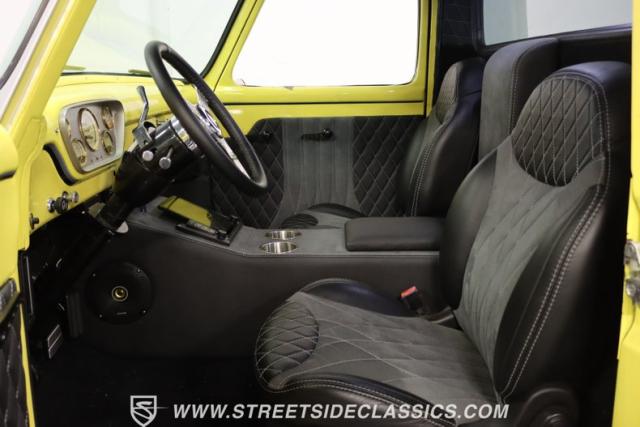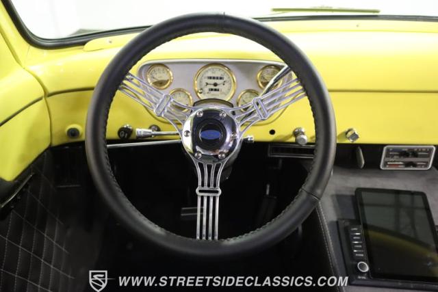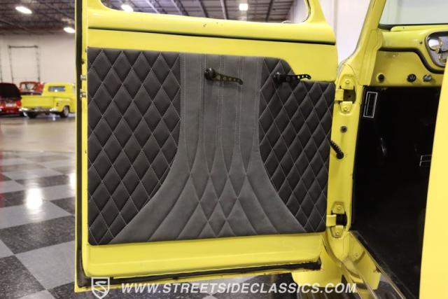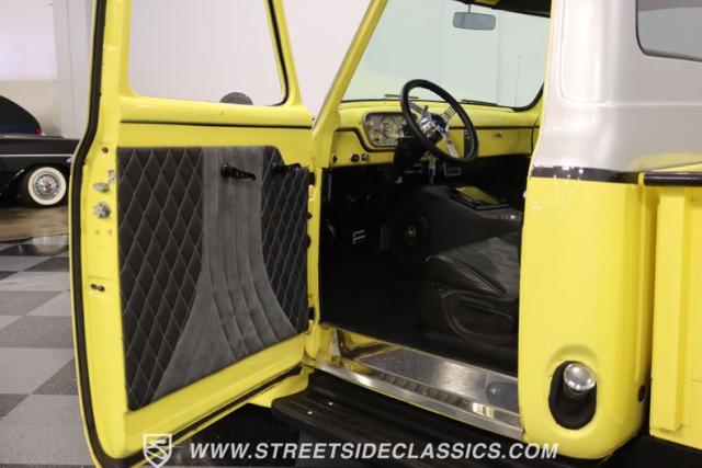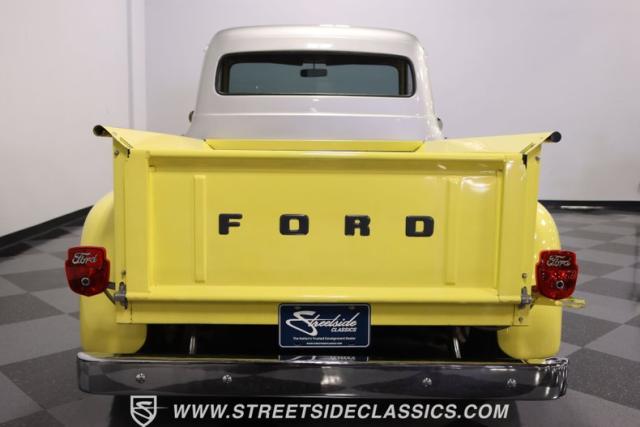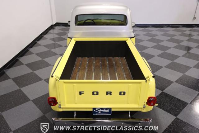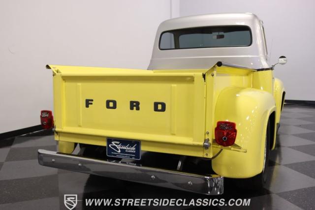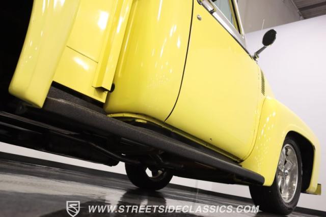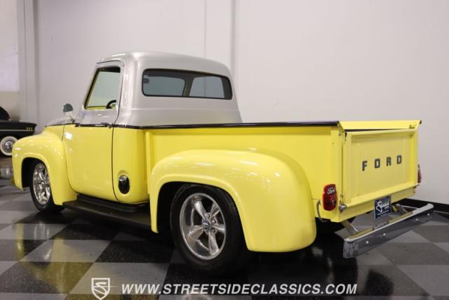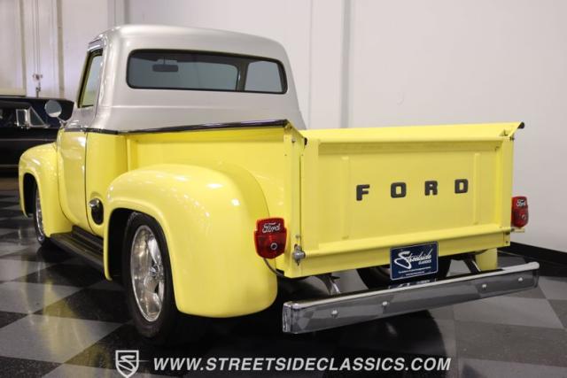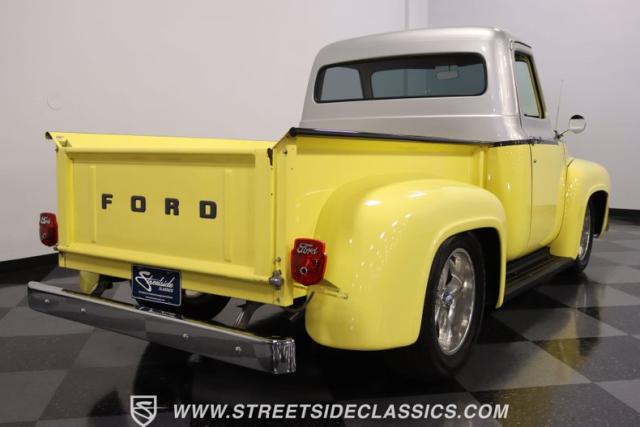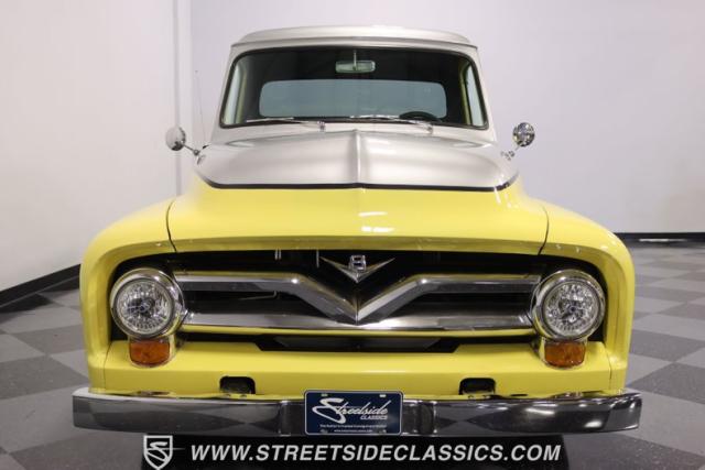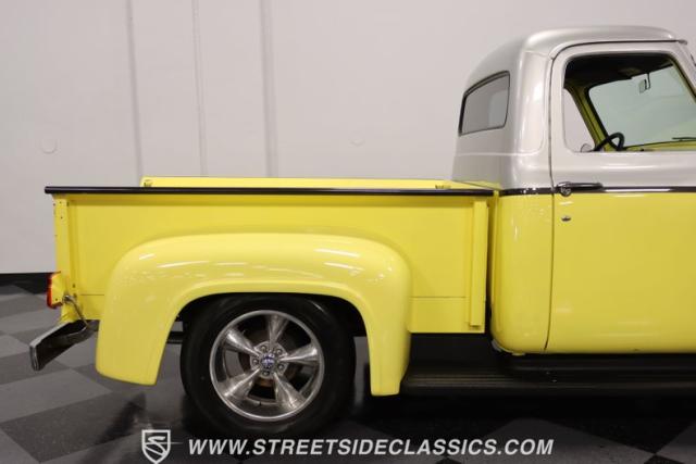 Bathing in a sun-kissed yellow and accentuated with silver trim, it\'s as if this 1955 Ford F-100 Custom decided to dress up in its Sunday best every day of the week. Sporting 18\" Showwheels Streeter rims wrapped in 235/60R18 Nexen at the front and 265/60R18 at the rear, it stands proud, ready to command the roads. The bed, a masterpiece of craftsmanship, showcases real wooden planks that offer a striking contrast to the modernity of its mechanical prowess, marrying the utility of yesterday with today\'s aesthetic sensibilities. The addition of a sporty clamshell-style front hinge hood, tri-bar blue dot headlights, and Ford insignia blue dot tail lights complement the deletions of the vent windows, creating a silhouette that\'s both vivacious and forward-thinking.