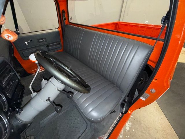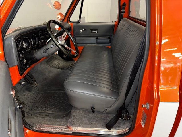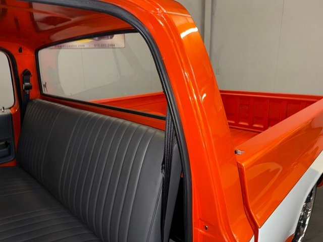 The interior is gray on a bench seat with door panels, dash cap being all gray and like new. Gray carpet, gray rubber floor mats like new. Sill plates are good, all door rubber is like new, arm rest like new, black shoulder belts like new, kick panels with speakers, speakers in corners behind seat. Updated gauges are white face and like new. Tilt column with automatic, custom gray 3-post steering wheel like new, door handles and window cranks like new, Vintage A/C & Heat. Newer Vintage control panel, gray Sunvisor’s like new. Like new inside.
