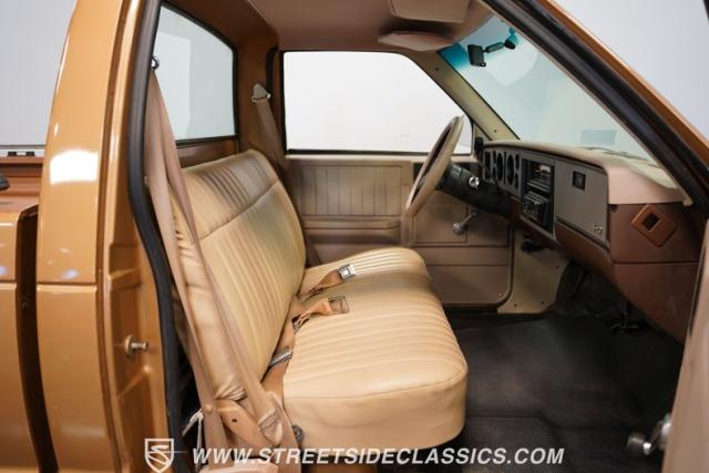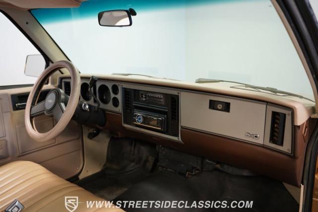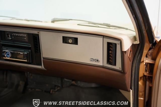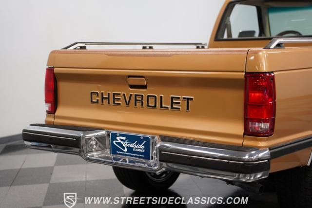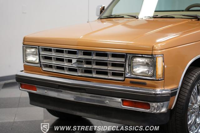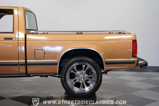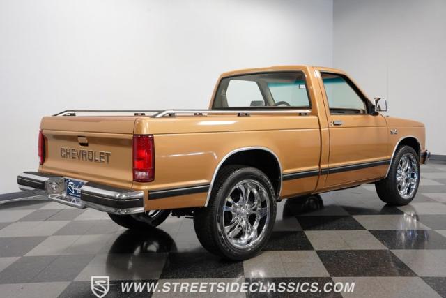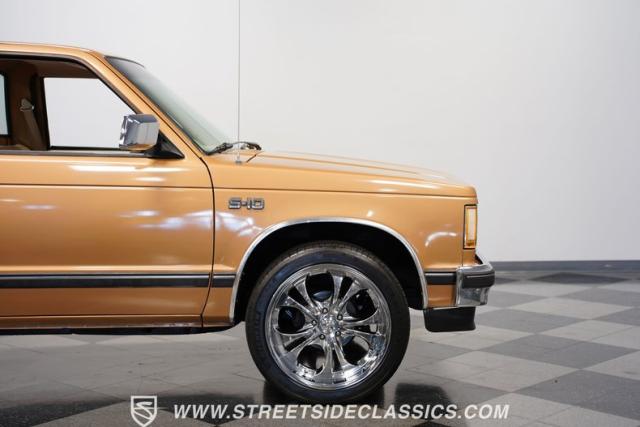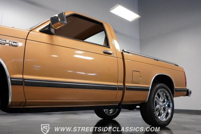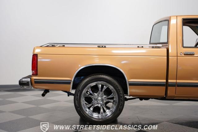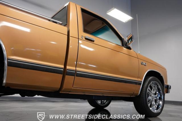 Initially purchased in North Carolina, this 1984 Chevrolet S10 represents the American pickup evolution. The gold exterior radiates against the custom 20-inch Boss wheels, creating a bold presence on any street. The front rides on 255/40ZR20 tires, while the meatier 275/45R20 rubber anchors the rear. A rugged painted bedliner and chrome bed rails amplify both function and style. The clean, uncluttered body lines showcase the classic S10\'s natural athleticism.