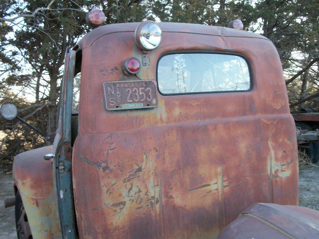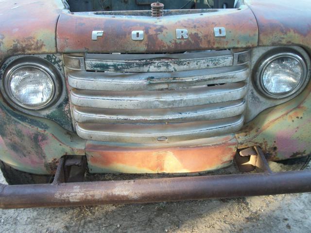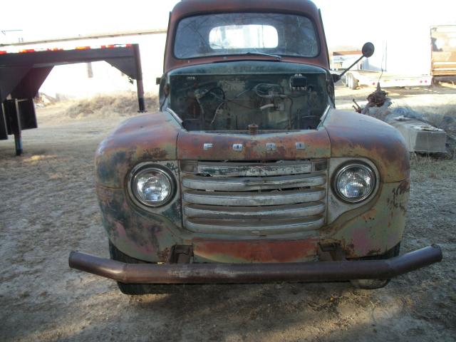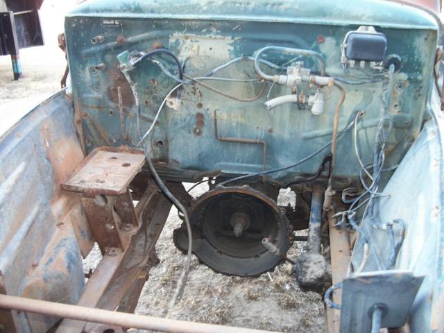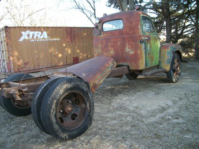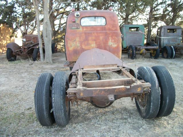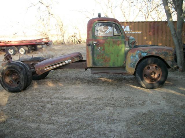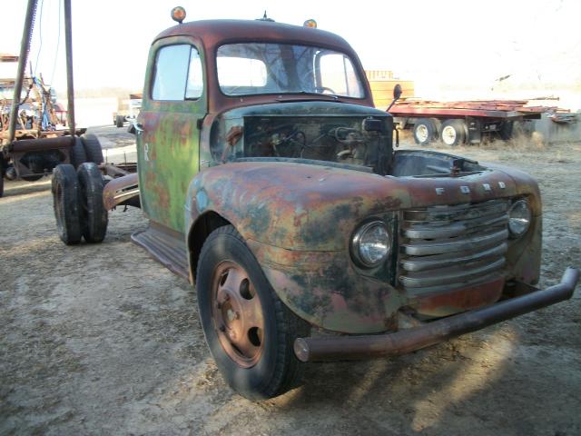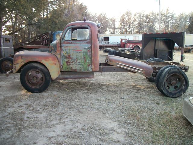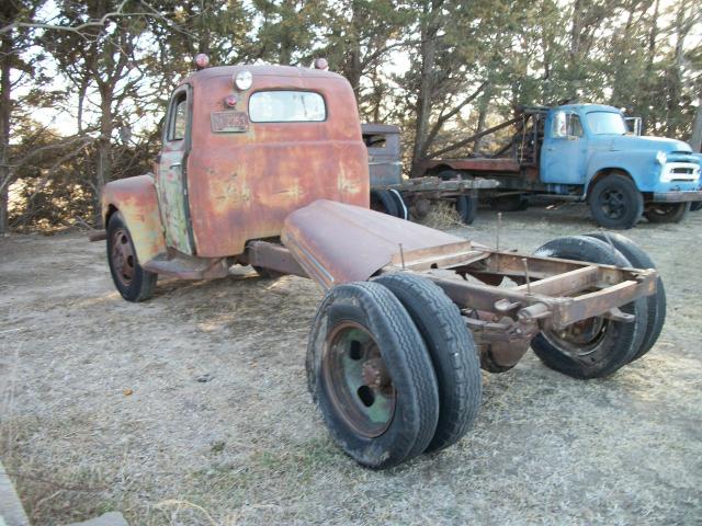 1949 Ford F6 no motor , 4 speed trans , 2 speed axle , had winch bed on it so has 2 direction pto , glass bad , some rust in front fenders ,cab corners look good , some dents , hood on frame , wheel base 158 , cab to end of frame 110 , no radiator , has hood hindges , total length 18 ft 6 in , tires bad but rolls