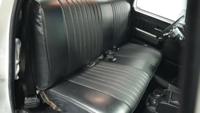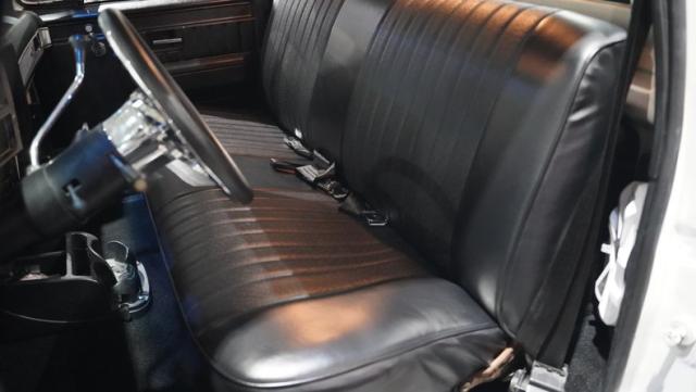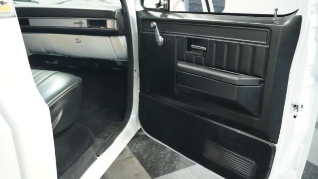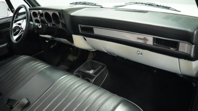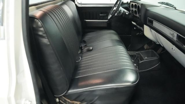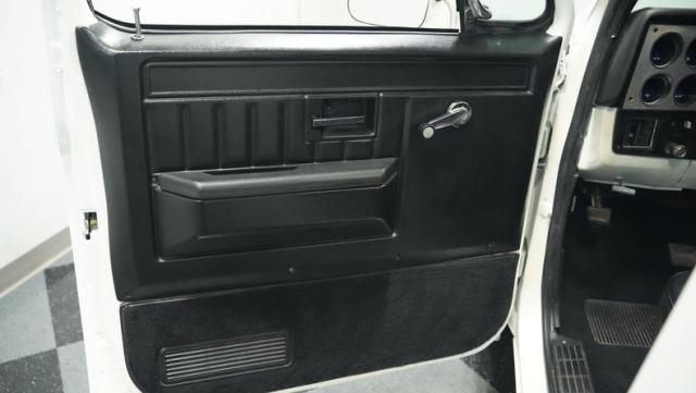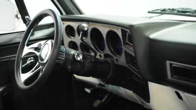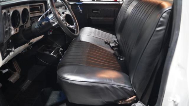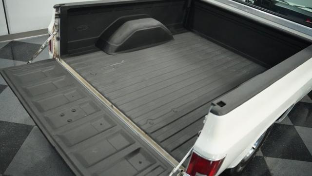 Finished in a custom Pearl White Metallic, the color is contrasted with a blacked-out grill and black spray-on bed liner. A set of black painted factory Chevy truck rally wheels wrapped with 255/70R15 raised white letter General Grabber tires look great and complement the look of this truck\'s lowered stance.