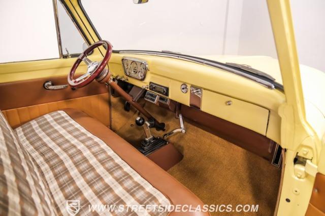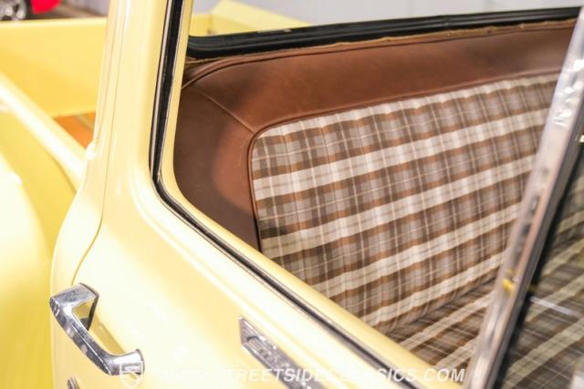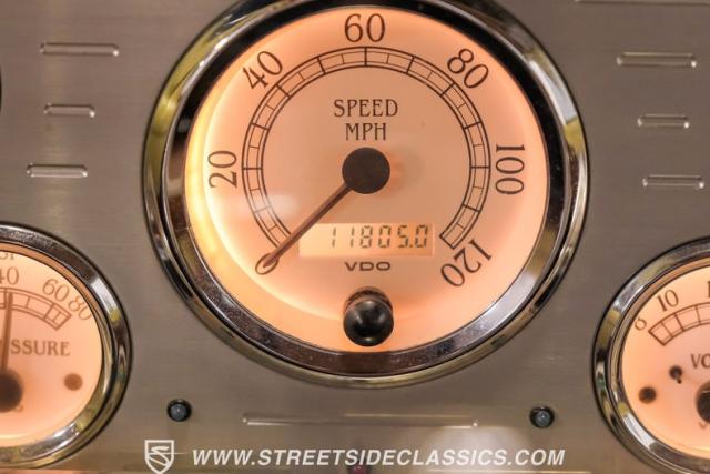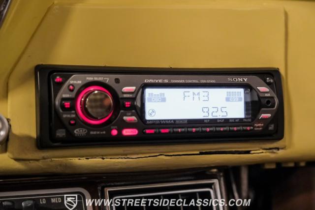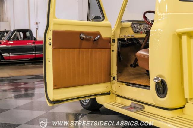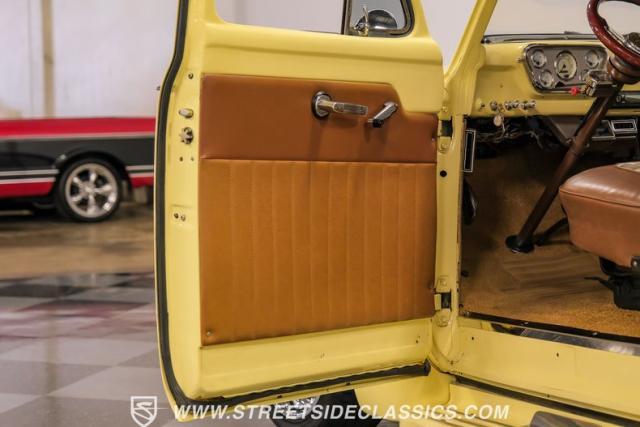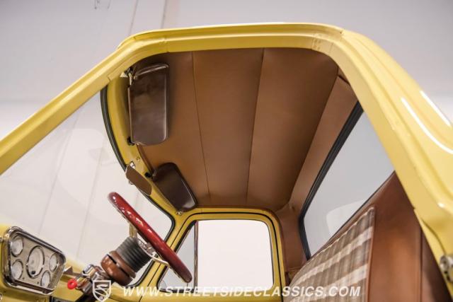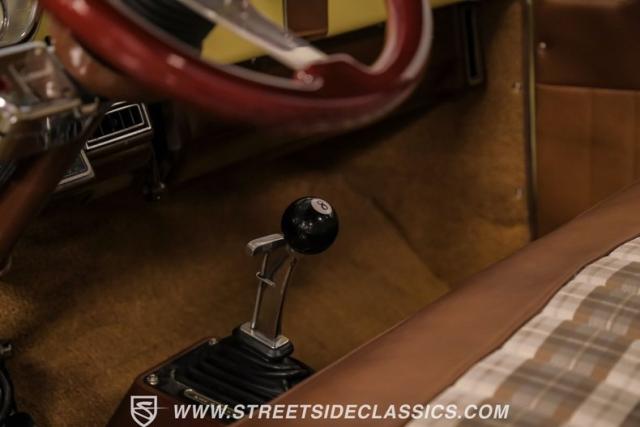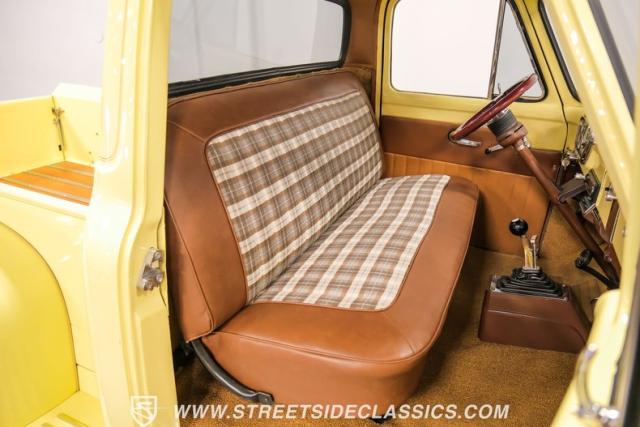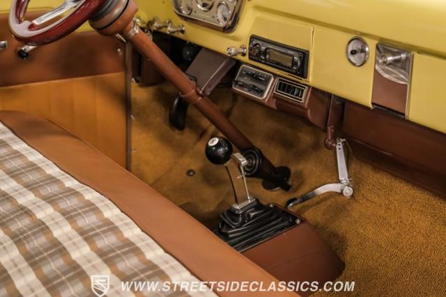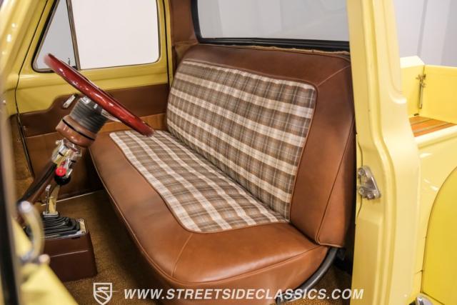 With an interior where functionality meets flair. The cabin boasts a handsome brown and plaid theme, with vinyl and cloth adorning the bench seat that invites you for a comfortable jaunt. The floor is laid with fresh carpets that complement VDO gauges and a Sony AM/FM/CD/AUX head unit, perfect for tuning into the classics or something a bit more modern. The B&M ratchet shifter peeks from the floor, a nod to the truck\'s robust capabilities without a whisper of complexity.