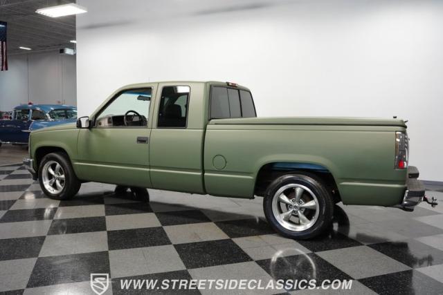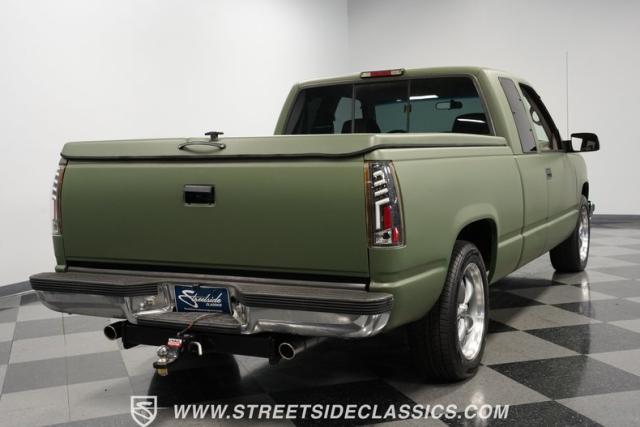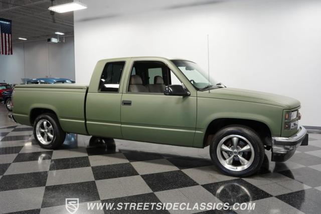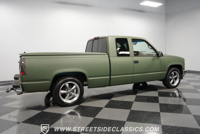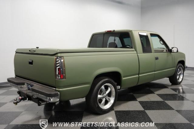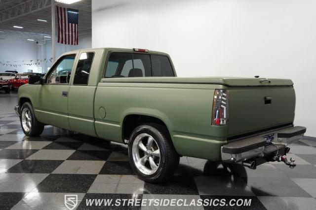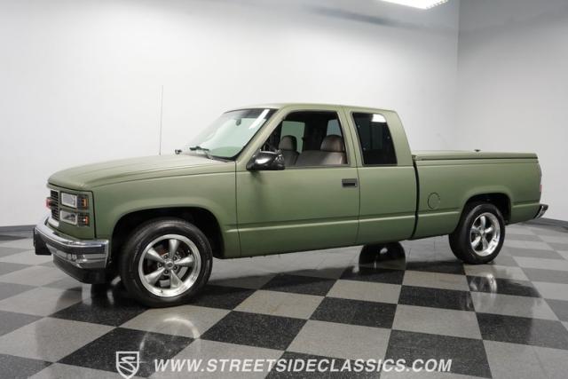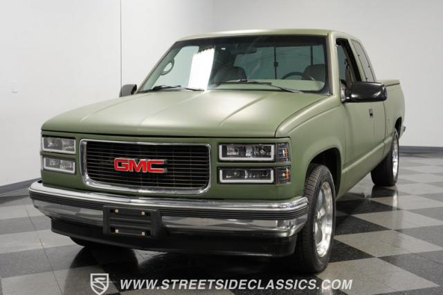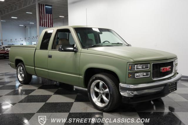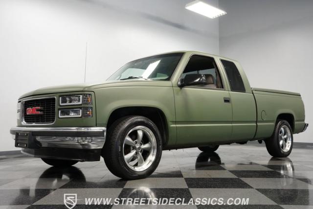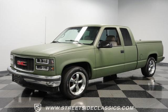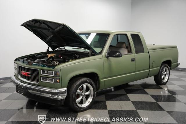 This 1995 GMC Sierra 1500 Extended Cab sports a bold matte green wrap, transforming its original dark green paintwork into a modern, military-inspired aesthetic. The truck\'s muscular stance is enhanced by 18\" American Racing wheels wrapped in meaty 245/55R18 tires. A bed cover adds practicality, while upgraded LED headlights and taillights bring a contemporary edge to this classic workhorse. The extended cab design offers extra versatility, perfect for hauling gear or accommodating passengers. The HD trailering package further bolsters this Sierra\'s workhorse credentials.