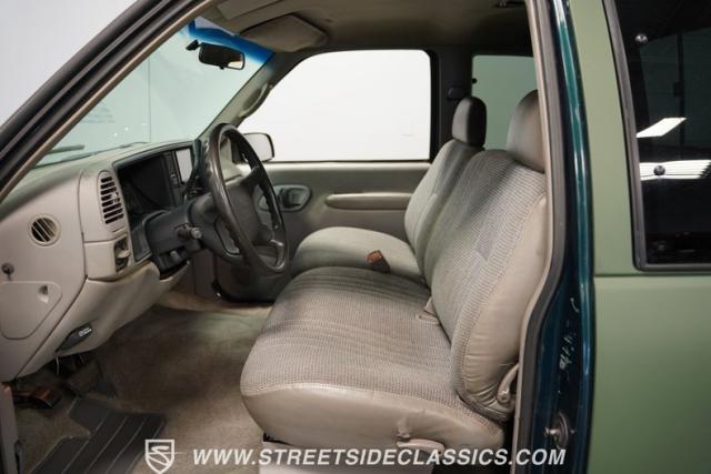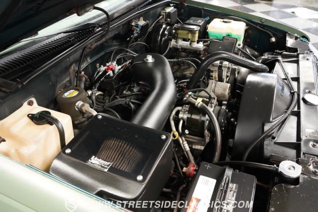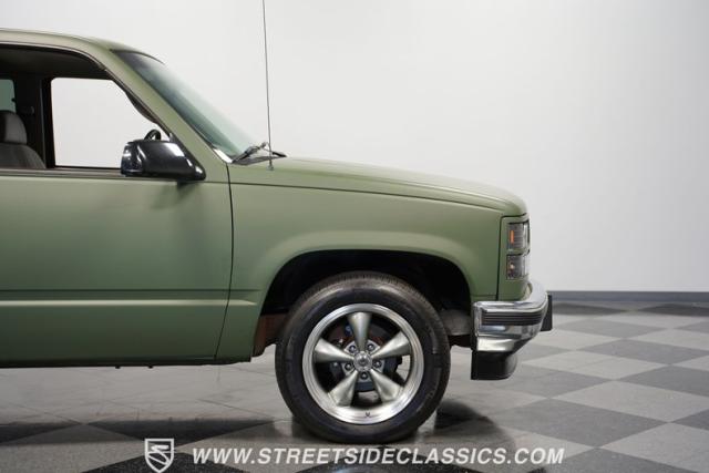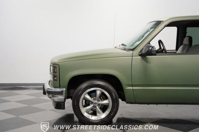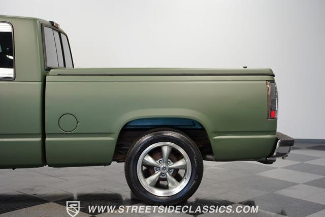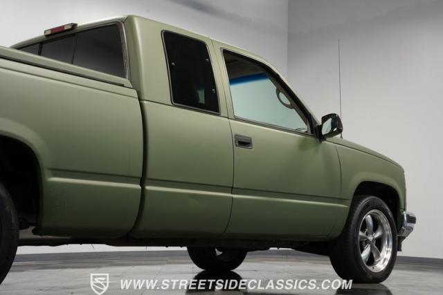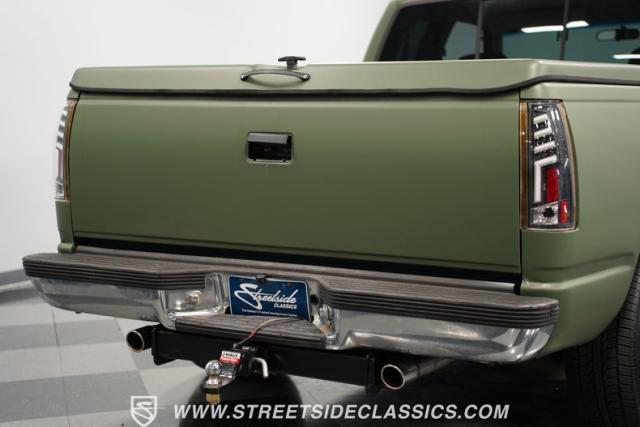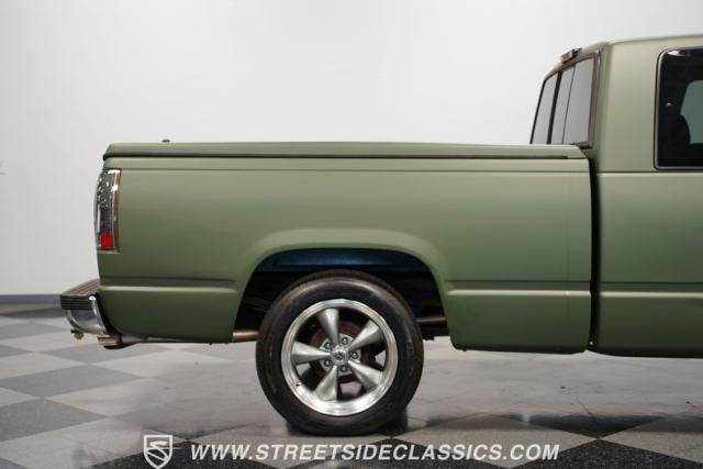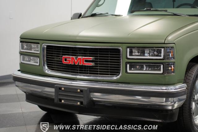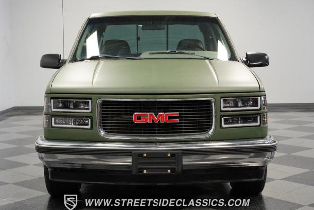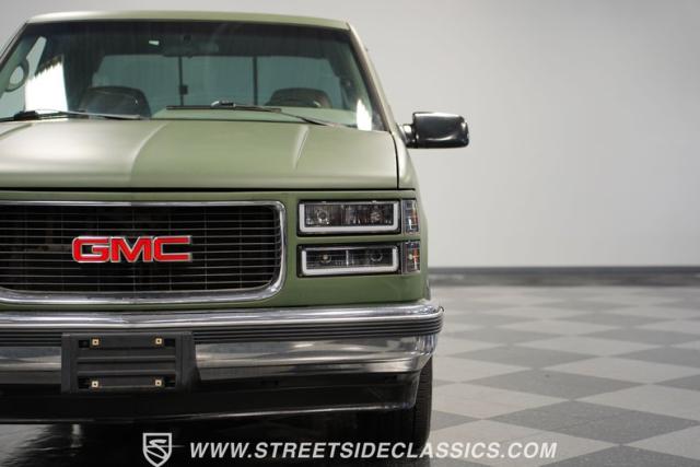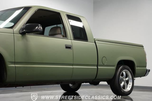 This 1995 GMC Sierra 1500 Extended Cab sports a bold matte green wrap, transforming its original dark green paintwork into a modern, military-inspired aesthetic. The truck\'s muscular stance is enhanced by 18\" American Racing wheels wrapped in meaty 245/55R18 tires. A bed cover adds practicality, while upgraded LED headlights and taillights bring a contemporary edge to this classic workhorse. The extended cab design offers extra versatility, perfect for hauling gear or accommodating passengers. The HD trailering package further bolsters this Sierra\'s workhorse credentials.