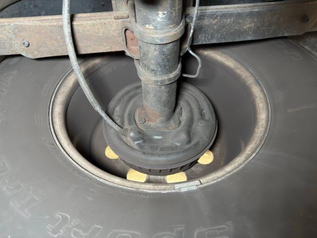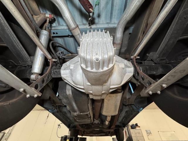 The rear continues the show with a mock quick change cover on the relatively clean underside. There\'s plenty of surface rust but conditions are dry, and the exhaust is newer according to our consignor and the single pipe travels through a stock style muffler which lets out two tailpipes leading to polished tips. Suspension consists of coil springs in front with a 3\" drop and leaf springs in the back.
