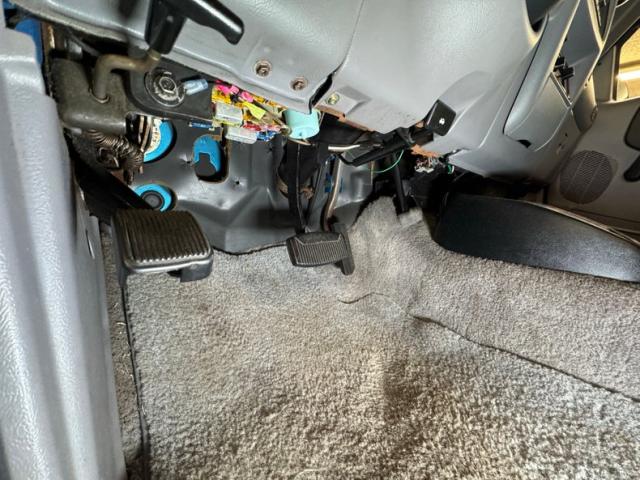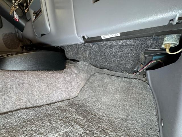 Standard Ford door panels greet us with patterns of gray and black plastic, a cloth insert, and carpeted kick panel and both are impeccably clean. Gray cloth buckets seats have 90\'s era graphics and the driver\'s seat shows a stain and small tear. A wood rimmed steering wheel leads to a wood trimmed dashboard with the most basic of gauges intended to prevent confusion for young buyers, no doubt. A Ford AM/FM/Cassette radio lives in the middle with an A/C panel below it. A huge tachometer is mounted to the dash and a cupholder has been added to the floor. There is no roll cage nor racing harness, just in case you\'re wondering.