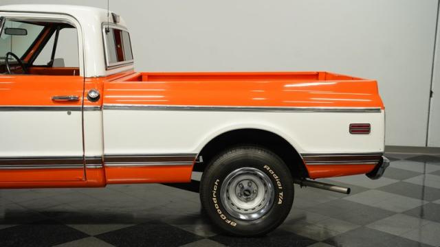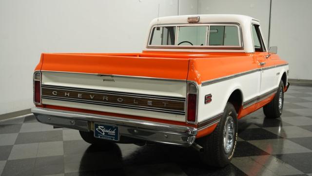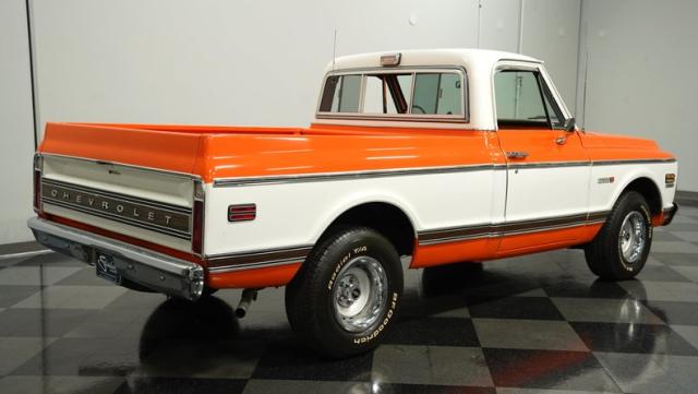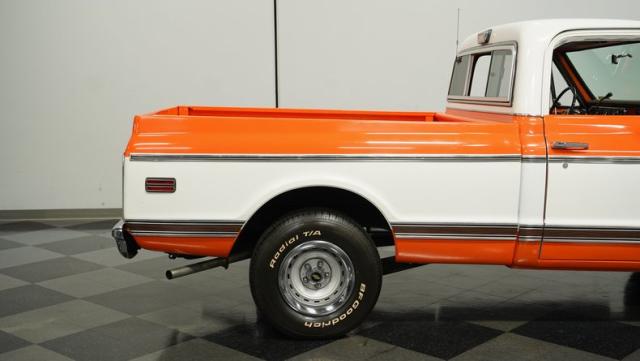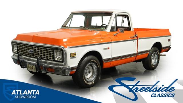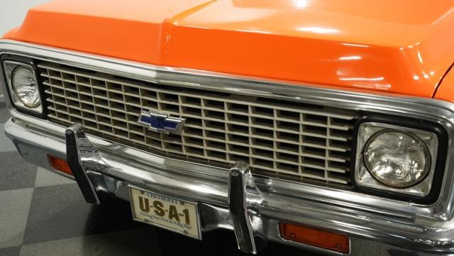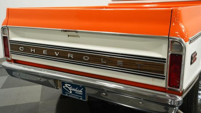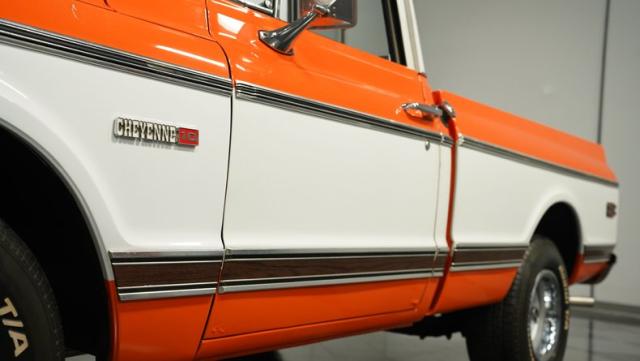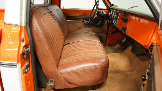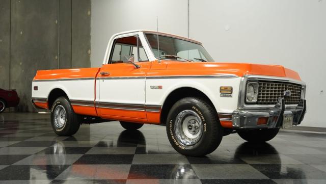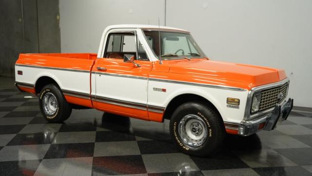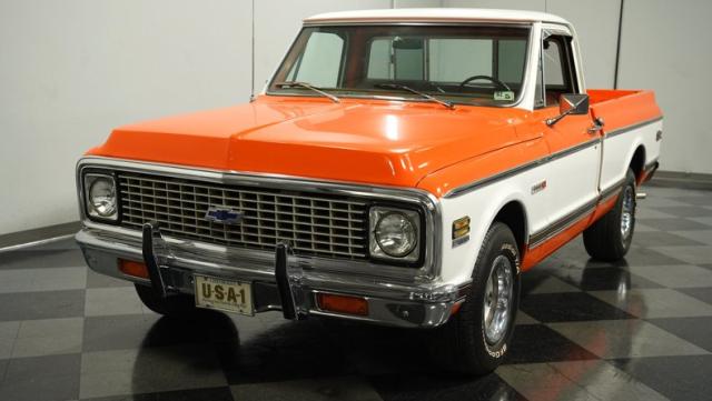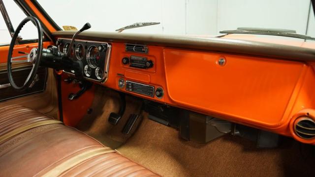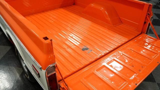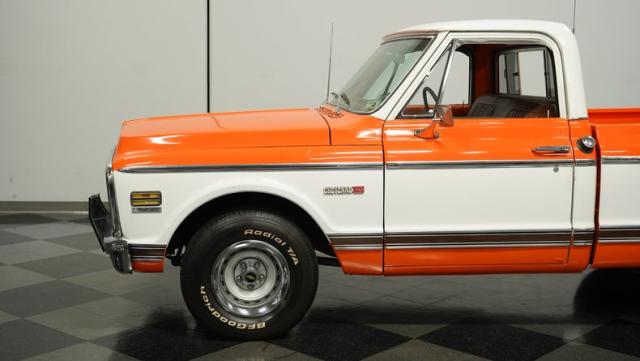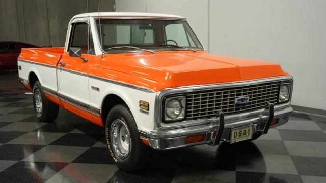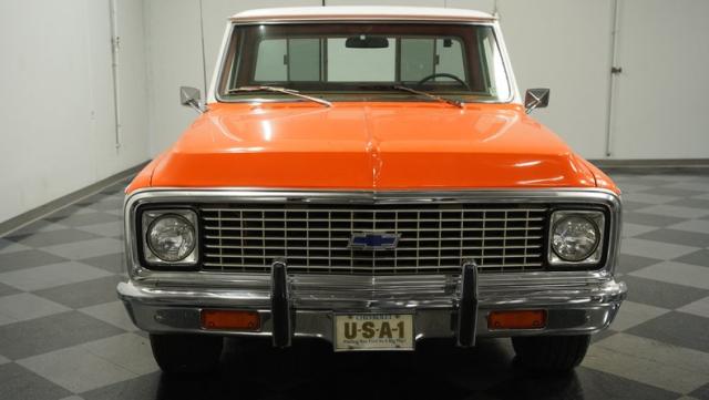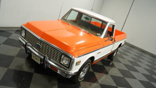 Catching eyes with its bold Orange and White exterior, this 1972 Chevrolet C10 Cheyenne brings the past into vivid relief, showcasing an era when trucks were as much about style as they were about utility. Its silhouette, marked by 15\" Rally wheels clad in 255/70R15 rubber, conveys a stance that\'s both assertive and classic. The two-tone paintwork, complemented by the sheen of chrome bumpers and the integrity of clear glass, frames a picture of a vehicle that\'s been cared for with a detail-oriented approach.
