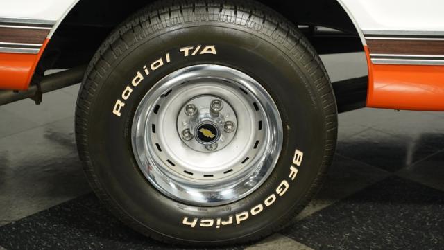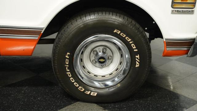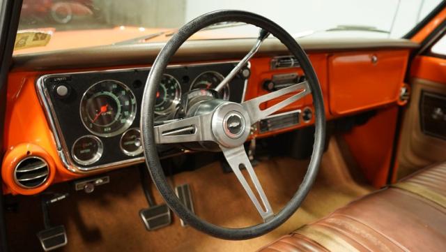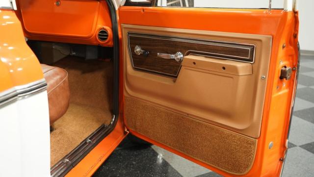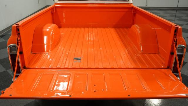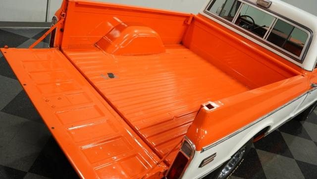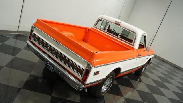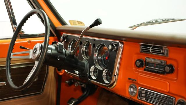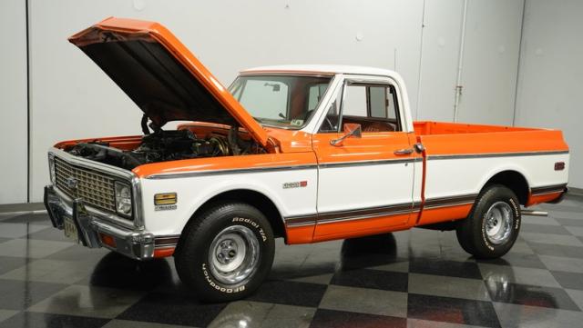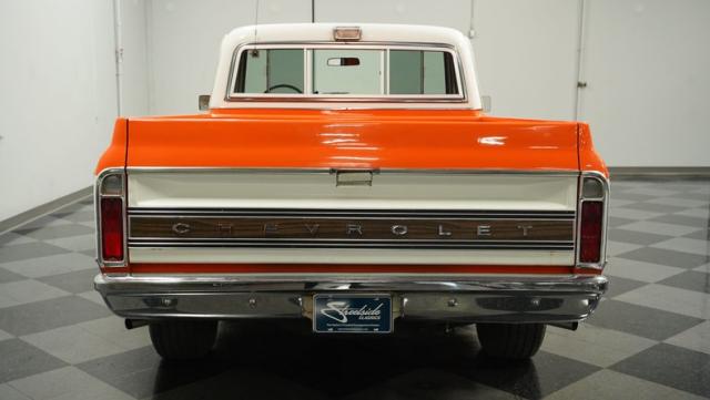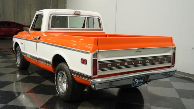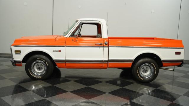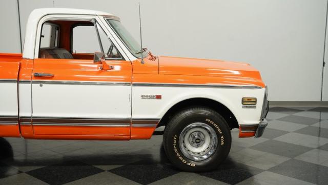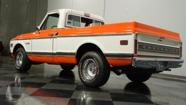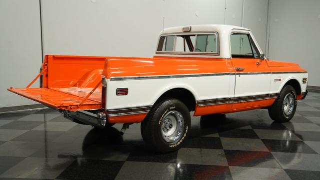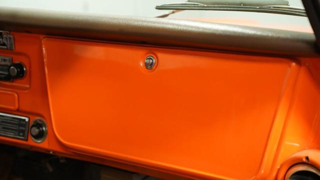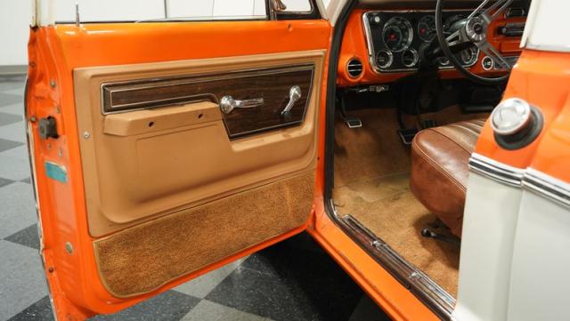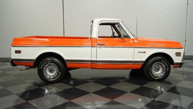 Catching eyes with its bold Orange and White exterior, this 1972 Chevrolet C10 Cheyenne brings the past into vivid relief, showcasing an era when trucks were as much about style as they were about utility. Its silhouette, marked by 15\" Rally wheels clad in 255/70R15 rubber, conveys a stance that\'s both assertive and classic. The two-tone paintwork, complemented by the sheen of chrome bumpers and the integrity of clear glass, frames a picture of a vehicle that\'s been cared for with a detail-oriented approach.