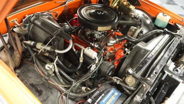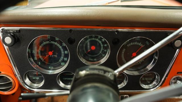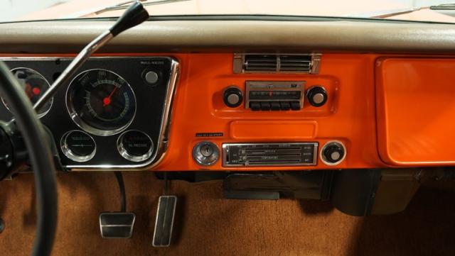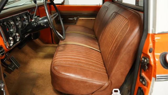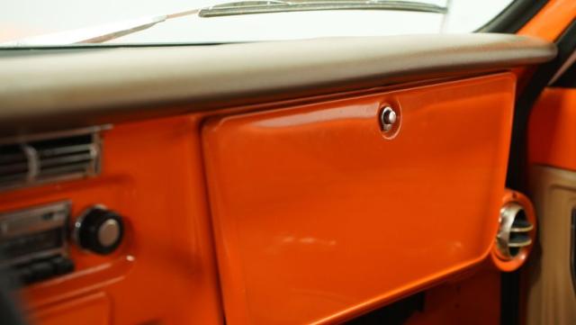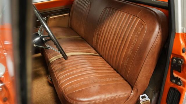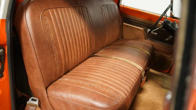 The tan interior weaves a tale of heritage and craftsmanship and blends comfort and function. It features a saddle vinyl bench seat, a full set of gauges on the dash, and a factory tachometer. You\'ll also find tilt steering, a column shifter, power steering, air conditioning, an AM/FM radio, and classic brown carpets, adding up to a cabin that\'s both inviting and practical.