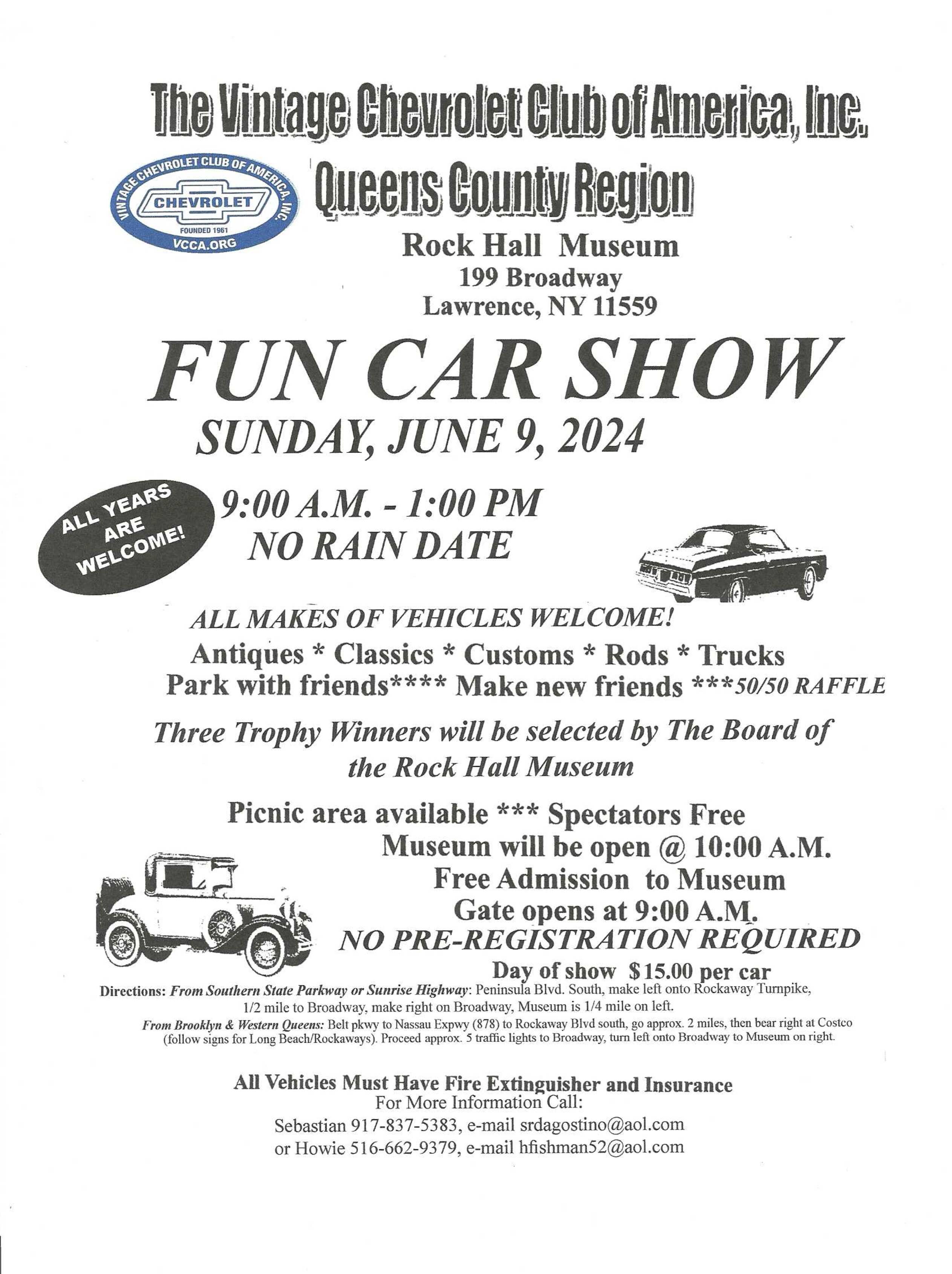Free Admission! Presented by the Vintage Chevrolet Club of America, Queens County Region. Car Show is open to any make of vehicle, including classics, antiques, customs, hot rods and trucks. Outdoor program. For vehicle registration and other show information, contact Sebastian at 917-837-5383, or Howard at 516-662-9379 and [email protected]. Day of show vehicle fee $15.00. No rain date.