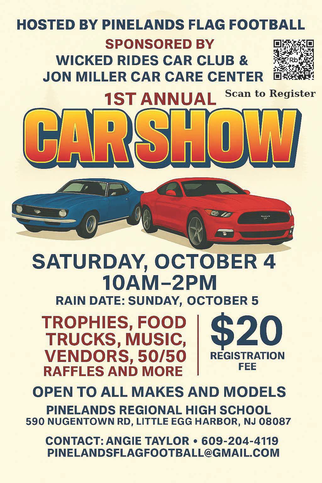 10am-2pm, rain date October 5. Open to all makes and models. Trophies, food trucks, music, vendors, 50/50 raffles and more!